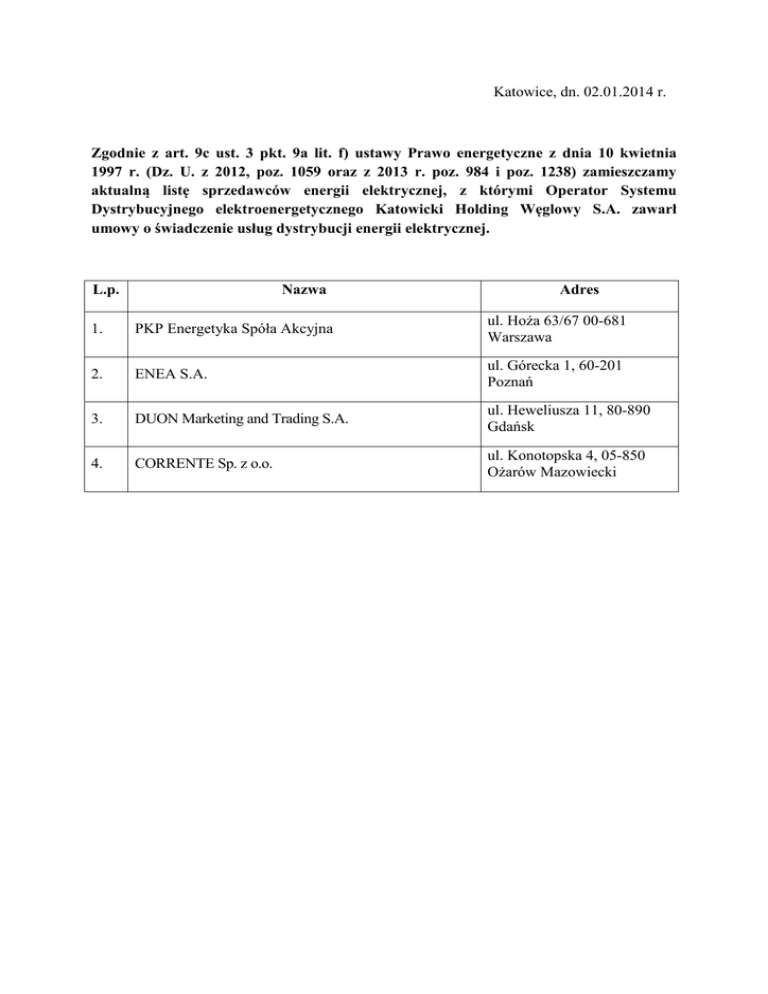 Katowice, dn. 02.01.2014 r. Zgodnie z art. 9c ust. 3 pkt. 9a lit. f) ustawy Prawo energetyczne z dnia 10 kwietnia 1997 r. (Dz. U. z 2012, poz. 1059 oraz z 2013 r. poz. 984 i poz. 1238) zamieszczamy aktualną listę sprzedawców energii elektrycznej, z którymi Operator Systemu Dystrybucyjnego elektroenergetycznego Katowicki Holding Węglowy S.A. zawarł umowy o świadczenie usług dystrybucji energii elektrycznej. L.p. Nazwa Adres 1. PKP Energetyka Spóła Akcyjna ul. Hoża 63/67 00-681 Warszawa 2. ENEA S.A. ul. Górecka 1, 60-201 Poznań 3. DUON Marketing and Trading S.A. ul. Heweliusza 11, 80-890 Gdańsk 4. CORRENTE Sp. z o.o. ul. Konotopska 4, 05-850 Ożarów Mazowiecki