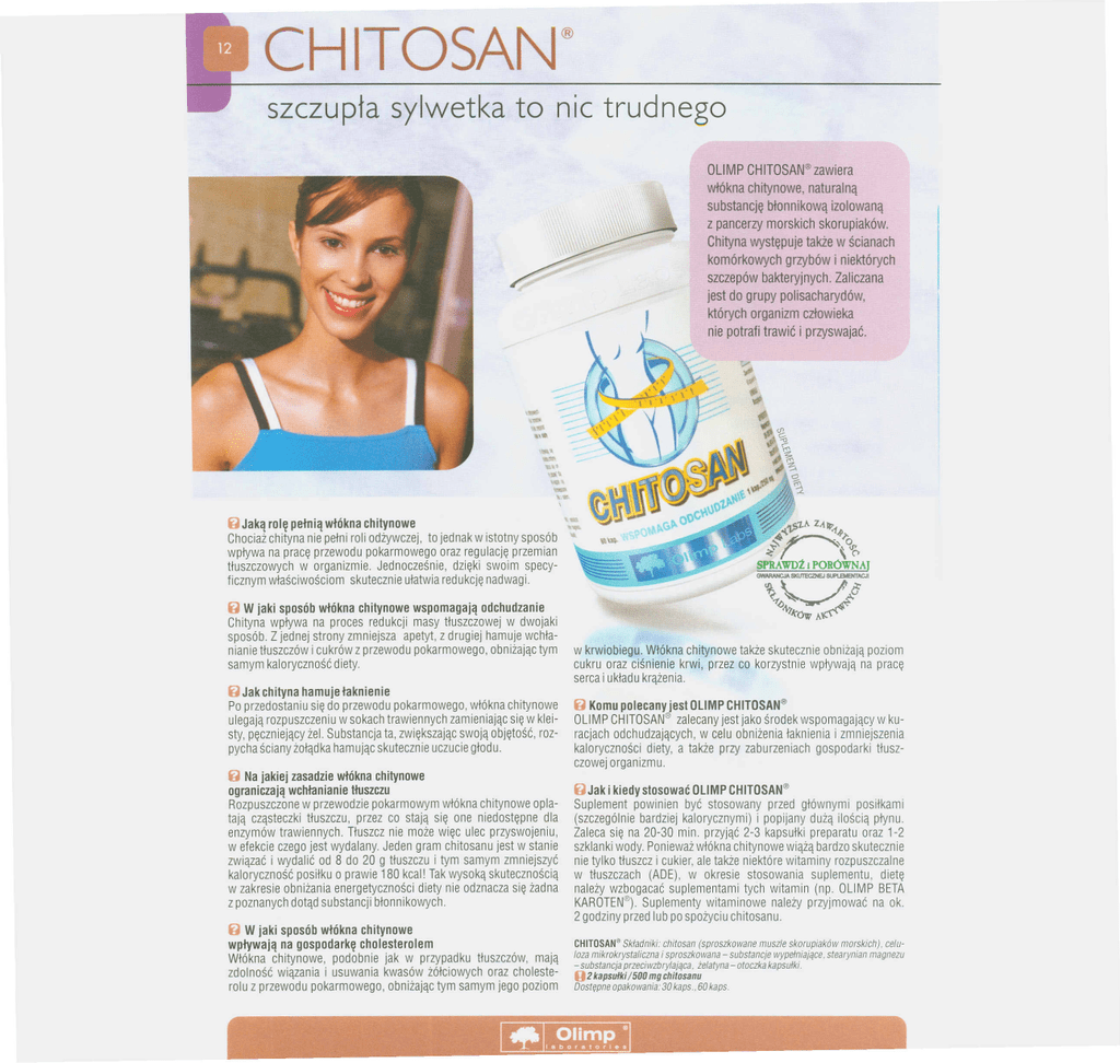 CHITOSAN® szczupła sylwetka to nic trudnego OLIMP CHITOSAN" zawiera włókna chitynowe, naturalną substancję błonnikową izolowaną z pancerzy morskich skorupiaków. Chityna występuje także w ścianach komórkowych grzybów i niektórych szczepów bakteryjnych. Zaliczana jest do grupy polisacharydów, których organizm człowieka nie potrafi trawić i przyswajać. ~Jaką rolę pełnią włókna chitynowe Chociaż chityna nie pełni roli odżywczej, to jednak w istotny sposób wpływa na pracę przewodu pokarmowego oraz regulację przemian tłuszczowych w organizmie. Jednocześnie, dzięki swoim specyficznym właściwościom skutecznie ułatwia redukcję nadwagi. ~ W jaki sposób włókna chitynowe wspomagają odchudzanie Chityna wpływa na proces redukcji masy tłuszczowej w dwojaki sposób. Z jednej strony zmniejsza apetyt, z drugiej hamuje wchłanianie tłuszczów i cukrów z przewodu pokarmowego, obniżając tym samym kaloryczność diety. ~ Jak chityna hamuje łaknienie Po przedostaniu się do przewodu pokarmowego, włókna chitynowe ulegają rozpuszczeniu w sokach trawiennych zamieniając się w kleisty, pęczniejący żel. Substancja ta, zwiększając swoją objętość, rozpycha ściany żołądka hamując skutecznie uczucie głodu. ~ Na jakiej zasadzie włókna chitynowe ograniczają wchłanianie tłuszczu Rozpuszczone w przewodzie pokarmowym włókna chitynowe oplatają cząsteczki tłuszczu, przez co stają się one niedostępne dla enzymów trawiennych. Tłuszcz nie może więc ulec przyswojeniu, w efekcie czego jest wydalany. Jeden gram chitosanu jest w stanie związać i wydalić od 8 do 20 g tłuszczu i tym samym zmniejszyć kaloryczność posiłku o prawie 180 kcal! Tak wysoką skutecznością w zakresie obniżania energetyczności diety nie odznacza się żadna z poznanych dotąd substancji błonnikowych. ~ W jaki sposób włókna chitynowe wpływają na gospodarkę cholesterolem Włókna chitynowe, podobnie jak w przypadku tłuszczów, mają zdolność wiązania i usuwania kwasów żółciowych oraz cholesterolu z przewodu pokarmowego, obniżając tym samym jego poziom w krwiobiegu. Włókna chitynowe także skutecznie obniżają poziom cukru oraz ciśnienie krwi, przez co korzystnie wpływają na pracę serca i układu krążenia. ~ Komu polecany jest OLIMP CHITOSAN" OLIMP CHITOSAN® zalecany jest jako środek wspomagający w kuracjach odchudzających, w celu obniżenia łaknienia i zmniejszenia kaloryczności diety, a także przy zaburzeniach gospodarki tłuszczowej organizmu. ~ Jak i kiedy stosować OLIMP CHITOSAN® Suplement powinien być stosowany przed głównymi posiłkami (szczególnie bardziej kalorycznymi) i popijany dużą ilością płynu. Zaleca się na 20-30 min. przyjąć 2-3 kapsułki preparatu oraz 1-2 szklanki wody. Ponieważ włókna chitynowe wiążą bardzo skutecznie nie tylko tłuszcz i cukier, ale także niektóre witaminy rozpuszczalne w tłuszczach (ADE), w okresie stosowania suplementu, dietę należy wzbogacać suplementami tych witamin (np. OLIMP BETA KAROTEN"). Suplementy witaminowe należy przyjmować na ok. 2 godziny przed lub po spożyciu chitosanu. CHITOSAN\!l Składniki: chitosan (sproszkowane muszle skorupiaków morskich), celuloza mikrokrystaliczna i sproszkowana - substancje wypełniające. stearynian magnezu - substancja przeciwlbryJająca, żelatyna - otoczka kapsułki. kapsulki/500 mg chi/osanu Dostępne opakowania: 30 kaps .. 60 kaps 02
