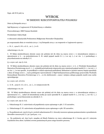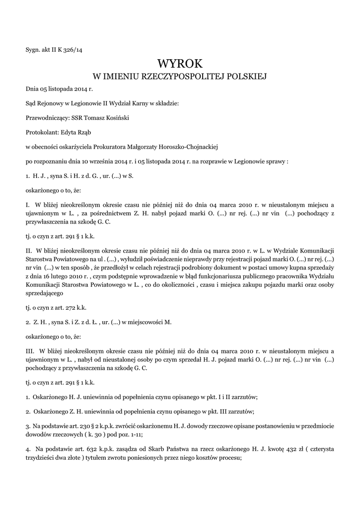 Sygn. akt II K 326/14 WYROK W IMIENIU RZECZYPOSPOLITEJ POLSKIEJ Dnia 05 listopada 2014 r. Sąd Rejonowy w Legionowie II Wydział Karny w składzie: Przewodniczący: SSR Tomasz Kosiński Protokolant: Edyta Rząb w obecności oskarżyciela Prokuratora Małgorzaty Horoszko-Chojnackiej po rozpoznaniu dnia 10 września 2014 r. i 05 listopada 2014 r. na rozprawie w Legionowie sprawy : 1. H. J. , syna S. i H. z d. G. , ur. (...) w S. oskarżonego o to, że: I. W bliżej nieokreślonym okresie czasu nie później niż do dnia 04 marca 2010 r. w nieustalonym miejscu a ujawnionym w L. , za pośrednictwem Z. H. nabył pojazd marki O. (...) nr rej. (...) nr vin (...) pochodzący z przywłaszczenia na szkodę G. C. tj. o czyn z art. 291 § 1 k.k. II. W bliżej nieokreślonym okresie czasu nie później niż do dnia 04 marca 2010 r. w L. w Wydziale Komunikacji Starostwa Powiatowego na ul . (...) , wyłudził poświadczenie nieprawdy przy rejestracji pojazd marki O. (...) nr rej. (...) nr vin (...) w ten sposób , że przedłożył w celach rejestracji podrobiony dokument w postaci umowy kupna sprzedaży z dnia 16 lutego 2010 r. , czym podstępnie wprowadzenie w błąd funkcjonariusza publicznego pracownika Wydziału Komunikacji Starostwa Powiatowego w L. , co do okoliczności , czasu i miejsca zakupu pojazdu marki oraz osoby sprzedającego tj. o czyn z art. 272 k.k. 2. Z. H. , syna S. i Z. z d. Ł. , ur. (...) w miejscowości M. oskarżonego o to, że: III. W bliżej nieokreślonym okresie czasu nie później niż do dnia 04 marca 2010 r. w nieustalonym miejscu a ujawnionym w L. , nabył od nieustalonej osoby po czym sprzedał H. J. pojazd marki O. (...) nr rej. (...) nr vin (...) pochodzący z przywłaszczenia na szkodę G. C. tj. o czyn z art. 291 § 1 k.k. 1. Oskarżonego H. J. uniewinnia od popełnienia czynu opisanego w pkt. I i II zarzutów; 2. Oskarżonego Z. H. uniewinnia od popełnienia czynu opisanego w pkt. III zarzutów; 3. Na podstawie art. 230 § 2 k.p.k. zwrócić oskarżonemu H. J. dowody rzeczowe opisane postanowieniu w przedmiocie dowodów rzeczowych ( k. 30 ) pod poz. 1-11; 4. Na podstawie art. 632 k.p.k. zasądza od Skarb Państwa na rzecz oskarżonego H. J. kwotę 432 zł ( czterysta trzydzieści dwa złote ) tytułem zwrotu poniesionych przez niego kosztów procesu; 5. Na podstawie art. 632 k.p.k. zasądza od Skarb Państwa na rzecz Z. H. kwotę 432 zł ( czterysta trzydzieści dwa złote ) tytułem zwrotu poniesionych przez niego kosztów procesu; 6. Na podstawie art. 632 k.p.k. koszty postępowania ponosi Skarbu Państwa. Sygn. akt II K 326/14 UZASADNIENIE Na podstawie całokształtu okoliczności ujawnionych w toku rozprawy głównej Sąd ustalił następujący stan faktyczny: W listopadzie 2009 r. G. C. oddał do sprzedaży swój samochód marki O. (...) nr rej. (...) M. C. prowadzącego salon sprzedaży samochodów (...) w miejscowi M. we W. . G. C. przekazał M. C. pełną dokumentację tego samochodu w tym dowód rejestracyjny i świadectwo własności oraz 2 komplety kluczyków . Samochód ten miał zostać sprzedany za kwotę ok. 5000 Euro jako cenę wywoławczą . Po pewnym czasie G. C. dowiedział się od M. C. że samochód ten został sprzedany nie otrzymał jednak za niego żadnych pieniędzy . Samochód O. (...) nr rej. (...) M. C. przekazał do autokomisu w B. w Niemczech . Na początku 2010 r. oskarżony H. J. podjął decyzję o zakupie nowego , większego samochodu , gdyż samochód który dotychczas użytkował był za mały na potrzeby jego rodziny. Oskarżony H. J. postanowił sprowadzić samochód z zagranicy . W tym celu skontaktował się z mieszającym w S. znajomym swojego ojca oskarżonym Z. H. który zajmował się sprowadzaniem samochodów z Niemiec wobec faktu iż wcześniej pracował on w salonie samochodowym w Niemczech i zna język niemiecki . Oskarżony Z. H. przesłał drogą e-mailową oskarżonemu H. J. ogłoszenia dotyczące nabycia pojazdów które znalazł na stronie internetowej M..de. . Oskarżony H. J. z przesłanych mu ofert wybrał samochód marki O. (...) nr rej. (...) który był wystawiony do sprzedaży w jednym z komisów samochodowych w B. w Niemczech . Następnie w lutym 2010 r. oskarżony H. J. przyjechał do S. gdzie przekazał pieniądze w kwocie 6000 EURO z których część otrzymał od swojego ojca S. J. oskarżonemu Z. H. na zakup tego samochodu . Oskarżony Z. H. po otrzymaniu tych pieniędzy pojechało B. gdzie w autokomisie był wystawiony do sprzedaży samochód marki O. (...) nr rej. (...) . W dniu 16 lutego 2010 r. przed zakupem tego samochodu oskarżony Z. H. udał się z właścicielem tego autokomisu z tym samochodem do najbliższej stacji (...) celem sprawdzenia stanu nadwozia , wiarygodności numerów VIN , stanu licznika oraz stanu technicznego tego pojazdu . Po jeździe próbnej tym samochodem oskarżony F. H. podjął decyzje o zakupie samochodu marki O. (...) nr rej. (...). Po powrocie do komisu samochodowego jego właściciel skontaktował się z osoba która miała być właścicielem tego samochodu , która następnie podpisała umowę sprzedaży tego samochodu jako G. C.. Oskarżony Z. H. po zapłaceniu za ten samochód kwoty 6000 EURO udał się niemieckiego wydziału komunikacji celem przerejestrowania tego samochodu . Podczas czynności związanych z rejestracją tego samochodu został on sprawdzony pod względem czy nie jest kradziony , następnie zostały wydane niemieckie tablice rejestracyjne i wystawiony niemiecki dowód rejestracyjny . Po przyjeździe oskarżonego F. H. tym samochodem O. (...) do S. przekazał on ten samochód wraz z pełną dokumentacją oraz z dwoma oryginalnymi kluczykami oskarżonemu H. J. . Oskarżony H. J. wypełnił przekazaną mu przez oskarżonego Z. H. umowę kupna tego samochodu podpisując się na niej i wpisując datę 16 lutego 2010 r. . W dniu 04 marca 2010 r. oskarżony H. J. udał się do wydziału komunikacji Starostwa Powiatowego w L. celem zarejestrowania sa