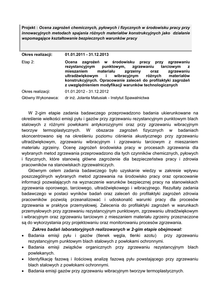 Projekt : Ocena zagrożeń chemicznych, pyłowych i fizycznych w środowisku pracy przy innowacyjnych metodach spajania różnych materiałów konstrukcyjnych jako działanie wspomagające kształtowanie bezpiecznych warunków pracy Okres realizacji: 01.01.2011 - 31.12.2013 Etap 2: Ocena zagrożeń w środowisku pracy przy zgrzewaniu rezystancyjnym punktowym, zgrzewaniu tarciowym z mieszaniem materiału zgrzeiny oraz zgrzewaniu ultradźwiękowym i wibracyjnym różnych materiałów konstrukcyjnych. Opracowanie zaleceń do profilaktyki zagrożeń z uwzględnieniem modyfikacji warunków technologicznych Okres realizacji: 01.01.2012 - 31.12.2012 Główny Wykonawca: dr inż. Jolanta Matusiak - Instytut Spawalnictwa W 2-gim etapie zadania badawczego przeprowadzono badania ukierunkowane na określenie wielkości emisji pyłu i gazów przy zgrzewaniu rezystancyjnym punktowym blach stalowych z różnymi powłokami antykorozyjnymi oraz przy zgrzewaniu wibracyjnym tworzyw termoplastycznych. W obszarze zagrożeń fizycznych w badaniach skoncentrowano się na określeniu poziomu ciśnienia akustycznego przy zgrzewaniu ultradźwiękowym, zgrzewaniu wibracyjnym i zgrzewaniu tarciowym z mieszaniem materiału zgrzeiny. Ocenę zagrożeń środowiska pracy w procesach zgrzewania dla wybranych metod zgrzewania przeprowadzono dla tych czynników chemicznych, pyłowych i fizycznych, które stanowią główne zagrożenie dla bezpieczeństwa pracy i zdrowia pracowników na stanowiskach zgrzewalniczych. Głównym celem zadania badawczego było uzyskanie wiedzy w zakresie wpływu poszczególnych wybranych metod zgrzewania na środowisko pracy oraz opracowanie informacji pozwalających na wyznaczenie warunków bezpiecznej pracy na stanowiskach zgrzewania oporowego, tarciowego, ultradźwiękowego i wibracyjnego. Rezultaty zadania badawczego w postaci wyników badań oraz zaleceń do profilaktyki zagrożeń zdrowia pracowników pozwolą przeanalizować i udoskonalić warunki pracy dla procesów zgrzewania w praktyce przemysłowej. Zalecenia do profilaktyki zagrożeń w warunkach przemysłowych przy zgrzewaniu rezystancyjnym punktowym, zgrzewaniu ultradźwiękowym i wibracyjnym oraz zgrzewaniu tarciowym z mieszaniem materiału zgrzeiny przeznaczone są do wykorzystania przy projektowaniu oraz monitorowaniu procesów zgrzewania. Zakres badań laboratoryjnych realizowanych w 2-gim etapie obejmował: Badania emisji pyłu i gazów (tlenek węgla, tlenki azotu) przy zgrzewaniu rezystancyjnym punktowym blach stalowych z powłokami ochronnymi. Badania emisji związków organicznych przy zgrzewaniu rezystancyjnym blach powlekanych. Identyfikację fazową i ilościową analizę fazową pyłu powstającego przy zgrzewaniu blach stalowych z powłokami ochronnymi. Badania emisji gazów przy zgrzewaniu wibracyjnym tworzyw termoplastycznych. Badania poziomu ciśnienia akustycznego w 1/3 oktawowych pasmach częstotliwości w zakresie hałasu ultradźwiękowego przy zgrzewaniu ultradźwiękowym różnych materiałów (miedź, stopy aluminium). Badania poziomu ciśnienia akustycznego w zakresie hałasu słyszalnego przy zgrzewaniu ultradźwiękowym różnych materiałów metalowych. Badania poziomu ciśnienia akustycznego w zakresie hałasu słyszalnego przy zgrzewaniu wibracyjnym tworzyw termoplastycznych. Badania poziomu ciśnienia akustycznego w zakresie hałasu słyszalnego przy zgrzewaniu metodą FSW. Badania przeprowadzono na stanowiskach specjalistycznych w Instytucie Spawalnictwa (Fot 1-2). Analiza i ocena zagrożeń chemicznych i pyłowych przy zgrzewaniu rezystancyjnym punktowym blach stalowych z powłokami wykazała m.in., że: wzrost prądu zgrzewania powoduje zwiększoną emisję pyłu całkowitego oraz tlenków azotu i tlenku węgla przy zgrzewaniu blach tej samej grubości i przy zachowaniu tych samych wartości czasu zgrzewania i siły docisku, rodzaj powłoki ochronnej zgrzewanego materiału wpływa na wielkość emisji pyłu całkowitego, tlenku węgla i tlenków azotu, zwiększenie grubości zgrzewanych blach stalowych z powłokami ochronnymi powoduje zwiększenie emisji pyłu całkowitego, tlenku węgla i tlenków azotu, głównymi składnikami chemicznymi pyłu powstającego przy zgrzewaniu rezystancyjnym blach stalowych z powłokami dwuwarstwowymi (powłoka cynkowa+powłoka organiczna) jest Zn metaliczny, Mn metaliczny, wistyt FeO oraz ZnO, magnetyt Fe3O4, hematyt α-Fe2O3 , rodzaj powłoki ochronnej dwuwarstwowej zgrzewanego materiału wpływa na wielkość emisji związków organicznych, tj.: BTEX, fenolu i krezoli oraz WWA. Analiza i ocena zagrożeń chemicznych przy zgrzewaniu wibracyjnym tworzyw termoplastycznych wykazała m.in., że: wielkość emisji tlenków azotu i tlenku węgla jest zależna od wartości siły docisku; wzrost siły docisku powoduje wzrost wielkości emisji NOx i CO. wielkość emisji zanieczyszczeń gazowych przy zgrzewaniu wibracyjnym tworzyw rośnie ze wzrostem wielkości amplitudy drgań przy tej samej wartości siły docisku, rodzaj zgrzewanego tworzywa termoplastycznego nie wpływa w sposób jednoznaczny na wielkość emisji tlenków azotu i tlenku węgla. Badania poziomu ciśnienia akustycznego w 1/3 oktawowych pasmach częstotliwości w zakresie hałasu ultradźwiękowego oraz badania poziomu ciśnienia akustycznego w zakresie hałasu słyszalnego przy zgrzewaniu ultradźwiękowym różnych materiałów metalowych wykazały, że: poziom ciśnienia akustycznego w 1/3 oktawowych pasmach częstotliwości w zakresie hałasu ultradźwiękowego przy procesie zgrzewania ultradźwiękowego metali jest zależny od rodzaju łączonych materiałów, najwyższy poziom równoważny ciśnienia akustycznego w dominującym 1/3 oktawowym paśmie częstotliwości hałasu ultradźwiękowego - 20 kHz przy pracy zgrzewarki z obudową, występuje przed zgrzewarką w miejscu pracy operatora urządzenia, w odległości 0,5 m od zgrzewarki. zastosowanie obudowy wpływa na obniżenie poziomów ciśnieni