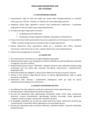 REGULAMIN ROZGRYWEK ASG ZSP TYCHOWO § 1 POSTANOWIENIA OGÓLNE 1. Organizatorem zajęć Air Soft Gun (ASG) jest Zespół Szkół Ponagimnazjalnych w Tychowie mieszcząca się w 78-220 - Tychowo, ul. Parkowa 20 zwana dalej Organizatorem. 2. Integralną częścią tego regulaminu stanowi druk oświadczenia opiekunów i uczestników rozgrywek Air Soft Gun (ASG) zwany dalej Oświadczeniem. 3. Do zajęć przystąpić mogą chętni uczniowie: za zgodą prawnych opiekunów; akceptujący niniejszy regulamin składając swój podpis na Oświadczeniu. 4. Do gry może służyć tylko sprzęt dostarczony przez organizatora schronowany do max prędkości ~410fps. Używanie innego sprzętu dozwolone tylko za zgodą organizatora. 5. Zestaw dostarczony przez organizatora składa się z: Karabinka ASG, hełmu, okularów ochronnych, maski ochronnej na twarz, rękawic taktycznych zwany dalej Zestawem. 6. Gracze muszą występować w mundurze. § 2 ZASADY GRY 1. Gra rozpoczynana i kończona jest na sygnał dźwiękowy (gwizdek). 2. Wyeliminowanie gracza z gry następuje po trafieniu kulką BB, po własnej deklaracji uczestnika o rezygnacji z gry przez trafienie. 3. Wyeliminowany gracz krzyczy "TRAFIONY" następnie opuszcza pole najkrótszą możliwą drogą zachowując przy tym jedną rękę uniesioną nad głową, opuszczonym i zabezpieczonym karabinkiem ASG. 4. Minimalna bezpieczna odległość, z której wolno oddać strzał do gracza wynosi 5 metrów. 5. Zmiany w tym punkcie mogą dokonać gracze na własną odpowiedzialność, tylko za zgodą wszystkich uczestników. 6. Atakowanie osób, zwierząt i przedmiotów niebędących celem gry bądź też graczy wyeliminowanych kategorycznie zabronione. § 3 ZASADY ZACHOWANIA NA POLU 1. Gra odbywać się może wyłącznie na polu gry wyznaczonym przez organizatora gry. 2. Granicę pola gry i strefę bezpieczną wyznacza organizator. 3. Na polu gry obowiązuje zakaz agresywnego zachowania wobec innych osób, popychania, uderzania, rzucania przedmiotami, agresywnego kontaktu fizycznego. Osoby agresywne i wulgarne zostaną usunięte z pola gry bez możliwości powrotu. 4. W przypadku pojawienia się na polu gry osoby postronnej należy natychmiast przerwać grę i poinformować o zaistniałym fakcie organizatora oraz pozostałych graczy. 5. Na polu gry obowiązuje zakaz niszczenia roślinności, wzniecania ognisk i używania materiałów pirotechnicznych. 6. Osoby, które chcą robić zdjęcia w strefie gry muszą poinformować o tym fakcie organizatora oraz mieć założone okulary lub gogle ochronne, kamizelkę ostrzegawczą - ponoszą również ryzyko, że przypadkowy strzał kulki BB może uszkodzić sprzęt fotograficzny/video. Robią to na własną odpowiedzialność i nie będą w przypadku uszkodzenia sprzętu wnosić wobec organizatora żadnych roszczeń. § 4 UCZESTNICY ROZGRYWKI 1. Użytkownik ponosi pełną odpowiedzialność za szkody wyrządzone w wyniku użytkowania karabinku ASG. 2. Użytkownik oświadcza, że otrzymał kompletny wolny od wad Zestaw do gry i nie ma, co do niego żadnych zastrzeżeń. 3. Przed rozpoczęciem gry każdy z uczestników zostaje przeszkolony w zakresie bezpieczeństwa i ma obowiązek stosowania się do wszelkich zasad i zaleceń organizatorów. Jednocześnie jest świadomy zagrożeń wynikających z użytkowania Karabinku ASG. 4. Każdy gracz przebywający na polu gry zobligowany jest do noszenia Zestawu ochronnego. W przypadku pojawienia się na polu gry osoby łamiącej postanowienie tego punktu regulaminu, należy natychmiast przerwać grę i poinformować o zaistniałym fakcie organizatora. Osoby niestosujące się do wymogu noszenia Zestawu ochronnego zostaną usunięte z pola gry bez możliwości powrotu do gry. 5. Uczestnik rozgrywki zobligowany jest do informowania organizatora o wszelkich nieprawidłowościach związanych z działaniem zestawu do gry. 6. Osoby uczestniczące w grze, po jej zakończeniu są zobowiązane do zwrotu wypożyczonego sprzętu. W przypadku jego zagubienia lub zniszczenia są zobowiązane do zapłacenia kosztów zakupu sprzętu. Punkt ten nie dotyczy usterek wywołanych prawidłowym użytkowaniem sprzętu. 7. Osoby, które złamią którykolwiek z punktów regulaminu, w szczególności punkty odnoszące się do bezpieczeństwa innych ludzi lub zwierząt zostaną natychmiast wydaleni z pola gry, bez możliwości powrotu do gry. 8. Każdy gracz jest zobowiązany do używania kulek BB dostarczonych przez Organizatora. Używanie innych kulek tylko za zgodą Organizatora. § 5 POSTANOWIENIA KOŃCOWE 1. Organizatorzy nie ponoszą jakiejkolwiek odpowiedzialności za wszelkie skutki, wypadki, uszczerbki na zdrowiu, urazy emocjonalne, utratę życia, wszelkie szkody materialne wynikające z udziału w grach i nieprzestrzegania powyższego regulaminu. 2. Do gry może przystąpić osoba, która zapoznała się niniejszym REGULAMINEM ROZGRYWEK Air Soft Gun, została przeszkolona w zakresie bezpieczeństwa, obsługi sprzętu oraz podpisała stosowne OŚWIADCZENIE UCZESTNIKA ROZGRYWEK Air Soft Gun. Z regulaminem zapoznałem się i akceptuję wszystkie jego postanowienia: Opiekun prawny: ............................................ Uczeń: ............................................ Data: ............................................ ............................................
