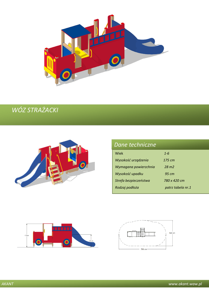 WÓZ STRAŻACKI Dane techniczne Wiek 1-6 Wysokość urządzenia 175 cm Wymagana powierzchnia 28 m2 Wysokość upadku 95 cm Strefa bezpieczeństwa 780 x 420 cm Rodzaj podłoża AKANT patrz tabela nr.1 www.akant.waw.pl