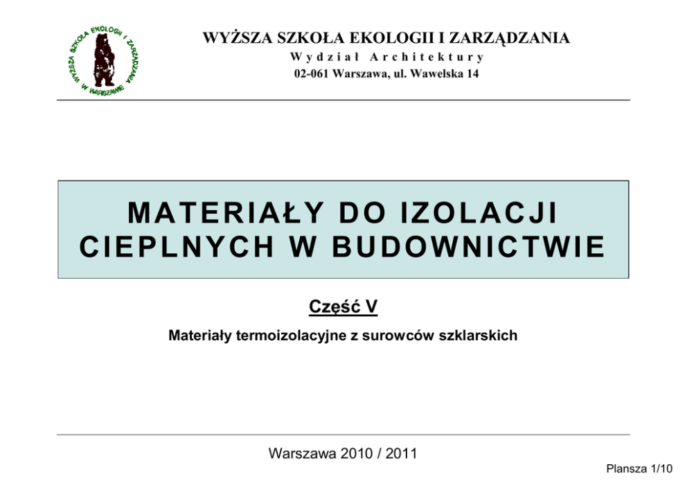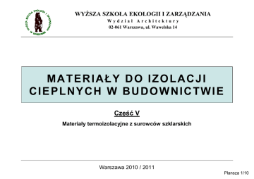 WYŻSZA SZKOŁA EKOLOGII I ZARZĄDZANIA Wydział Architektury 02-061 Warszawa, ul. Wawelska 14 MATERIAŁY DO IZOLACJI CIEPLNYCH W BUDOWNICTWIE Część V Materiały termoizolacyjne z surowców szklarskich Warszawa 2010 / 2011 Plansza 1/10 MATERIAŁY TERMOIZOLACYJNE Z SUROWCÓW SZKLARSKICH (1) Szkłem nazywa się bezpostaciową substancję otrzymywaną ze stopionych surowców mineralnych, które następnie zostają przechłodzone w taki sposób, że nie następuje krystalizacja składników. Jako surowiec do produkcji szkła budowlanego stosuje się piasek kwarcowy (SiO2) i dodatki: węglan sodu (Na2CO3), węglan wapnia (CaCO3), związki baru i ołowiu (jako topniki). To mineralne tworzywo występuje w budownictwie w postaci termoizolacyjnych wyrobów z elastycznych włókien szklanych, sprężystego szkła piankowego oraz zespolonych szyb jedno- lub wielokomorowych. Wyroby ze szkła zaliczane są do kategorii materiałów niepalnych i nie wydzielających dymu ani uwalniania płonących kropli/cząstek. Według normy PN-EN 13501-1 jest to Euroklasa A1 (lub A2) — s1, d0. Włókna szklane ulegają degradacji w temperaturze około 600°C, a więc niższej niż analogiczne wyroby termoizolacyjne z surowców skalnych. Plansza 2/10 MATERIAŁY TERMOIZOLACYJNE Z SUROWCÓW SZKLARSKICH (2) Wyroby z włókien szklanych W tej grupie materiałowej, jako wyroby termoizolacyjne produkowane przemysłowo i stosowane w budownictwie, są: · maty wielowarstwowe, · welony, objęte normą PN-B-23119:1997, · płyty ze szklanych włókien (szklanej wełny mineralnej) objęte normą PN-EN 13162, analogicznie jak płyty ze skalnej wełny mineralnej. Maty – są elastycznymi, cienkowarstwowymi wyrobami produkowanymi fabrycznie z włókna szklanego zespolonego żywicami syntetycznymi. Gramatura mat wynosi 300 ÷ 900 g/m2, ich szerokość — 1,25 m, a długość — 50 m. Maty mogą być nawinięte na szpule lub zwijane w rulony i pakowane w pudła kartonowe. Należy magazynować je w pomieszczeniach suchych i przewiewnych. Maty z włókna szklanego stosuje się jako pomocnicze elementy w izolacjach cieplnych. Plansza 3/10 MATERIAŁY TERMOIZOLACYJNE Z SUROWCÓW SZKLARSKICH (3) Wyroby z włokien szklanych (c.d.) Welony — są elastycznymi wyrobami produkowanymi fabrycznie w postaci w postaci taśmy utworzonej z włókien szklanych ułożonych niesymetrycznie i zaimpregnowanych lepiszczem organicznym; niektóre rodzaje welonu mogą być wzmocnione włóknem szklanym jedwabniczym nieskręconym. W zależności od rodzaju lepiszcza rozróżnia się następujące rodzaje welonu: · M — welon z włókien szklanych sklejonych lepiszczem z udziałem syntetycznych żywic melaminowo-mocznikowych, · F — welon z włókien szklanych sklejonych lepiszczem z udziałem syntetycznej żywicy fenolowo-formaldehydowej. Wytrzymałość na rozciąganie, wyrażana siłą zrywającą przy rozciąganiu paska welonu o szerokości 5 cm, wynosi: · wzdłuż taśmy welonu rodzaju M — 100 ÷ 200 [N], · wzdłuż taśmy welonu rodzaju F — 60 ÷ 120 [N], · w poprzek taśmy welonu rodzaju M — 80 ÷ 150 [N], · w poprzek taśmy welonu rodzaju F — 20 ÷ 70 [N]. Odporność termiczna tego materiału powinna być nie mniejsza niż 180°C. Plansza 4/10 MATERIAŁY TERMOIZOLACYJNE Z SUROWCÓW SZKLARSKICH (4) Odmiany i charakterystyczne cechy techniczne welonu szklanego Rodzaj welonu Odmiana welonu*) M M/50/16 M/64/16 M/70 M/95/16 M/100/32 M/120 Wymiary długość [m] szerokość [m] 12 10 1 8 10 8 F/70 10 F/150 2 1 F 1 F/280 2 F/500 1 F/700 0,5 ) * końcowe liczby 16 lub 32 oznaczają welony wzmocnione F/65/16 Gramatura [g/m2] 50 64 70 95 100 120 65 Zawartość lepiszcza [%] £ 30 £ 32 £ 23 70 150 280 500 700 £4 7 Plansza 5/10 MATERIAŁY TERMOIZOLACYJNE Z SUROWCÓW SZKLARSKICH (5) Wyroby z włokien szklanych (c.d.) Płyty sztywne i półsztywne z wełny mineralnej szklanej (MW — Mineral Wool) stosowane są zamiennie z płytami z wełny mineralnej skalnej, jako materiał termoizolacyjny w budownictwie. W obydwu przypadkach wyroby te objęte są tą samą normą PN-EN 13162 „Wyroby do izolacji cieplnej w budownictwie.. Wyroby z wełny mineralnej (MW) produkowane fabrycznie. Specyfikacja”. Tak więc parametry techniczne i zakres stosowania są analogiczne, zarówno do wełny mineralnej szklanej jak również skalnej (por. Część II wykładów). Płyty miękkie — stanowią elastyczną warstwę włókien szklanych na lepiszczu z żywicy. Płyty są produkowane: · bez faktury (W), · z jednostronną okładziną z welonu z włókien szklanych (W/W) lub okładziną z folii aluminiowej (W/Al). W zależności od gęstości pozornej rozróżnia się dwie odmiany płyt: 3 · 40 kg/m — płyty miękkie W, W/W i W/Al, 3 · 50 kg/m — płyty miękkie W i W/W. Płyty odmiany 40 stosuje się głównie do izolacji cieplnej zewnętrznych przewodów rurowych, a odmiany 50 — do izolacji cieplnej i przeciwdźwiękowej ścian, stropów oraz urządzeń przemysłowych narażonych na działanie temperatury do 250°C. Dostarcza się je w formie płyt o wymiarach 600 × (70, 100 lub 120) × (4 lub 5) cm. Wilgotność Wo £ 1%, a współczynnik przewodzenia ciepła l ³ 0,042 W/(m·K). Plansza 6/10 MATERIAŁY TERMOIZOLACYJNE Z SUROWCÓW SZKLARSKICH (6) Wyroby ze szkła piankowego Szkło piankowe (CG — Cellular Glass) wytwarza się z roztopionej masy szklanej z dodatkiem zmielonego węglanu wapnia, potrzebnego aby uzyskać porowatą strukturę o zamkniętych porach. Wyrób ten ma postać płyt sztywnych lub półsztywnych o wymiarach standardowych 50 × 50 cm i grubości do 12 cm. Produkuje się także arkusze z okładziną, którą może być papa lub folia metalowa, papier, tektura, folia z tworzywa sztucznego lub podobne materiały, na jednej lub obu powierzchniach. Rdzeń może składać się z jednego arkusza lub wielu arkuszy spojonych fabrycznie za pomocą lepiszcza. Lepiszczem odpowiednim do połączeń i okładzin jest asfalt. Wyroby te