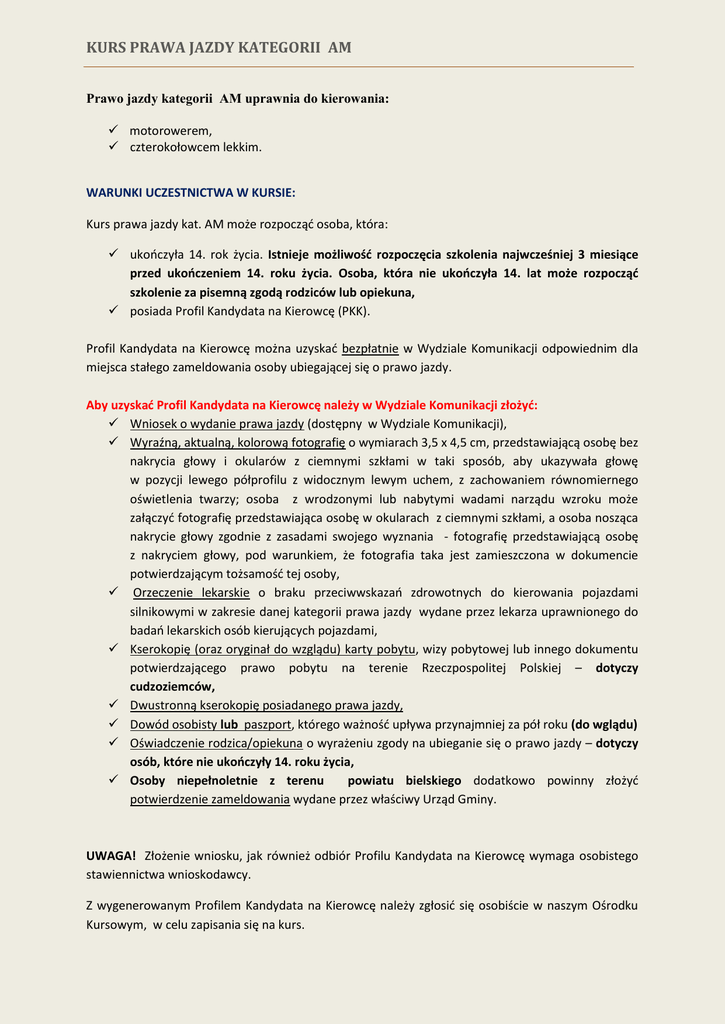 KURS PRAWA JAZDY KATEGORII AM Prawo jazdy kategorii AM uprawnia do kierowania: motorowerem, czterokołowcem lekkim. WARUNKI UCZESTNICTWA W KURSIE: Kurs prawa jazdy kat. AM może rozpocząć osoba, która: ukończyła 14. rok życia. Istnieje możliwość rozpoczęcia szkolenia najwcześniej 3 miesiące przed ukończeniem 14. roku życia. Osoba, która nie ukończyła 14. lat może rozpocząć szkolenie za pisemną zgodą rodziców lub opiekuna, posiada Profil Kandydata na Kierowcę (PKK). Profil Kandydata na Kierowcę można uzyskać bezpłatnie w Wydziale Komunikacji odpowiednim dla miejsca stałego zameldowania osoby ubiegającej się o prawo jazdy. Aby uzyskać Profil Kandydata na Kierowcę należy w Wydziale Komunikacji złożyć: Wniosek o wydanie prawa jazdy (dostępny w Wydziale Komunikacji), Wyraźną, aktualną, kolorową fotografię o wymiarach 3,5 x 4,5 cm, przedstawiającą osobę bez nakrycia głowy i okularów z ciemnymi szkłami w taki sposób, aby ukazywała głowę w pozycji lewego półprofilu z widocznym lewym uchem, z zachowaniem równomiernego oświetlenia twarzy; osoba z wrodzonymi lub nabytymi wadami narządu wzroku może załączyć fotografię przedstawiająca osobę w okularach z ciemnymi szkłami, a osoba nosząca nakrycie głowy zgodnie z zasadami swojego wyznania - fotografię przedstawiającą osobę z nakryciem głowy, pod warunkiem, że fotografia taka jest zamieszczona w dokumencie potwierdzającym tożsamość tej osoby, Orzeczenie lekarskie o braku przeciwwskazań zdrowotnych do kierowania pojazdami silnikowymi w zakresie danej kategorii prawa jazdy wydane przez lekarza uprawnionego do badań lekarskich osób kierujących pojazdami, Kserokopię (oraz oryginał do wzglądu) karty pobytu, wizy pobytowej lub innego dokumentu potwierdzającego prawo pobytu na terenie Rzeczpospolitej Polskiej – dotyczy cudzoziemców, Dwustronną kserokopię posiadanego prawa jazdy, Dowód osobisty lub paszport, którego ważność upływa przynajmniej za pół roku (do wglądu) Oświadczenie rodzica/opiekuna o wyrażeniu zgody na ubieganie się o prawo jazdy – dotyczy osób, które nie ukończyły 14. roku życia, Osoby niepełnoletnie z terenu powiatu bielskiego dodatkowo powinny złożyć potwierdzenie zameldowania wydane przez właściwy Urząd Gminy. UWAGA! Złożenie wniosku, jak również odbiór Profilu Kandydata na Kierowcę wymaga osobistego stawiennictwa wnioskodawcy. Z wygenerowanym Profilem Kandydata na Kierowcę należy zgłosić się osobiście w naszym Ośrodku Kursowym, w celu zapisania się na kurs. INFORMACJE O SZKOLENIU: Zajęcia teoretyczne – 10 godz. Miejsce zajęć teoretycznych: Bielsko-Biała, ul. Słowackiego 24 Zajęcia praktyczne – 10 godz. Szkolimy na motocyklach marki Piaggio. Plac manewrowy: Bielsko-Biała, Beskidzki Hurt Towarowy, ul. Wypoczynkowa 78. Po zakończeniu szkolenia teoretycznego i praktycznego przeprowadzamy egzamin wewnętrzny, którego pozytywny wynik umożliwia ustalenie i przystąpienie do egzaminu w Wojewódzkim Ośrodku Ruchu Drogowego. Opłata za szkolenie może zostać rozłożona na nieoprocentowane raty. PODSTAWA PRAWNA: Ustawa z dnia 5 stycznia 2011 r. o kierujących pojazdami (Dz. U. Nr 30, poz. 151, z późn. zm.) Rozporządzenie Ministra Transportu, Budownictwa i Gospodarki Morskiej z dnia 13 lipca 2012r. w sprawie szkolenia osób ubiegających się o uprawnienia do kierowania pojazdami, instruktorów i wykładowców (Dz. U. 2012 nr 0 poz. 1019). INFORMACJI NA TEMAT KURSU UDZIELA: Tomasz Kręcichwost, tel.: 516 060 458.