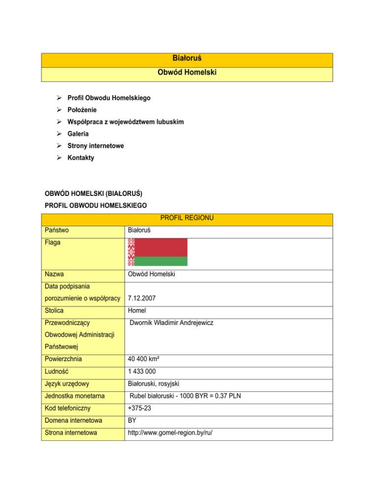 Białoruś Obwód Homelski Profil Obwodu Homelskiego Położenie Współpraca z województwem lubuskim Galeria Strony internetowe Kontakty OBWÓD HOMELSKI (BIAŁORUŚ) PROFIL OBWODU HOMELSKIEGO PROFIL REGIONU Państwo Białoruś Flaga Nazwa Obwód Homelski Data podpisania porozumienie o współpracy 7.12.2007 Stolica Homel Przewodniczący Dwornik Władimir Andrejewicz Obwodowej Administracji Państwowej Powierzchnia 40 400 km² Ludność 1 433 000 Język urzędowy Białoruski, rosyjski Jednostka monetarna Rubel białoruski - 1000 BYR = 0.37 PLN Kod telefoniczny +375-23 Domena internetowa BY Strona internetowa http://www.gomel-region.by/ru/ POŁOŻENIE Obwód homelski (białor. Гомельская вобласць, Homielskaja wobłasć) – obwód Białorusi leżący w jej południowo-wschodniej części przy granicy z Rosją i Ukrainą. Stolicą obwodu jest Homel. Liczba ludności:1 maja 2011: 1 433 000. Rejony obwodu homelskiego: 1. Brahiński (Brahiń) Брагінскі (Brahinski) 2. Budzki (Buda Koszelewska) Буда-Кашалёўскі (Buda-Kaszalouski) 3. Chojnicki (Chojniki) Хойніцкі (Chojnicki) 4. Czeczerski (Czeczersk) Чачэрскі (Czaczerski) 5. Dobruski (Dobrusz) Добрушскі (Dobruszski) 6. Homelski (Homel) Гомельскі (Homielski) 7. Jelski (Jelsk) Ельскі (Jelski) 8. Kalinkowicki (Kalinkowicze) Калінкавіцкі (Kalinkawicki) 9. Kormiański (Korma) Кармянскі (Karmianski) 10. Lelczycki (Lelczyce) Лельчыцкі (Lelczycki) 11. Łojowski (Łojów) Лоеўскі (Łojeuski) 12. Mozyrski (Mozyrz) Мазырскі (Mazyrski) 13. Narowelski (Narowla) Нараўлянскі (Naraulanski) 14. Oktiabrski (Oktiabrski) Акцябрскі (Akciabrski) 15. Petrykowski (Petryków) Петрыкаўскі (Pietrykauski) 16. Rohaczowski (Rohaczów) Рагачоўскі (Rahaczouski) 17. Rzeczycki (Rzeczyca) Рэчыцкі (Reczycki) 18. Świetłohorski (Świetłohorsk) Сьветлагорскі (Świetłahorski) 19. Wietkowski (Wietka) Веткаўскі (Wietkauski) 20. Żytkowicki (Żytkowicze) Жыткавіцкі (Żytkawicki) 21. Żłobiński (Żłobin) Жлобінскі (Żłobinski) WSPÓŁPRACA Z WOJEWÓDZTWEM LUBUSKIM Nawiązanie współpracy międzyregionalnej pomiędzy Województwem Lubuskim a Obwodem Homelskim (Republika Białoruś) było inicjatywą Pana Przewodniczącego Obwodowego Komitetu Wykonawczego – Pana Aleksandra Jakobsona. Działania, zmierzające do zawarcia umowy rozpoczęte zostały po informacji, którą otrzymaliśmy od Pana Konsula Generalnego Republiki Białoruś- Pana Rusłana Jesina – o chęci rozpoczęcia współpracy partnera białoruskiego z partnerem lubuskim. W dniach 02-04.09.2007 Pan Marszałek Krzysztof Szymański i wiceprezes Zachodniej Izby Przemysłowo – Handlowej Pan Krzysztof Kononowicz złożyli wizytę w Obwodzie Homelskim na Białorusi. Podczas wizyty podpisano komunikat końcowy, którego efektem było podpisanie Umowy o Współpracy między Obwodem Homelskim a Województwem Lubuskim w Żaganiu w dniu 7 grudnia 2007 roku. Pan Wiceprezes Kononowicz podpisał w imieniu Zachodniej Izby Przemysłowo – Handlowej List intencyjny o współpracy z Homelskim Oddziałem Białoruskiej Izby Handlowo – Przemysłowej. 20–23.05.2008 r. odbyła się misja gospodarcza do Homla na Białorusi. W czasie misji odbyły się spotkania z kierownictwem Dobruszkiego i Homelskiego Rejonowego Komitetu Wykonawczego. Uczestnicy misji wzięli udział w V Homelskim Forum Inwestycyjnym 2008, podczas którego mieli okazję prowadzenia rozmów z potencjalnymi kontraktami. W misji udział wziął przedstawiciel władz Województwa Lubuskiego. 21–24.09.2008 r. odbyła się wizyta delegacji Województwa Lubuskiego do Obwodu Homelskiego. W delegacji udział wziął przedstawiciel władz Województwa Lubuskiego. -18-21.05.2010 w Homlu miała miejsce XI Międzynarodowa Wystawa „Wiosna w Homlu” połączona z Forum Gospodarczym, na którym UMWL reprezentował Dyrektor Departamentu Gospodarki i Infrastruktury – Władysław Korcz. 17-21.05.2011 r. Wizyta przedstawicieli władz lubuskich w obwodzie homelskim (udział w Forum Gospodarczym oraz XII Międzynarodowej Wystawie „Wiosna w Homlu.” GALERIA STRONY INTERNETOWE Strona internetowa: http://www.gomel-region.by/ru/ Strona internetowa miasta http://www.gorod.gomel.by/ Ambasada Rzeczpospolitej Polskiej na Białorusi [email protected] www.minsk.polemb.net KONTAKTY Urząd Marszałkowski Województwa Lubuskiego Departament Rozwoju Regionalnego i Współpracy Zagranicznej Wydział Współpracy Zagranicznej Inna Panek tel. 068 / 45 65 213 e-mail: [email protected] Urząd Marszałkowski Województwa Lubuskiego Departament Rozwoju Regionalnego i Współpracy Zagranicznej tel. 068 / 45 65 289 fax 0.68 / 327 14 29 Biuro Informacyjne Województwa Lubuskiego w Brukseli Avenue Palmerston 3 B-1000 Brussels Tel./Fax: +32 2 234 68 56 GSM: +32 485 750 004 e-mail: [email protected] Ambasada Białorusi ul. wiertnicza 58, 02-952 Warszawa, Polska Tel: +48 (22) 742-0976,-66,-75 Ambasada Rzeczypospolitej Polskiej na Białorusi Wydział Konsularny Ambasady Rzeczypospolitej Polskiej w Mińsku Białoruś, Mińsk, Kropotkina 91-A, 220002 Mińsk Tel.: (00-375 17) 284 99 80 do 1 Tel. dyżurny: (00-375 17) 29 670 33 74 Faks: (00-375 17) 289 32 55