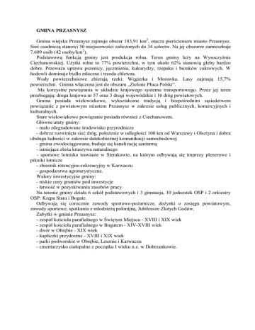 GMINA PRZASNYSZ Gmina wiejska Przasnysz zajmuje obszar 183,91 km2, otacza pierścieniem miasto Przasnysz. Sieć osadniczą stanowi 50 miejscowości zaliczonych do 34 sołectw. Na jej obszarze zamieszkuje 7.609 osób (42 osoby/km2). Podstawową funkcją gminy jest produkcja rolna. Teren gminy leŜy na Wysoczyźnie Ciechanowskiej. UŜytki rolne to 77% powierzchni, w tym około 62% stanowią gleby bardzo dobre. PrzewaŜa uprawa pszenicy, jęczmienia, kukurydzy, rzepaku i buraków cukrowych. W hodowli dominuje bydło mleczne i trzoda chlewna. Wody powierzchniowe zbierają rzeki: Węgierka i Morawka. Lasy zajmują 15,7% powierzchni. Gmina włączona jest do obszaru „Zielone Płuca Polski”. Ma korzystne powiązania w układzie krajowego systemu transportowego. Przez jej teren przebiegają: droga krajowa nr 57 oraz 3 drogi wojewódzkie i 16 dróg powiatowych. Gmina posiada wielowiekowe, wykształcone tradycją i bezpośrednim sąsiedztwem powiązanie z powiatowym miastem Przasnysz w zakresie usług publicznych, komercyjnych i kulturalnych. Stare wielowiekowe powiązanie posiada równieŜ z Ciechanowem. Główne atuty gminy: - mało zdegradowane środowisko przyrodnicze - dobrze rozwinięta sieć dróg, połoŜenie w odległości 100 km od Warszawy i Olsztyna i dobra obsługa ludności w zakresie dalekobieŜnej komunikacji samochodowej - gmina zwodociągowana, buduje się kanalizację sanitarną - istniejące złoŜa kruszywa naturalnego - sportowe lotnisko trawiaste w Sierakowie, na którym odbywają się imprezy plenerowe i pikniki lotnicze - zbiornik retencyjno-rekreacyjny w Karwaczu - gospodarstwa agroturystyczne. Walory inwestycyjne gminy: - niskie ceny gruntów pod inwestycje - łatwość w pozyskiwaniu zasobów pracy. Na terenie gminy działa 6 szkół podstawowych i 3 gimnazja, 10 jednostek OSP i 2 orkiestry OSP: Krępa Stara i Bogate. Odbywają się corocznie zawody sportowo-poŜarnicze, doŜynki o zasięgu powiatowym, zawody sportowe, spotkania z młodzieŜą polonijną, Jubileusze Złotych Godów. Zabytki w gminie Przasnysz: - zespół kościoła parafialnego w Świętym Miejscu - XVIII i XIX wiek - zespół kościoła parafialnego w Bogatem - XIV-XVIII wiek - dwór w Obrębie - XIX wiek - kapliczki przydroŜne - XVIII i XIX wiek - parki podworskie w Obrębie, Lesznie i Karwaczu - cmentarzysko ciałopalne z początku I wieku n.e. w Dobrzankowie. MIEJSCOWOŚCI GMINY PRZASNYSZ Annopol Pod koniec XVIII wieku w tym miejscu był las. Około 1830 roku osada Annopol znajdowała się na miejscu obecnych skrajnych kolonii Gostkowa. W 1884 roku posiadała 8 osad i folwark naleŜący do dóbr Leszno z 1 budynkiem murowanym i 8 drewnianymi. Około 1934 roku ma 5 numerów. Obecnie 16 posesji i 91 mieszkańców. Bartniki (sołectwo) Jedna z najstarszych miejscowości w gminie Przasnysz - wzmiankowana w 1239 roku. W I ćwierćwieczu XV wieku, wieś na prawie niemieckim. W 1444 roku Wojciech Strzegowski ze Strzegowa wykupuje od księcia wójtostwo, a później większą część wsi dając początek rodowi Bartnickich. W 1567 roku - 13,5 włóki i 2 ogrodników. Po 1807 roku siedziba gminy, właścicielem wsi jest Zieliński. W 1827 roku było 31 domów i 223 mieszkańców. W północnej części wsi (niedaleko Morawki) była cegielnia i karczma na zakręcie szosy. W 1880 roku wieś w dobrach Wandy Potockiej - 85 domów i 706 mieszkańców. We wsi był młyn wodny, cegielnia, szkółka elementarna. W 1908 roku obóz wojskowy (między innymi Pułk Czernisowski). Obecnie 99 zamieszkałych posesji i 433 mieszkańców. W miejscowości znajdują się: punkt skupu mleka, remiza OSP, szkoła podstawowa z przedszkolem, krzyŜ morowy z początku XX wieku, figurka z 1908 roku, cmentarz wojenny z I wojny światowej, tartak. Bogate (sołectwo) Pierwsza wzmianka w I ćwierćwieczu XV wieku.W 1425 roku Sasin z Bogatego – kasztelan ciechanowski. Przed 1481 rokiem powstał obecny kościół z fundacji dziedzica - Mikołaja WęŜa z Dobrzankowa. Dziedzice z Bogatego dali początek znanemu rodowi Bogackich ( z nich babka św. Stanisława Kostki ). W 1567 roku - jako Bogathe - składało się z 4 części łącznie mających 16 włók i 8 ogrodników. Jest najstarsza w okolicy szkoła parafialna. W latach 1563 1866 jedna z głównych siedzib moŜnego mazowieckiego i pomorskiego rodu Narzymskich . W roku 1781 odnotowano istnienie grobli i mostu przez Węgierkę. Po 1807 roku siedziba gminy. W 1827 roku Bogate liczyło 30 domów i 223 mieszkańców. W 1830 roku była tu cegielnia i garbarnia. Stąd wywodzi się pisarz i znany działacz powstania styczniowego Józef Narzymski, członek Komitetu Centralnego Stronnictwa Czerwonych. Po 1866 roku własność Światłowskiego. W 1880 roku w gminie Karwacz, liczy 48 domów i 195 mieszkańców, szkółka elementarna. Folwark posiadał wówczas 7 domów, 97 mieszkańców, młyn wodny i karczmę oraz 975 mórg ziemi. W roku 1906 powstaje koło Polskiej Macierzy Szkolnej szerzące oświatę narodową . W trakcie walk w 1915 roku zostaje powaŜnie uszkodzony kościół. Około 1934 roku miejscowość miała 89 numerów. W czasie wojny Niemcy w kościele ulokowali posterunek Ŝandarmerii. Obecnie 144 zamieszkałe posesje i 549 mieszkańców. Przez wieś przepływa rzeka Węgierka, która jest atrakcją dla wielu turystów. W miejscowości jest: punkt skupu mleka, remiza OSP, zespół szkół, biblioteka, młodzieŜowa orkiestra OSP - istniejąca od 1968 roku, cmentarz parafialny, kościół murowany św. Anny z XV wieku, dzwonnica murowana, oficyna dworska z 1800 roku, karczma murowana z połowy XIX wieku, młyn wodny, tablica-pomnik poświęcona Tadeuszowi Kościuszko wystawiona w 1917 roku, pomnik pomordowanym w czasie II wojny światowej, zabytkowe kapliczki z XIX wieku, sklepy. Brzezice W 1880 roku gmina Chojnowo parafia Przasnysz, osada drobnej szlachty mająca 4 domy i 134 morgi. W 1908 roku był tu folwark z dworem. Obecnie 4 posesje i 25 mieszkańców. W miejscowości j