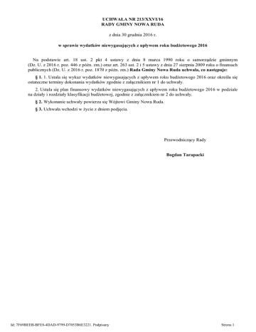 UCHWAŁA NR 213/XXVI/16 RADY GMINY NOWA RUDA z dnia 30 grudnia 2016 r. w sprawie wydatków niewygasających z upływem roku budżetowego 2016 Na podstawie art. 18 ust. 2 pkt 4 ustawy z dnia 8 marca 1990 roku o samorządzie gminnym (Dz. U. z 2016 r. poz. 446 z późn. zm.) oraz art. 263 ust. 2 i 5 ustawy z dnia 27 sierpnia 2009 roku o finansach publicznych (Dz. U. z 2016 r. poz. 1870 z późn. zm.) Rada Gminy Nowa Ruda uchwala, co następuje: § 1. 1. Ustala się wykaz wydatków niewygasających z upływem roku budżetowego 2016 oraz określa się ostateczne terminy dokonania wydatków zgodnie z załącznikiem nr 1 do uchwały. 2. Ustala się plan finansowy wydatków niewygasających z upływem roku budżetowego 2016 w podziale na działy i rozdziały klasyfikacji budżetowej, zgodnie z załącznikiem nr 2 do uchwały. § 2. Wykonanie uchwały powierza się Wójtowi Gminy Nowa Ruda. § 3. Uchwała wchodzi w życie z dniem podjęcia. Przewodniczący Rady Bogdan Tarapacki Id: 7F69BEEB-BFE8-4DAD-9799-D7053B6E3221. Podpisany Strona 1 Załącznik nr 1 do Uchwały nr 213/XXVI/16 Rady Gminy Nowa Ruda z dnia 30 grudnia 2016 r. Plan wydatków niewygasających w roku budżetowym 2016 l.p. Wyszczególnienie wydatków Kwota 1 Remont umocnienia cieku wodnego o numerze ewidencyjnym gruntu 221/2 w miejscowości Bożków Przebudowa drogi transportu rolnego o nr ewidencyjnym gruntu 328dr w Czerwieńczycach Opracowanie dokumentacji projektowej dla drogi : Sokolec : działka 182, 15/9 Opracowanie dokumentacji projektowej dla drogi w sołectwie Koszyn : działka 35,28/13,,28/18,28./19,28/20,36,40/24,40/16 (650 mb) Przebudowa drogi wewnętrznej w Bożkowie dz. nr 602 Odwodnienie drogi gminnej w miejscowości Bartnica Wykonanie bariery ochronnej na moście w ciągu drogi gminnej o numerze ewidencyjnym gruntu 490dr oraz 491dr w miejscowości Krajanów Razem wydatki niewygasające 12 673,29 Termin zakończenia realizacji zadania 30.05.2017 22 973,84 30.05.2017 7 195,50 30.05.2017 7 970,40 30.05.2017 47 000,00 30.05.2017 8 610,00 30.05.2017 9 225,00 30.05.2017 115 648,03 x 2. 3. 4. 5. 6. 7. Id: 7F69BEEB-BFE8-4DAD-9799-D7053B6E3221. Podpisany Strona 2 Załącznik nr 2 do Uchwały nr 213/XXVI/16 Rady Gminy Nowa Ruda z dnia 30 grudnia 2016 r. Plan finansowy wydatków niewygasających w roku budżetowym 2016 dział Rozdział § Treść Kwota bieżące 010 01008 4270 01042 6050 600 60016 6050 4270 x x x w tym: majątkowe ROLNICTWO I ŁOWIECTWO Melioracje wodne Zakup usług remontowych Wyłączenie z produkcji gruntów rolnych Wydatki inwestycyjne jednostek budżetowych Przebudowa drogi transportu rolnego o nr ewidencyjnym gruntu 328dr w Czerwieńczycach TRANSPORT I ŁĄCZNOŚĆ Drogi publiczne gminne Wydatki inwestycyjne jednostek budżetowych Opracowanie dokumentacji projektowej dla drogi : Sokolec : działka 182, 15/9 Opracowanie dokumentacji projektowej dla drogi w sołectwie Koszyn : działka 35,28/13,,28/18,28./19,28/20,36,40/24,40/ 16 (650 mb) 35 647,13 12 673,29 12 673,29 22 973,84 22 973,84 12 673,29 12 673,29 12 673,29 0,00 0,00 22 973,84 0,00 0,00 22 973,84 22 973,84 22 973,84 80 000,90 80 000,90 62 165,90 0,00 17 835,00 17 835,00 0,00 22 973,84 62 165,90 62 165,90 62 165,90 7 195,50 0,00 7 195,50 7 970,40 0,00 7 970,40 Przebudowa drogi wewnętrznej w Bożkowie dz. nr 602 Zakup usług remontowych 47 000,00 0,00 47 000,00 17 835,00 17 835,00 0,00 8 610,00 8 610,00 0,00 9 225,00 9 225,00 0,00 115 648,03 30 508,29 85 139,74 Odwodnienie drogi gminnej w miejscowości Bartnica Wykonanie bariery ochronnej na moście w ciągu drogi gminnej o numerze ewidencyjnym gruntu 490dr oraz 491 dr w miejscowości Krajanów OGÓŁEM Id: 7F69BEEB-BFE8-4DAD-9799-D7053B6E3221. Podpisany Strona 3 Uzasadnienie Zgodnie z art. 263 ustawy o finansach publicznych organ stanowiący jednostki samorządu terytorialnego może ustalić, w drodze uchwały, wykaz wydatków, które nie wygasają z upływem roku budżetowego oraz określić ostateczny termin dokonania każdego wydatku. Łącznie z wykazem wydatków, które nie wygasają z upływem roku budżetowego, organ stanowiący jednostki samorządu terytorialnego ustala plan finansowy tych wydatków w podziale na działy i rozdziały klasyfikacji wydatków, z wyodrębnieniem wydatków majątkowych. Środki finansowe na wydatki niewygasające są gromadzone na wyodrębnionym subkoncie podstawowego rachunku bankowego, a wydatki na zadania ujęte są w wykonaniu budżetu za bieżący rok budżetowy. Przewodniczący Rady Bogdan Tarapacki Id: 7F69BEEB-BFE8-4DAD-9799-D7053B6E3221. Podpisany Strona 1