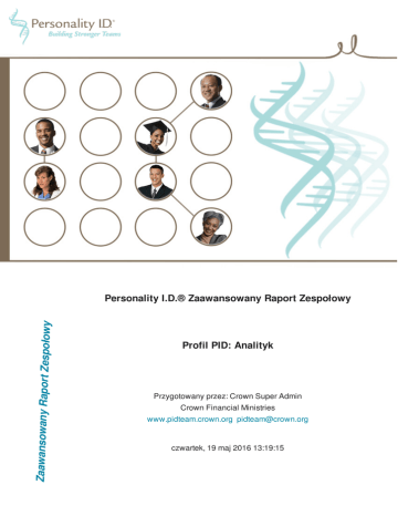 Zaawansowany Raport Zespoło wy Personality I.D.® Zaawansowany Raport Zespołowy Profil PID: Analityk Przygotowany przez: Crown Super Admin Crown Financial Ministries www.pidteam.crown.org [email protected] czwartek, 19 maj 2016 13:19:15 Zaawansowany Raport Zespołowy Wprowadzenie Zaawansowany raport zespołowy umożliwi ci szczegółowe zbadanie składu twojego zespołu. W raporcie określone zostaną konkretny profil i dynamika zespołu. Raport umożliwi ci również tworzenie nowych zespołów na potrzeby konkretnych strategii działania. Pokaże ci także, jak zmieni się istniejący zespół, gdy dodasz do niego kogoś lub kogoś z niego usuniesz. Można będzie na bieżąco prześledzić cechy nowego zespołu – jeszcze zanim zmiany zostaną wprowadzone. Odkryjesz ewentualne braki w składzie istniejących zespołów. Narzędzie jest nieocenioną pomocą dla liderów i menedżerów, którzy planują dokonanie ważnych strategicznych zmian w kierowanych przez siebie organizacjach. Ten raport ukazuje trzy unikalne sposoby spojrzenia na zespół. Twój obecny zespół: Ukazane są profile obecnych członków zespołu i charakterystyka zespołu jako całości. To spojrzenie umożliwi ci lepsze zrozumienie obecnej sytuacji, zanim dokonasz jakichkolwiek zmian. Twój nowy zespół: Jest to zespół, który powstanie, gdy usuniesz z istniejącego zespołu pewne osoby i/lub dodasz do niego nowe osoby. Ukazane zostaną profile członków nowego zespołu i jego charakterystyka jako całości. To spojrzenie umożliwi ci lepsze zrozumienie tego, co się stanie po ewentualnych zmianach, jeszcze zanim je wprowadzisz. Twój usunięty zespół: Złożony jest on z osób, które wybrałeś do usunięcia z poprzedniego zespołu. Ukazane zostaną profile usuniętych członków i ich charakterystyka jako zespołu. To umożliwi ci lepsze zrozumienie tego, co się stanie po ewentualnych zmianach i w jaki sposób można zagospodarować usunięte osoby. Uzyskasz też świadomość tego, co traci poprzedni zespół. Podsumowanie: Po przestudiowaniu Zaawansowanego raportu zespołowego uzyskasz następujące informacje dotyczące trzech grup: członkowie obecnego zespołu – ich indywidualne profile i profil zbiorczy zespołu; członkowie nowego zespołu – ich indywidualne profile i profil zbiorczy zespołu; członkowie usunięci z zespołu – ich indywidualne profile i ich profil zbiorczy jako zespołu. Te trzy perspektywy dadzą ci możliwość przyjrzenia się konsekwencjom poszczególnych planowanych zmian, zanim zostaną one wprowadzone w życie. Przygotowany przez: Crown Super Admin, Crown Financial Ministries, www.pidteam.crown.org czwartek, 19 maj 2016 13:19:15 1/20 Perspektywa 1: COMBINED TEAM | Profil zespołu: Analityk Członkowie obecnego zespołu: 1. Frank R (Głęboki Myśliciel) Opis: Głębocy myśliciele są analityczni, logiczni oraz filozoficzni w swoich szczerych poszukiwaniach znaczenia, prawdy i celu życia. Są zdolni przedrzeć się przez emocje i zamieszanie, by wyciągnąć wnioski z obserwacji, danych i badań. Idealne Otoczenie Głębocy myśliciele w pełni realizują swój potencjał, gdy mają możliwość: analizowania – badania faktów – organizowania – poddawania krytyce i optymalizacji – bycia szczegółowym i dokładnym – myślenia i przetwarzania – stosowania procedur – pracowania z przedmiotami i danymi – planowania. 2. Chuck F (Ostrożny Myśliciel) Opis: Jako ostrożny myśliciel osoba taka przywiązuje wielką wagę do dokładności i staranności swoich działań. Chce mieć swój wkład w projekt dzięki precyzji i systematyczności, a także ostrożnemu rozumowaniu. Idealne Otoczenie Ostrożni Myśliciele najlepiej realizuje swój potencjał, gdy ma możliwość: planowania – myślenia i przetwarzania – poddawania krytyce i podnoszenia jakości – pracy w środowisku wolnym od konfliktu – wspierania innych – podążania za procedurami – współpracy indywidualnej – badania faktów. 3. John G (Analityk) Przygotowany przez: Crown Super Admin, Crown Financial Ministries, www.pidteam.crown.org czwartek, 19 maj 2016 13:19:15 2/20 Opis: Przedstawiciele tego profilu mają tendencje do dążenia do perfekcyjnych rezultatów we wszystkich swoich planach i projektach. W wielu sytuacjach analizują w głowie szczegóły swoich pomysłów i wynajdują sposoby ich optymalizacji. Świetnie sobie radzą w tego typu zadaniach umysłowych, ale mogą mieć tendencje do postrzegania otoczenia bardziej jako części projektu niż ludzi. Idealne Otoczenie Analityk najlepiej realizuje swój potencjał, jeśli ma możliwość: uzyskania rezultatów – kierowania – badania faktów – poddawania krytyce i optymalizowania – myślenia i przetwarzania – kontrolowania – tworzenia i rozwijania – inicjowania rozwiązań – projektowania nowych procedur – zbierania informacji. 4. Peter S (Administrator) Opis: Jak sugeruje nazwa profilu, administrator łączy zdolność do współdziałania z ludźmi (i angażowania ich do procesu osiągania rezultatów) z determinacją do odnoszenia sukcesów w ważnych sprawach. To połączenie silnych stron osobowości czyni z administratora osobę dobrze przysposobioną do nadzorowania projektów, które wymagają współpracy z innymi. Idealne Otoczenie Administrator realizuje swój największy potencjał, mając możliwość: dawania przykładu – bycia konsekwentnym – tworzenia – obserwowania całego procesu realizacji projektu aż do ukończenia – nadzorowania – czynienia stabilnego postępu – demonstrowania lojalności – osiągania celów – inicjowania rozwiązań. 5. Sheila R (Perfekcjonista) Opis: Perfekcjoniści przywiązują dużą wagę do szczegółów często pomijanych przez innych. W rezultacie są zazwyczaj dobrze zorganizowani, samozdyscyplinowani i godni zaufania w oczach innych, głównie pod względem wierności w realizacji zadań i dokładności. Idealne Otoczenie Perfekcjonis