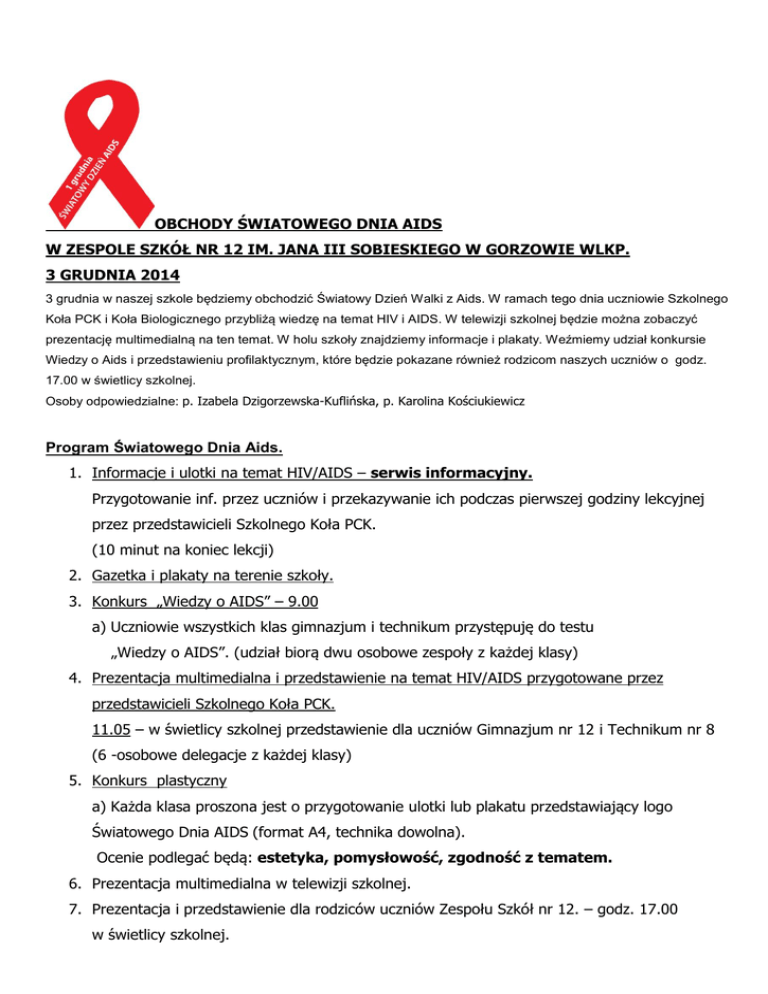 OBCHODY ŚWIATOWEGO DNIA AIDS W ZESPOLE SZKÓŁ NR 12 IM. JANA III SOBIESKIEGO W GORZOWIE WLKP. 3 GRUDNIA 2014 3 grudnia w naszej szkole będziemy obchodzić Światowy Dzień Walki z Aids. W ramach tego dnia uczniowie Szkolnego Koła PCK i Koła Biologicznego przybliżą wiedzę na temat HIV i AIDS. W telewizji szkolnej będzie można zobaczyć prezentację multimedialną na ten temat. W holu szkoły znajdziemy informacje i plakaty. Weźmiemy udział konkursie Wiedzy o Aids i przedstawieniu profilaktycznym, które będzie pokazane również rodzicom naszych uczniów o godz. 17.00 w świetlicy szkolnej. Osoby odpowiedzialne: p. Izabela Dzigorzewska-Kuflińska, p. Karolina Kościukiewicz Program Światowego Dnia Aids. 1. Informacje i ulotki na temat HIV/AIDS – serwis informacyjny. Przygotowanie inf. przez uczniów i przekazywanie ich podczas pierwszej godziny lekcyjnej przez przedstawicieli Szkolnego Koła PCK. (10 minut na koniec lekcji) 2. Gazetka i plakaty na terenie szkoły. 3. Konkurs „Wiedzy o AIDS” – 9.00 a) Uczniowie wszystkich klas gimnazjum i technikum przystępuję do testu „Wiedzy o AIDS”. (udział biorą dwu osobowe zespoły z każdej klasy) 4. Prezentacja multimedialna i przedstawienie na temat HIV/AIDS przygotowane przez przedstawicieli Szkolnego Koła PCK. 11.05 – w świetlicy szkolnej przedstawienie dla uczniów Gimnazjum nr 12 i Technikum nr 8 (6 -osobowe delegacje z każdej klasy) 5. Konkurs plastyczny a) Każda klasa proszona jest o przygotowanie ulotki lub plakatu przedstawiający logo Światowego Dnia AIDS (format A4, technika dowolna). Ocenie podlegać będą: estetyka, pomysłowość, zgodność z tematem. 6. Prezentacja multimedialna w telewizji szkolnej. 7. Prezentacja i przedstawienie dla rodziców uczniów Zespołu Szkół nr 12. – godz. 17.00 w świetlicy szkolnej.