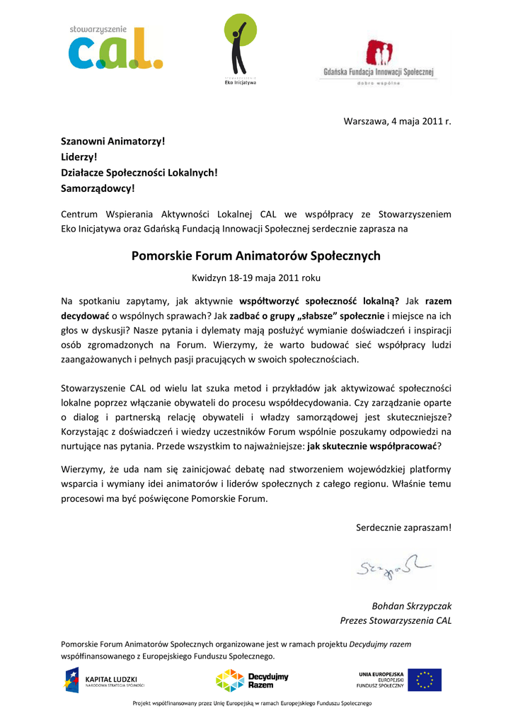 Warszawa, 4 maja 2011 r. Szanowni Animatorzy! Liderzy! Działacze Społeczności Lokalnych! Samorządowcy! Centrum Wspierania Aktywności Lokalnej CAL we współpracy ze Stowarzyszeniem Eko Inicjatywa oraz Gdaoską Fundacją Innowacji Społecznej serdecznie zaprasza na Pomorskie Forum Animatorów Społecznych Kwidzyn 18-19 maja 2011 roku Na spotkaniu zapytamy, jak aktywnie współtworzyd społecznośd lokalną? Jak razem decydowad o wspólnych sprawach? Jak zadbad o grupy „słabsze” społecznie i miejsce na ich głos w dyskusji? Nasze pytania i dylematy mają posłużyd wymianie doświadczeo i inspiracji osób zgromadzonych na Forum. Wierzymy, że warto budowad sied współpracy ludzi zaangażowanych i pełnych pasji pracujących w swoich społecznościach. Stowarzyszenie CAL od wielu lat szuka metod i przykładów jak aktywizowad społeczności lokalne poprzez włączanie obywateli do procesu współdecydowania. Czy zarządzanie oparte o dialog i partnerską relację obywateli i władzy samorządowej jest skuteczniejsze? Korzystając z doświadczeo i wiedzy uczestników Forum wspólnie poszukamy odpowiedzi na nurtujące nas pytania. Przede wszystkim to najważniejsze: jak skutecznie współpracowad? Wierzymy, że uda nam się zainicjowad debatę nad stworzeniem wojewódzkiej platformy wsparcia i wymiany idei animatorów i liderów społecznych z całego regionu. Właśnie temu procesowi ma byd poświęcone Pomorskie Forum. Serdecznie zapraszam! Bohdan Skrzypczak Prezes Stowarzyszenia CAL Pomorskie Forum Animatorów Społecznych organizowane jest w ramach projektu Decydujmy razem współfinansowanego z Europejskiego Funduszu Społecznego. Pomorskie Forum Animatorów Społecznych Kwidzyn, 18-19 maja 2011 r. Prowadzenie: Jacek Gralczyk i Paweł Jordan Stowarzyszenie CAL 18 maja 2011 r. 10.30 Rejestracja gości 11.00 - 11:10 Powitanie uczestników – Burmistrz Kwidzyna Andrzej Krzysztofiak 11:10 – 11:30 Wprowadzenie do projektu „Decydujmy razem” Prowadzący: Paweł Jordan, Stowarzyszenie CAL 11.30 – 13.00 Refleksyjna sesja grupowa „Czym jest partycypacja?” Prowadzący: Jacek Gralczyk, Stowarzyszenie CAL 13.00-14.00 Obiad 14.00 – 15.30 Warsztaty grupowe „Perspektywy partycypacji” 1. Niech usłyszą nasz głos – wzmacnianie grup słabszych społecznie Prowadzący: Marianna Sitek-Wróblewska, Gdaoska Fundacja Innowacji Społeczne; Paweł Jordan, Stowarzyszenie CAL 2. Czy konflikt w społeczności może byd twórczy? Prowadzący: Ewa Romanow – Pękal, Stowarzyszenie Eko Inicjatywa; Jacek Gralczyk, Stowarzyszenie CAL 3. Pułapki partycypacji: włączanie społeczności lokalnej – czynnik rozwoju czy bariera? Prowadzący: Rafał Krenz, Stowarzyszenie CAL; Marek Romaniec, Fundacja „Naszyjnik Północy” 15.30-16.00 Przerwa kawowa 16.00-17.00 Podsumowanie warsztatów grupowych 17.00-19.00 Sesja role play „Decydujmy razem” Prowadzący: Rafał Krenz, Stowarzyszenie CAL 19.00 Kolacja 19 maja 2011 r. 8.00 Śniadanie 8:30 Wyjazd do Benowa 9:00 – 11:00 Prezentacja dobrej praktyki. Zaułek Benowo to ośrodek prowadzony przez Stowarzyszenie Eko-Inicjatywa. To ważne miejsce aktywizacji, integracji i edukacji dla mieszkaoców wsi. Zaangażowanie mieszkaoców, ich pomysły i energia do wspólnego działania, zaowocowały licznymi inicjatywami społecznymi i ekologicznymi. 11:30 Powrót do hotelu 12.00 -14:00 Sesja podsumowująca - pomysły na współpracę animatorów woj. Pomorskiego, wypracowanie koncepcji Pomorskiego Forum Animatorów Społecznych 14:00 15:00 Obiad Wyjazd Organizatorzy: Stowarzyszenie Centrum Wspierania Aktywności Lokalnej CAL to ogólnopolska organizacja ukierunkowana na poszukiwanie, wypracowywanie i upowszechnianie społeczno-edukacyjnych form (strategii, metod i narzędzi) aktywizacji i rozwoju społeczności lokalnych. Motto stowarzyszenia to ”Pomóżmy ludziom, aby pomogli sobie sami”. www.cal.org.pl Stowarzyszenie Eko-Inicjatywa to organizacja pozarządowa działająca w obszarze edukacji ekologicznej, ochrony przyrody i animacji społecznej. Stowarzyszenie jest otwarte na potrzeby i pomysły społeczności lokalnych - wierząc w mądrośd ludzi, uruchamia mechanizmy społeczne służące rozwojowi lokalnemu w zgodzie z ideą zrównoważonego rozwoju. www.ekokwidzyn.pl Gdaoska Fundacja Innowacji Społecznej to dynamicznie rozwijająca się organizacja pozarządowa tworzona przez osoby od lat zajmujące się różnorodnymi aspektami pomocy społecznej, skupiającą wielu pozytywnych ludzi chcących zmieniad świat na lepsze. Ma na celu kreowanie pozytywnych zmian w dotychczasowym sposobie rozwiązywania problemów społecznych w myśl zasady - "NOWE MYŚLENIE, DAJE NOWE SPOJRZENIE". www.gfis.pl