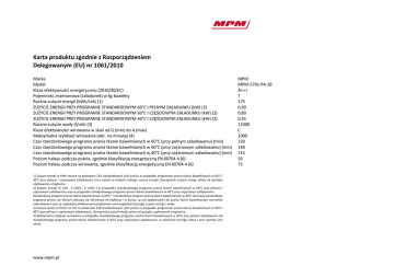 Karta produktu zgodnie z Rozporządzeniem Delegowanym (EU) nr 1061/2010 Marka Model Klasa efektywności energetycznej (2010/30/EC) Pojemność znamionowa (załadunek) w kg bawełny Roczne zużycie energii (kWh/rok) (1) ZUŻYCIE ENERGII PRZY PROGRAMIE STANDARDOWYM 60°C I PEŁNYM ZAŁADUNKU (kW) (2) ZUŻYCIE ENERGII PRZY PROGRAMIE STANDARDOWYM 60°C I CZĘŚCIOWYM ZAŁADUNKU (kW) (2) ZUŻYCIE ENERGII PRZY PROGRAMIE STANDARDOWYM 40°C I CZĘŚCIOWYM ZAŁADUNKU (kW) (2) Roczne zużycie wody (l/rok) (3) Klasa efektywności wirowania w skali od G (min) do A (max) Maksymalna szybkość wirowania (obr. na minutę) (4) Czas standardowego programu prania tkanin bawełnianych w 60°C (przy pełnym załadowaniu) (min) Czas standardowego programu prania tkanin bawełnianych w 60°C (przy częściowym załadowaniu) (min) Czas standardowego programu prania tkanin bawełnianych w 40°C (przy częściowym załadowaniu) (min) Poziom hałasu podczas prania, zgodnie klasyfikacją energetyczną EN 60704-4 (6) Poziom hałasu podczas wirowania, zgodnie klasyfikacją energetyczną EN 60704-4 (6) 1) Zużycie energii w kWh rocznie na podstawie 220 standardowych cykli prania w przypadku programów prania tkanin bawełnianych w 60°C i 40°C przy pełnym i częściowym załadowaniu oraz zużycie w trybach niskiego zużycia energii. Rzeczywiste zużycie energii zależy od sposobu użytkowania urządzenia. 2) Zużycie energii (E t,60 , E t,60½ , E t,40½ ) w przypadku standardowego programu prania tkanin bawełnianych w 60°C przy pełnym i częściowym załadowaniu oraz w przypadku standardowego programu prania tkanin bawełnianych w 40°C przy częściowym załadowaniu. Standardowy program prania tkanin bawełnianych w 60°C” i standardowy program prania tkanin bawełnianych w 40°C stanowią standardowe programy prania, do których odnoszą się informacje na etykiecie i w karcie; są one odpowiednie do prania tkanin bawełnianych normalnie zabrudzonych oraz są najbardziej efektywnymi programami pod względem łącznego zużycia energii i wody 3) Zużycie wody w litrach na rok na podstawie 220 standardowych cykli prania w przypadku programów prania tkanin bawełnianych w 60°C i 40°C przy pełnym i częściowym załadowaniu. Rzeczywiste zużycie wody zależy od sposobu użytkowania urządzenia. 4) Maksymalna szybkość wirowania w przypadku standardowego programu prania tkanin bawełnianych w 60°C przy pełnym załadowaniu lub standardowego programu prania tkanin bawełnianych w 40°C przy częściowym załadowaniu, w zależności od tego, która z tych wartości jest niższa www.mpm.pl MPM MPM-5701-PA-28 A+++ 7 175 0,90 0,80 0,55 11000 C 1000 150 148 115 59 73