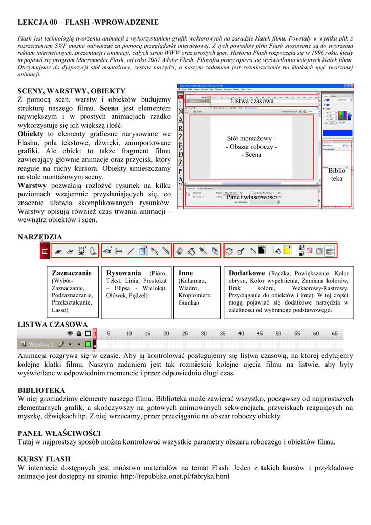 LEKCJA 00 – FLASH -WPROWADZENIE Flash jest technologią tworzenia animacji z wykorzystaniem grafik wektorowych na zasadzie klatek filmu. Powstały w wyniku plik z rozszerzeniem SWF można odtwarzać za pomocą przeglądarki internetowej. Z tych powodów pliki Flash stosowane są do tworzenia reklam internetowych, prezentacji i animacji, całych stron WWW oraz prostych gier. Historia Flash rozpoczęła się w 1996 roku, kiedy to pojawił się program Macromedia Flash, od roku 2007 Adobe Flash. Filozofia pracy opiera się wyświetlaniu kolejnych klatek filmu. Otrzymujemy do dyspozycji stół montażowy, zestaw narzędzi, a naszym zadaniem jest rozmieszczenie na klatkach ujęć tworzonej animacji. SCENY, WARSTWY, OBIEKTY Z pomocą scen, warstw i obiektów budujemy strukturę naszego filmu. Scena jest elementem największym i w prostych animacjach rzadko wykorzystuje się ich większą ilość. Obiekty to elementy graficzne narysowane we Flashu, pola tekstowe, dźwięki, zaimportowane grafiki. Ale obiekt to także fragment filmu zawierający głównie animacje oraz przycisk, który reaguje na ruchy kursora. Obiekty umieszczamy na stole montażowym sceny. Warstwy pozwalają rozłożyć rysunek na kilku poziomach wzajemnie przysłaniających się, co znacznie ułatwia skomplikowanych rysunków. Warstwy opisują również czas trwania animacji wewnątrz obiektów i scen. Listwa czasowa N A R Z Ę D Z I A Stół montażowy Stół montażowy - Obszar roboczy - Scena Biblio teka Panel właściwości NARZĘDZIA Zaznaczanie (WybórZaznaczanie, Podzaznaczanie, Przekształcanie, Lasso) (Pióro, Tekst, Linia, Prostokąt – Elipsa - Wielokąt, Ołówek, Pędzel) Rysowania Inne Dodatkowe (Rączka, Powiększenie, Kolor (Kałamarz, Wiadro, Kroplomierz, Gumka) obrysu, Kolor wypełnienia, Zamiana kolorów, Brak koloru, Wektorowy-Rastrowy, Przyciąganie do obiektów i inne). W tej części mogą pojawiać się dodatkowe narzędzia w zależności od wybranego podstawowego. LISTWA CZASOWA Animacja rozgrywa się w czasie. Aby ją kontrolować posługujemy się listwą czasową, na której edytujemy kolejne klatki filmu. Naszym zadaniem jest tak rozmieścić kolejne ujęcia filmu na listwie, aby były wyświetlane w odpowiednim momencie i przez odpowiednio długi czas. BIBLIOTEKA W niej gromadzimy elementy naszego filmu. Biblioteka może zawierać wszystko, począwszy od najprostszych elementarnych grafik, a skończywszy na gotowych animowanych sekwencjach, przyciskach reagujących na myszkę, dźwiękach itp. Z niej wrzucamy, przez przeciąganie na obszar roboczy obiekty. PANEL WŁAŚCIWOŚCI Tutaj w najprostszy sposób można kontrolować wszystkie parametry obszaru roboczego i obiektów filmu. KURSY FLASH W internecie dostępnych jest mnóstwo materiałów na temat Flash. Jeden z takich kursów i przykładowe animacje jest dostępny na stronie: http://republika.onet.pl/fabryka.html PRZYKŁAD uruchom program z menu wybierz PLIK / NOWY (zatwierdź rodzaj dokumentu przyciskiem OK) na panelu NARZĘDZIA wybierz PĘDZEL narysuj KWADRAT (wygląd nie jest istotny) na LISTWIE CZASU wybierz zaznacz klatkę 1 z menu: WSTAW / OŚ CZASU / UTWÓRZ ANIMACJĘ RUCHU wybierz klatkę 40 z menu: WSTAW / OŚ CZASU / KLATKA KLUCZOWA wybierz narzędzie ZAZNACZANIE (czarna strzałka) przesuń kwadracik w inne miejsce przestrzeni roboczej naciśnij ENTER (animacja) zapisz projekt na dysku (rozszerzenie .FLA), z menu: PLIK / ZAPISZ publikowanie animacji na stronie WWW, z menu: PLIK / PUBLIKUJ (na dysku tworzy się plik animacji .SWF, plik ze skryptem .JS i strona WWW z animacją .HTML)