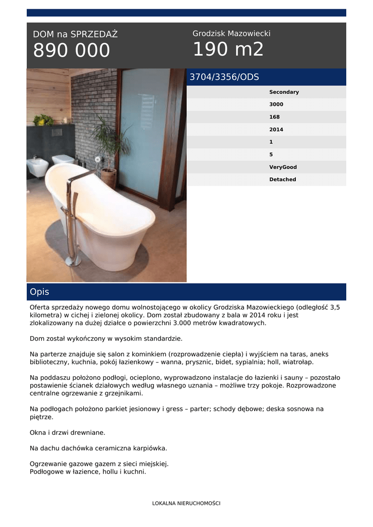 Grodzisk Mazowiecki DOM na SPRZEDAŻ 190 m2 890 000 3704/3356/ODS Secondary 3000 168 2014 1 5 VeryGood Detached Opis Oferta sprzedaży nowego domu wolnostojącego w okolicy Grodziska Mazowieckiego (odległość 3,5 kilometra) w cichej i zielonej okolicy. Dom został zbudowany z bala w 2014 roku i jest zlokalizowany na dużej działce o powierzchni 3.000 metrów kwadratowych. Dom został wykończony w wysokim standardzie. Na parterze znajduje się salon z kominkiem (rozprowadzenie ciepła) i wyjściem na taras, aneks biblioteczny, kuchnia, pokój łazienkowy – wanna, prysznic, bidet, sypialnia; holl, wiatrołap. Na poddaszu położono podłogi, ocieplono, wyprowadzono instalacje do łazienki i sauny – pozostało postawienie ścianek działowych według własnego uznania – możliwe trzy pokoje. Rozprowadzone centralne ogrzewanie z grzejnikami. Na podłogach położono parkiet jesionowy i gress – parter; schody dębowe; deska sosnowa na piętrze. Okna i drzwi drewniane. Na dachu dachówka ceramiczna karpiówka. Ogrzewanie gazowe gazem z sieci miejskiej. Podłogowe w łazience, hollu i kuchni. LOKALNA NIERUCHOMOŚCI Kanalizacja – szambo. Kanalizacja miejska w drodze. Bale we wnętrzu domu wyszlifowane na gładko i zaimpregnowane olejem z woskiem Tikkurila (bezbarwnym, który zachowuje jasny kolor drewna). Bale od zewnątrz zaimpregnowane również olejem Tikkurila. Pokój kąpielowy - wanna wolnostojąca z konglomeratu z baterią stojącą Hans Grohe, natrysk kabina szklana brodzik płaski z konglomeratu, bidet i toaleta Geberit. Umywalka z litego kamienia na granitowym blacie i ręcznie robionej dębowej szafie. Kuchnia otwarta, zabudowana drewnianymi szafkami rzeźbionymi kwiatowymi motywami. Blaty granitowe, kuchnia ceramiczna elektryczna z dodatkowym dwupalnikowym trzonem gazowym. Zabudowana zmywarka. Podjazd, ścieżka do furtki miejsce parkingowe na dwa samochody i taras utwardzony kostką. Garaż blaszany usadowiony na poduszce betonowej z doprowadzoną siłą. Działka na planie prostokąta o wymiarach 50/60 metrów. Ogrodzenie z paneli. Dojazd betonowy. Działka częściowo zalesiona sonami, brzozami i dębami gotowa do aranżacji ogrodu. Do centrum Grodziska Mazowieckiego 3,5 kilometra. Do autostrady A2 7 kilometrów, podobnie do trasy krakowskiej. Okolica cicha, zielona, wyłącznie zabudowa jednorodzinna. W pobliżu komunikacja autobusowa. W swojej ofercie posiadamy wiele podobnych ofert. Prowadzimy pełną, bezpłatną obsługę związaną z uzyskaniem kredytów bankowych na zakup nieruchomości. W celu nawiązania współpracy bardzo prosimy o kontakt. Zapraszamy do kontaktu telefonicznego - dyżur 7 dni w tygodniu do 22.00 pod numerem telefonu agenta prowadzącego i pod numerem 515-500-000. Niniejsza oferta jest informacją handlową i nie może być uznawana za ofertę w rozumieniu art. 66 ustęp 1 Kodeksu Cywilnego. Wojciech Raducha tel. 515-200-004 tel. 22 702 55 55 email: [email protected] LOKALNA NIERUCHOMOŚCI Powered by TCPDF (www.tcpdf.org)