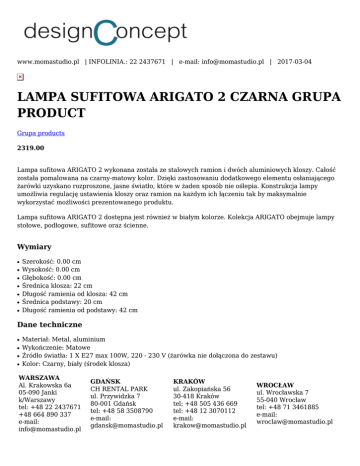 www.momastudio.pl | INFOLINIA.: 22 2437671 | e-mail: [email protected] | 2017-03-04 LAMPA SUFITOWA ARIGATO 2 CZARNA GRUPA PRODUCT Grupa products 2319.00 Lampa sufitowa ARIGATO 2 wykonana została ze stalowych ramion i dwóch aluminiowych kloszy. Całość została pomalowana na czarny-matowy kolor. Dzięki zastosowaniu dodatkowego elementu osłaniającego żarówki uzyskano rozproszone, jasne światło, które w żaden sposób nie oślepia. Konstrukcja lampy umożliwia regulację ustawienia kloszy oraz ramion na każdym ich łączeniu tak by maksymalnie wykorzystać możliwości prezentowanego produktu. Lampa sufitowa ARIGATO 2 dostępna jest również w białym kolorze. Kolekcja ARIGATO obejmuje lampy stołowe, podłogowe, sufitowe oraz ścienne. Wymiary ● ● ● ● ● ● ● Szerokość: 0.00 cm Wysokość: 0.00 cm Głębokość: 0.00 cm Średnica klosza: 22 cm Długość ramienia od klosza: 42 cm Średnica podstawy: 20 cm Długość ramienia od podstawy: 42 cm Dane techniczne ● ● ● ● Materiał: Metal, aluminium Wykończenie: Matowe Źródło światła: 1 X E27 max 100W, 220 - 230 V (żarówka nie dołączona do zestawu) Kolor: Czarny, biały (środek klosza) WARSZAWA Al. Krakowska 6a 05-090 Janki k/Warszawy tel: +48 22 2437671 +48 664 890 337 e-mail: [email protected] GDAŃSK CH RENTAL PARK ul. Przywidzka 7 80-001 Gdańsk tel: +48 58 3508790 e-mail: [email protected] KRAKÓW ul. Zakopiańska 56 30-418 Kraków tel: +48 505 436 669 tel: +48 12 3070112 e-mail: [email protected] WROCŁAW ul. Wrocławska 7 55-040 Wrocław tel: +48 71 3461885 e-mail: [email protected]