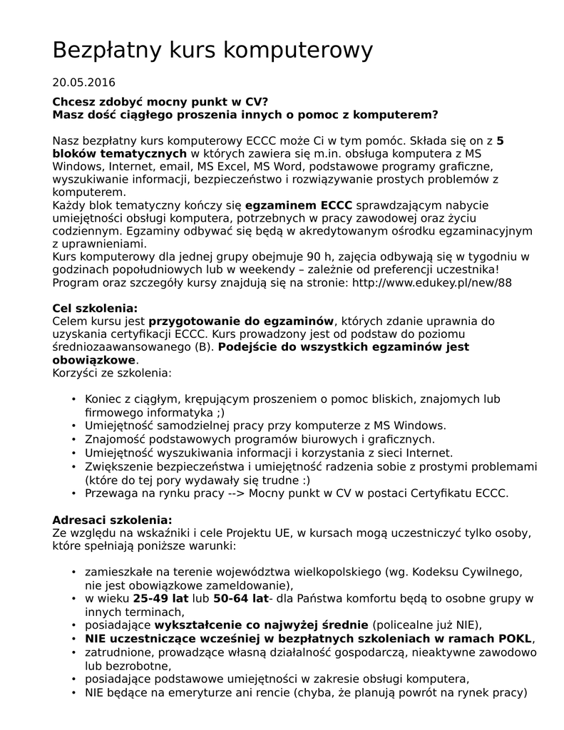 Bezpłatny kurs komputerowy 20.05.2016 Chcesz zdobyć mocny punkt w CV? Masz dość ciągłego proszenia innych o pomoc z komputerem? Nasz bezpłatny kurs komputerowy ECCC może Ci w tym pomóc. Składa się on z 5 bloków tematycznych w których zawiera się m.in. obsługa komputera z MS Windows, Internet, email, MS Excel, MS Word, podstawowe programy graficzne, wyszukiwanie informacji, bezpieczeństwo i rozwiązywanie prostych problemów z komputerem. Każdy blok tematyczny kończy się egzaminem ECCC sprawdzającym nabycie umiejętności obsługi komputera, potrzebnych w pracy zawodowej oraz życiu codziennym. Egzaminy odbywać się będą w akredytowanym ośrodku egzaminacyjnym z uprawnieniami. Kurs komputerowy dla jednej grupy obejmuje 90 h, zajęcia odbywają się w tygodniu w godzinach popołudniowych lub w weekendy – zależnie od preferencji uczestnika! Program oraz szczegóły kursy znajdują się na stronie: http://www.edukey.pl/new/88 Cel szkolenia: Celem kursu jest przygotowanie do egzaminów, których zdanie uprawnia do uzyskania certyfikacji ECCC. Kurs prowadzony jest od podstaw do poziomu średniozaawansowanego (B). Podejście do wszystkich egzaminów jest obowiązkowe. Korzyści ze szkolenia: • Koniec z ciągłym, krępującym proszeniem o pomoc bliskich, znajomych lub firmowego informatyka ;) • Umiejętność samodzielnej pracy przy komputerze z MS Windows. • Znajomość podstawowych programów biurowych i graficznych. • Umiejętność wyszukiwania informacji i korzystania z sieci Internet. • Zwiększenie bezpieczeństwa i umiejętność radzenia sobie z prostymi problemami (które do tej pory wydawały się trudne :) • Przewaga na rynku pracy --> Mocny punkt w CV w postaci Certyfikatu ECCC. Adresaci szkolenia: Ze względu na wskaźniki i cele Projektu UE, w kursach mogą uczestniczyć tylko osoby, które spełniają poniższe warunki: • zamieszkałe na terenie województwa wielkopolskiego (wg. Kodeksu Cywilnego, nie jest obowiązkowe zameldowanie), • w wieku 25-49 lat lub 50-64 lat- dla Państwa komfortu będą to osobne grupy w innych terminach, • posiadające wykształcenie co najwyżej średnie (policealne już NIE), • NIE uczestniczące wcześniej w bezpłatnych szkoleniach w ramach POKL, • zatrudnione, prowadzące własną działalność gospodarczą, nieaktywne zawodowo lub bezrobotne, • posiadające podstawowe umiejętności w zakresie obsługi komputera, • NIE będące na emeryturze ani rencie (chyba, że planują powrót na rynek pracy) Załączniki Ogłoszenie2.pdf