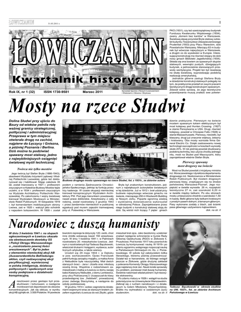 I 31.03.2011 r. Rok IX, nr 1 (32) ISSN 1730-9581 Marzec 2011 Sprzedaż łącznie z Nowym Łowiczaninem i Wieściami z Głowna i Strykowa PKO (1931), czy też sześciopiętrowy budynek Funduszu Kwaterunku Wojskowego (1934), zwany „domem bez kantów” w Warszawie. Światową sławę przyniósł Bryle stalowy szkielet budynku Towarzystwa Ubezpieczeniowego Prudential (1933) przy Placu Wareckim, dziś Powstańców Warszawy. Mierzący 63 m budynek był wówczas najwyższym w Warszawie, a drugim co do wysokości w Europie. Interesującą konstrukcję ma również stojący do dziś nowy gmach Biblioteki Jagiellońskiej (1934). Składa się ona bowiem ze spawanych słupów stalowych, wewnątrz pustych, dźwigających budynek, a jednocześnie stanowiących przewody wentylacyjne. Projekt ten był rewelacją na skalę światową, wyprzedzając podobną realizację amerykańską. Jednakże główne zasługi Stefana Bryły w dziedzinie konstrukcji stalowych polegały na tym, że praktycznie przetarł on swymi pracami teoretycznymi drogę konstrukcjom spawanym. Zdawał sobie sprawę, że jego teoretyczne przewidywania muszą znaleźć swe potwier- Mosty na rzece Słudwi Dolina Słudwi przy ujściu do Bzury od wieków pełniła rolę ważnej granicy strategicznej, politycznej i administracyjnej. Przeprawa w tym miejscu otwierała drogę na zachód, najpierw do Łęczycy i Gniezna, a później Poznania i Berlina. Dziś można tu podziwiać spawany most stalowy, jedno z najwybitniejszych osiągnięć światowej myśli technicznej. dzenie praktyczne. Pierwszym na świecie mostem spawanym łukiem elektrycznym był most kolejowy pod Hunten Crossing (1927) w stanie Pensylwania w USA. Drugi, również kolejowy, powstał w Chicopee Falls (1928) w stanie Massachussets. Pierwszy, niewielki, był blaszany, drugi już znacznie większy, żelazny i kratowany. Oba mosty wzniosła firma General Electric Co. Dzięki zastosowaniu nowej technologii oszczędności w kosztach wynosiły około 20%. W rok później powstał zbudowany podobną techniką, bez użycia choćby jednego nitu, most na Słudwi pod Maurzycami, który zaprojektował właśnie Stefan Bryła. Pierwszy spawany most drogowy na świecie Twórca nie tylko mostów Jego twórcą był Stefan Bryła (1886-1943), absolwent Wydziału Inżynierii Lądowej i Wodnej Politechniki Lwowskiej, gdzie też doktoryzował się i habilitował. Mając zaledwie 35 lat, został mianowany w 1921 r. profesorem zwyczajnym w Katedrze Budowy Mostów tejże uczelni, a w 1934 r. profesorem zwyczajnym na Wydziale Architektury Politechniki Warszawskiej. Po zakończeniu I wojny światowej kierował Wydziałem Mostowym w Ministerstwie Robót Publicznych. W listopadzie 1919 r. był komendantem mobilizacyjnym obrony Lwowa, zaś w 1920 r. walczył jako ochotnik z najazdem bolszewickim. W 1928 r. został Budowa drugiego mostu spawanego na rzece Słudwi, fot. z 1931r., ze zbiorów autora posłem z ramienia Zjednoczenia Chrześcijańsko-Społecznego, pełniąc tę funkcję przez trzy kadencje. W czasie okupacji niemieckiej kierował konspiracyjnym Wydziałem Architektury PW. Pod jego kierunkiem powstawały nawet prace doktorskie. Aresztowany z całą rodziną, został rozstrzelany 3 grudnia 1943 r. przez żandarmów niemieckich w publicznej egzekucji pod murem zajezdni tramwajowej przy ul. Puławskiej w Warszawie. Bryła był znakomitym konstruktorem, jednym z największych autorytetów światowych w tej dziedzinie. Już w 1912 r. brał udział przy budowie najwyższego wówczas gmachu na świecie, mierzącego 250 m Woolworth Building w Nowym Jorku. Poparte ogromną wiedzą i wyobraźnią doświadczenia wykorzystał w odrodzonej Polsce. Zaprojektowane przez niego budynki o konstrukcji stalowej stoją do dziś. Są wśród nich liczący 7 pięter gmach Narodowiec z duszą humanisty W dniu 3 kwietnia 1941 r. na słupach ogłoszeniowych w Łowiczu ukazało się obwieszczenie dowódcy SS i Policji Okręgu Warszawskiego o „rozstrzelaniu pewnej ilości aresztowanych”. Był to jeden z elementów niemieckiej akcji AB (Ausserordentliche Befriedungsaktion, czyli nadzwyczajnej akcji pacyfikacyjnej), wymierzonej w polską inteligencję, działaczy politycznych i społecznych oraz osoby podejrzane o działalność konspiracyjną. A resztowani przez gestapo byli przesłuchiwani i torturowani, a następnie mordowani lub deportowani do obozów koncentracyjnych. Jak się oblicza, w wyniku akcji AB zginęło ok. 3.500 Polaków. W powiecie łowickim represje te dotyczyły 120. osób, choć inne źródła wskazują nawet 150 aresztowanych. W dniu 1 kwietnia 1941 r. w Palmirach rozstrzelano 20. mieszkańców Łowicza. Jednym z rozstrzelanych był Tadeusz Bączkowski, właściciel drukarni i księgarni, wydawca, autor licznych artykułów, a także wierszy. Urodził się 29 maja 1904 r. w Dębsku w pow. sochaczewskim. Ojciec Franciszek pełnił funkcję zarządcy majątku, a matka Anna z Niebudków była nauczycielką. Miał dwóch starszych braci - Jana i Józefa oraz młodszą siostrę Annę. Wspólnie z rodzeństwem zamieszkiwał z matką w Łowiczu w domu swojej babci Katarzyny Niebudek, z domu Lenkiewicz, przy ulicy Podrzecznej 3. Uczęszczał do klasy przedwstępnej tzw. „freblówki”, prowadzonej przez Jadwigę Starzyńską, a następnie do szkoły podstawowej. W grudniu 1914 r. wobec zagrożenia działaniami wojennymi wraz ze starszym bratem Józefem wyjechał z Łowicza do wsi Zbytki, gdzie Most na Słudwi powstał z inicjatywy ministra inż. Moraczewskiego i dyrektora departamentu drogowego inż. Nestorowicza w Ministerstwie Robót Publicznych. Był mostem drogowym pierwszej klasy, znajdującym się na drodze państwowej Warszawa-Poznań. Jego rozpiętość w świetle wynosiła 26 m, rozpiętość teoretyczna 27 m, zaś szerokość 6,20 m w świetle między belkami. Po obu stronach mostu umieszczono chodnik o szerokości 1,50 m każdy. Belki główne były belkami kratowymi z prostym pasem dolnym