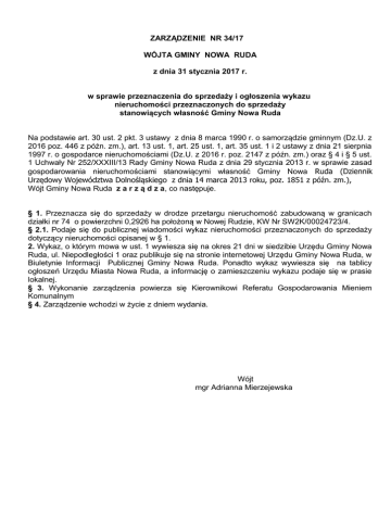 ZARZĄDZENIE NR 34/17 WÓJTA GMINY NOWA RUDA z dnia 31 stycznia 2017 r. w sprawie przeznaczenia do sprzedaży i ogłoszenia wykazu nieruchomości przeznaczonych do sprzedaży stanowiących własność Gminy Nowa Ruda Na podstawie art. 30 ust. 2 pkt. 3 ustawy z dnia 8 marca 1990 r. o samorządzie gminnym (Dz.U. z 2016 poz. 446 z późn. zm.), art. 13 ust. 1, art. 25 ust. 1, art. 35 ust. 1 i 2 ustawy z dnia 21 sierpnia 1997 r. o gospodarce nieruchomościami (Dz.U. z 2016 r. poz. 2147 z późn. zm.) oraz § 4 i § 5 ust. 1 Uchwały Nr 252/XXXIII/13 Rady Gminy Nowa Ruda z dnia 29 stycznia 2013 r. w sprawie zasad gospodarowania nieruchomościami stanowiącymi własność Gminy Nowa Ruda (Dziennik Urzędowy Województwa Dolnośląskiego z dnia 14 marca 2013 roku, poz. 1851 z późn. zm.), Wójt Gminy Nowa Ruda z a r z ą d z a, co następuje. § 1. Przeznacza się do sprzedaży w drodze przetargu nieruchomość zabudowaną w granicach działki nr 74 o powierzchni 0,2926 ha położoną w Nowej Rudzie, KW Nr SW2K/00024723/4. § 2.1. Podaje się do publicznej wiadomości wykaz nieruchomości przeznaczonych do sprzedaży dotyczący nieruchomości opisanej w § 1. 2. Wykaz, o którym mowa w ust. 1 wywiesza się na okres 21 dni w siedzibie Urzędu Gminy Nowa Ruda, ul. Niepodległości 1 oraz publikuje się na stronie internetowej Urzędu Gminy Nowa Ruda, w Biuletynie Informacji Publicznej Gminy Nowa Ruda. Ponadto wykaz wywiesza się na tablicy ogłoszeń Urzędu Miasta Nowa Ruda, a informację o zamieszczeniu wykazu podaje się w prasie lokalnej. § 3. Wykonanie zarządzenia powierza się Kierownikowi Referatu Gospodarowania Mieniem Komunalnym § 4. Zarządzenie wchodzi w życie z dniem wydania. Wójt mgr Adrianna Mierzejewska Załącznik do Zarządzenia Wójta Gminy Nowa Ruda Nr 34/17 z dnia 31.01.2017 r. Wykaz nieruchomości przeznaczonych do sprzedaży Wykaz wywiesza się na okres od dnia 31.01.2017 r. do dnia 21.02.2017 r. Położenie nieruchomości Numer działki Powierzchnia ogólna nieruchomości Nr księgi wieczystej Nowa Ruda ul. Kopernika 10 74 M-1 0,2926 ha SW2K/00024723/4 Opis nieruchomości, przeznaczenie, sposób zagospodarowania Nieruchomość gruntowa zabudowana w granicach działki nr 74 (B) o powierzchni 0,2926 ha, Obręb Nowa Ruda, AM-1. Działka o kształcie regularnym, położona na terenie ze spadkiem, ogrodzona, przy drodze wojewódzkiej – działka nr 350/1. Zabudowę działki stanowi budynek o charakterze użytkowym, wolnostojący, dwukondygnacyjny, z poddaszem użytkowym i z podpiwniczeniem; rok budowy 1886. Powierzchnia użytkowa budynku wynosi: powierzchnia piwnic: 169,15 m2, powierzchnia parteru: 184,51 m2, powierzchnia piętra 154,46 m2, powierzchnia poddasza: 115,94 m2, powierzchnia strychu: 41,17 m2. Budynek figuruje w wykazie zabytków oraz jest zlokalizowany w obszarze historycznego układu urbanistycznego miasta Nowa Ruda, figurującego w wykazie obszarów zabytkowych. Obiekt podlega ochronie prawnej w myśl art. 6 ust. 1 pkt 1 lit. b oraz c ustawy z dnia 23 lipca 2003 r. o ochronie zabytków i opiece nad zabytkami. Przedmiotowy obiekt nie jest wpisany indywidualnie do rejestru zabytków. Zgodnie z Miejscowym Planem Zagospodarowania Przestrzennego dla Centrum Miasta w obrębie obszaru objętego ochroną konserwatorską w Nowej Rudzie działka znajduje się w następującej jednostce funkcjonalnej: dz. nr 74, Obr. 3, AM-1 – symbol 2UE, położona w strefie „K” – ochrony konserwatorskiej krajobrazu kulturowego. Tereny kategorii oznaczonej symbolem UE przeznaczone są na usługi ochrony zdrowia, edukacji, kultury, opieki nad dziećmi, opieki społecznej, sportu, rekreacji i turystyki oraz nie wymienionych wcześniej obiektów zbiorowego zamieszkania. Forma przeznaczenia do sprzedaży Cena nieruchomości przetarg 620.000,00 zł Osoby, którym przysługuje pierwszeństwo w nabyciu nieruchomości na podstawie art. 34 ust. 1 pkt. 1 i 2 ustawy o gospodarce nieruchomościami, tj.: 1. osoby, którym przysługuje roszczenie o nabycie nieruchomości z mocy ustawy o gospodarce nieruchomościami lub odrębnych przepisów, osoby, które są poprzednimi właścicielami zbywanej nieruchomości pozbawionymi prawa jej własności przed dniem 05.12.1990 r., albo ich spadkobiercami - korzystają z tego pierwszeństwa, jeżeli złożą wniosek o nabycie w ciągu 6 tygodni licząc od dnia wywieszenia wykazu. Do wiadomości: 1. Urząd Miasta Nowa Ruda - do ogłoszenia na tablicy ogłoszeń 2. Prasa lokalna www.otoprzetargi.pl 3. a/a Wójt mgr Adrianna Mierzejewska