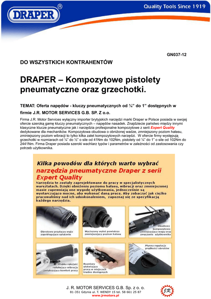GN037-12 DO WSZYSTKICH KONTRAHENTÓW DRAPER – Kompozytowe pistolety pneumatyczne oraz grzechotki. TEMAT: Oferta napędów - kluczy pneumatycznych od ¼” do 1” dostępnych w firmie J.R. MOTOR SERVICES G.B. SP. Z o.o. Firma J.R. Motor Services wyłączny importer brytyjskich narzędzi marki Draper w Polsce posiada w swojej ofercie szeroką gamę kluczy pneumatycznych – napędów nasadek. Znajdziecie państwo między innymi klasyczne klucze pneumatyczne jak i narzędzia profesjonalne kompozytowe z serii Expert Quality dedykowane dla mechaników. Kompozytowa obudowa o obniżonej wadze, zmniejszony poziom hałasu, zminiejszony poziom wibracji to tylko kilka zalet kompozytowych narzędzi. W ofercie firmy występują grzechotki w rozmiarach od ¼” do ½” o sile od 41Nm do 102Nm, pistolety od ¼” do 1” o sile od 102Nm do 2441Nm. Firma Draper posiada szeroki wachlarz typów i parametrów w zależności od zastosowania czy potrzeb użytkownika. J. R. MOTOR SERVICES G.B. Sp. z o. o. 81-351 Gdynia ul. T. WENDY 15 tel. 58 661 25 87 www.jrmotors.pl Pistolet pneumatyczny ¼” - nr kat. 14256 Specyfikacja: Maksymalny moment obrotowy – 102Nm Rozmiar - ¼” Prędkość (bez obciążenia) – 11,000r/min Robocze ciśnienie powietrza - 90psi (6.2bar) Poziom hałasu – 82.0 / 90.0 dB(A) Średnie zużycie powietrza - 4cfm (114L/min) Poziom wibracji – 5,2 m/s² Waga – 1 kg Pistolet pneumatyczny ⅜” - nr kat. 14257 Specyfikacja: Maksymalny moment obrotowy – 136Nm Rozmiar - ⅜” Prędkość (bez obciążenia) – 11,000r/min Robocze ciśnienie powietrza - 90psi (6.2bar) Poziom hałasu – 82.0 / 90.0 dB(A) Średnie zużycie powietrza - 4cfm (114L/min) Poziom wibracji – 5,2 m/s² Waga – 1 kg Pistolet pneumatyczny ⅜” - nr kat. 43326 Specyfikacja: Maksymalny moment obrotowy – 271Nm Rozmiar - ⅜” Prędkość (bez obciążenia) – 9,000r/min Robocze ciśnienie powietrza - 90psi (6.2bar) Poziom hałasu – 77.0 / 89.0 dB(A) Średnie zużycie powietrza – 4,4cfm (125L/min) Poziom wibracji – 3,9 m/s² Waga – 1,2 kg Pistolet pneumatyczny ½” - nr kat. 43327 Specyfikacja: Maksymalny moment obrotowy – 325Nm Rozmiar - ½” Prędkość (bez obciążenia) – 11,000r/min Robocze ciśnienie powietrza - 90psi (6.2bar) Poziom hałasu – 77.0 / 89.0 dB(A) Średnie zużycie powietrza – 4,0cfm (114L/min) Poziom wibracji – 3,9 m/s² Waga – 1,2 kg J. R. MOTOR SERVICES G.B. Sp. z o. o. 81-351 Gdynia ul. T. WENDY 15 tel. 58 661 25 87 www.jrmotors.pl Pistolet pneumatyczny ½” - nr kat. 41096 Specyfikacja: Maksymalny moment obrotowy – 813Nm Rozmiar - ½” Prędkość (bez obciążenia) – 7,000r/min Robocze ciśnienie powietrza - 90psi (6.2bar) Poziom hałasu – 89.0 / 93.0 dB(A) Średnie zużycie powietrza – 4,4cfm (125L/min) Poziom wibracji – 2,8 m/s² Waga – 2,2 kg Pistolet pneumatyczny ¾” - nr kat. 48413 Specyfikacja: Maksymalny moment obrotowy – 1627Nm Rozmiar - ¾” Prędkość (bez obciążenia) – 5,500r/min Robocze ciśnienie powietrza - 90psi (6.2bar) Poziom hałasu – 84.0 / 94.0 dB(A) Średnie zużycie powietrza – 6,0cfm (170L/min) Poziom wibracji – 10,2 m/s² Waga – 3,4 kg Pistolet pneumatyczny 1” - nr kat. 14211 Specyfikacja: Maksymalny moment obrotowy – 1898Nm Rozmiar - 1” Prędkość (bez obciążenia) – 5,500r/min Robocze ciśnienie powietrza - 90psi (6.2bar) Poziom hałasu – 84.0 / 94.0 dB(A) Średnie zużycie powietrza – 7,0cfm (178L/min) Poziom wibracji – 10,2 m/s² Waga – 4,3 kg Pistolet pneumatyczny 1” - nr kat. 22412 Specyfikacja: Maksymalny moment obrotowy – 2441Nm Rozmiar - 1” Prędkość (bez obciążenia) – 6,000r/min Robocze ciśnienie powietrza - 90psi (6.2bar) Poziom hałasu – 90.0 / 96.0 dB(A) Średnie zużycie powietrza – 10,0cfm (283L/min) Poziom wibracji – 11,3 m/s² Waga – 7,2 kg J. R. MOTOR SERVICES G.B. Sp. z o. o. 81-351 Gdynia ul. T. WENDY 15 tel. 58 661 25 87 www.jrmotors.pl Grzechotka pneumatyczna ¼” - nr kat. 14199 Specyfikacja: Maksymalny moment obrotowy – 41Nm Rozmiar - ¼” Prędkość (bez obciążenia) – 350r/min Robocze ciśnienie powietrza - 90psi (6.2bar) Poziom hałasu – 85.0 / 96.0 dB(A) Średnie zużycie powietrza – 4,0cfm (114L/min) Poziom wibracji – 2,6 m/s² Waga – 400 g Grzechotka pneumatyczna ⅜” - nr kat. 14210 Specyfikacja: Maksymalny moment obrotowy – 41Nm Rozmiar - ⅜” Prędkość (bez obciążenia) – 350r/min Robocze ciśnienie powietrza - 90psi (6.2bar) Poziom hałasu – 85.0 / 96.0 dB(A) Średnie zużycie powietrza – 4,0cfm (114L/min) Poziom wibracji – 2,6 m/s² Waga – 400 g Grzechotka pneumatyczna ⅜” - nr kat. 47568 Specyfikacja: Maksymalny moment obrotowy – 68Nm Rozmiar - ⅜” Prędkość (bez obciążenia) – 150r/min Robocze ciśnienie powietrza - 90psi (6.2bar) Poziom hałasu – 85.0 / 96.0 dB(A) Średnie zużycie powietrza – 4,0cfm (114L/min) Poziom wibracji – 2,6 m/s² Waga – 1,2 kg Grzechotka pneumatyczna ½” - nr kat. 41099 Specyfikacja: Maksymalny moment obrotowy – 68Nm Rozmiar - ½” Prędkość (bez obciążenia) – 150r/min Robocze ciśnienie powietrza - 90psi (6.2bar) Poziom hałasu – 85.0 / 96.0 dB(A) Średnie zużycie powietrza – 4,0cfm (114L/min) Poziom wibracji – 2,6 m/s² Waga – 1,2 kg J. R. MOTOR SERVICES G.B. Sp. z o. o. 81-351 Gdynia ul. T. WENDY 15 tel. 58 661 25 87 www.jrmotors.pl Grzechotka pneumatyczna ½” - nr kat. 22413 Specyfikacja: Maksymalny moment obrotowy – 102Nm Rozmiar - ½” Prędkość (bez obciążenia) – 400r/min Robocze ciśnienie powietrza - 90psi (6.2bar) Poziom hałasu – 90.0 / 96.0 dB(A) Średnie zużycie powietrza – 4,0cfm (114L/min) Poziom wibracji – 15,3 m/s² Waga – 1,28 kg Kompozytowe narzędzia Draper z serii Expert Quality charakteryzują się bardzo dobrym stosunkiem mocy do masy. Niski poziom hałasu, wibracji, wysoki moment obrotowy oraz obniżona masa w stosunku do konwencjonalnych narzędzi pneumatycznych to ich główne a