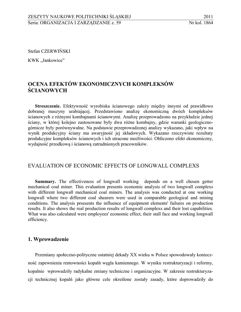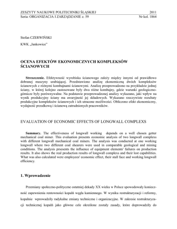 ZESZYTY NAUKOWE POLITECHNIKI ŚLĄSKIEJ Seria: ORGANIZACJA I ZARZĄDZANIE z. 59 2011 Nr kol. 1864 Stefan CZERWIŃSKI KWK „Jankowice” OCENA EFEKTÓW EKONOMICZNYCH KOMPLEKSÓW ŚCIANOWYCH Streszczenie. Efektywność wyrobiska ścianowego zależy między innymi od prawidłowo dobranej maszyny urabiającej. Przedstawiono analizę ekonomiczną dwóch kompleksów ścianowych z różnymi kombajnami ścianowymi. Analizę przeprowadzono na przykładzie jednej ściany, w której kolejno zastosowane były dwa różne kombajny, gdzie warunki geologicznogórnicze były porównywalne. Na podstawie przeprowadzonej analizy wykazano, jaki wpływ na wynik produkcyjny ściany ma awaryjność jej składowych. Wykazano rzeczywiste rezultaty produkcyjne kompleksów ścianowych i ich utracone możliwości. Obliczono efekt ekonomiczny, wydajność przodkową i ścianową zatrudnionych pracowników. EVALUATION OF ECONOMIC EFFECTS OF LONGWALL COMPLEXS Summary. The effectiveness of longwall working depends on a well chosen getter mechanical coal miner. This evaluation presents economic analysis of two longwall complexs with different longwall mechanical coal miners. The analysis was conducted at one working longwall where two different coal shearers were used in comparable geological and mining conditions. The analysis prsesents the influence of equipment elements' failures on production results. It also shows the real production results of longwall complexs and their lost capabilities. What was also calculated were employees' economic effect, their stall face and working longwall efficiency. 1. Wprowadzenie Przemiany społeczno-polityczne ostatniej dekady XX wieku w Polsce spowodowały konieczność zapewnienia rentowności kopalń węgla kamiennego. W wyniku restrukturyzacji i reformy, kopalnie wprowadziły radykalne zmiany techniczne i organizacyjne. W zakresie restrukturyzacji technicznej kopalń jako główne cele określone zostały zasady, które doprowadziły do S. Czerwiński 220 tzw. koncentracji wydobycia, polegającej na wydłużeniu wybiegów ścian do około 2 tys., wzroście długości przodków ścianowych do około 300 m, i planowanego wydobycia z przodka rzędu 5-8 tys. Mg/d. Osiągnięcie tak założonego celu technicznego jest możliwe przy zwróceniu szczególnej uwagi na następujące zagadnienia: zapewnienie wysokiej niezawodności wyposażenia technicznego przodków ścianowych i pozaprzodkowych środków odstawy, zwiększenie wydajności zastosowanych maszyn, co pociąga za sobą między innymi zwiększenie mocy maszyn, zapewnienie odpowiedniego tempa robót przygotowawczych, dostosowanego do wymaganego postępu frontu ścianowego, poprawa efektywności poprzez zmniejszenie ilości miału, a tym samym zwiększenie ilości grubych sortymentów urobku, poprawa czystości wybierania, w szczególności w odniesieniu do pokładów cienkich, co wpływa na obniżkę kosztów przeróbki mechanicznej węgla i transportu, doskonaleniu systemów odmetanowania złoża, w celu umożliwienia uzyskania żądanego wydobycia dobowego, gospodarowanie złożem umożliwiające zrealizowanie celu technicznego. Zapewnienie wysokiej niezawodności wyposażenia technicznego i zwiększenie wydajności zastosowanych maszyn w dużym stopniu zależy od potencjalnej wydajności maszyny urabiającej, co bezpośrednio ma wpływ na efektywność zaprojektowanego systemu mechanizacyjnego. W tym celu kopalnie stosują kombajny ścianowe, mogące sprostać tym oczekiwaniom [1, 3, 4]. W artykule przeanalizowano wyniki produkcyjne uzyskane w wyrobisku ścianowym, w jednym z zakładów Kompani Węglowej S.A. Źródłem danych do analizy były książki raportowe działu Głównego Mechanika ds. dołu, raporty dzienne dyspozytora głównego kopalni, Dokumentacje Techniczno-Ruchowe maszyn oraz Projekt Techniczny Ściany. W materiałach tych zawarte są dane dotyczące wyposażenia technicznego, warunków urabiania oraz zagrożeń w ścianie, gdzie pracowały kombajny w czasie objętym analizą oraz wyniki produkcyjne (wydobycie). Ponadto, uwzględniono udziały procentowe poszczególnych rodzajów awarii, a także utracone z tego tytułu możliwości wydobywcze. Analizę przeprowadzono na przykładzie jednej ściany, gdzie na Ocena efektów ekonomicznych kompleksów ścianowych 221 jej wybiegu nie wystąpiły znaczące zmiany warunków górniczo-geologicznych, a w której kolejno stosowane były dwa różne kombajny („K” oraz „E”). 2. Charakterystyki techniczne i warunki zastosowania kombajnów 2.1. Charakterystyka techniczna ściany Wyrobisko ścianowe prowadzone było z pełnym zawałem stropu, długość ściany wynosiła 297 m, wybieg 2680 m, natomiast kąt nachylenia pokładu kształtował się między 9-22 stopniami [7]. Parametry techniczne ściany przedstawiono w tabeli 1 [7]. Tabela 1 Zestawienie parametrów ściany oraz warunków geologiczno-górniczych 3 4 5 6 Parametry ściany Suma dni roboczych Dobowy czas pobytu załogi produkcyjnej w ścianie Długość ściany Miąższość pokładu Przerosty łupku Nachylenie pokładu 7 Wybieg ściany 8 Wskaźnik zwięzłości węgla Wytrzymałość skał stropowych Rc Wytrzymałość węgla Rc Zagrożenie uskokami Zagrożenie metanowe Zagrożenie wodne Zagrożenie tąpaniami Zagrożenie pożarem endogenicznym Zagrożenie uskoków i zrzutów skał Kierowanie stropem Typ węgla Zapopielenie węgla Planowane wydobycie Lp. 1 2 9 10 11 12 13 14 15 16 17 18 19 20 Wielkości 84 dni Jednostki [dni] 19,5 godz. [godz.] 297 1,60-2,80 do-0,5 9-22 2680 – Kombajn „K” 2400 – Kombajn „E” 0,90 [m] [m] [m] [o] 20-36 [MPa] 8,0-18 0,3-2,0 III I stopień nie występuje III grupa samozapalności [MPa] [m] [kategoria] [stopień] [kategoria] 0,3 do 2,0 [m] pełny zawał 34 5-18 5000 [rodzaj] [klasa] [%] [Mg/d.] [m] [f] [grupa] S. Czerwiński 222 2.2. Wyposażenie techniczne ściany Wyposażenie techniczne ściany, w której pracował kombajn „K”, przedstawiało się następ