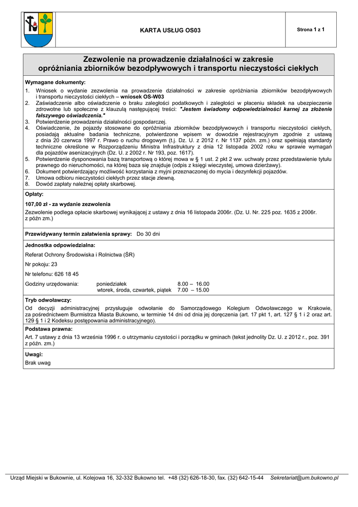 KARTA USŁUG OS03 Strona 1 z 1 Zezwolenie na prowadzenie działalności w zakresie opróżniania zbiorników bezodpływowych i transportu nieczystości ciekłych Wymagane dokumenty: 1. 2. 3. 4. 5. 6. 7. 8. Wniosek o wydanie zezwolenia na prowadzenie działalności w zakresie opróżniania zbiorników bezodpływowych i transportu nieczystości ciekłych – wniosek OS-W03 Zaświadczenie albo oświadczenie o braku zaległości podatkowych i zaległości w płaceniu składek na ubezpieczenie zdrowotne lub społeczne z klauzulą następującej treści: "Jestem świadomy odpowiedzialności karnej za złożenie fałszywego oświadczenia." Potwierdzenie prowadzenia działalności gospodarczej. Oświadczenie, że pojazdy stosowane do opróżniania zbiorników bezodpływowych i transportu nieczystości ciekłych, posiadają aktualne badania techniczne, potwierdzone wpisem w dowodzie rejestracyjnym zgodnie z ustawą z dnia 20 czerwca 1997 r. Prawo o ruchu drogowym (t.j. Dz. U. z 2012 r. Nr 1137 późn. zm.) oraz spełniają standardy techniczne określone w Rozporządzeniu Ministra Infrastruktury z dnia 12 listopada 2002 roku w sprawie wymagań dla pojazdów asenizacyjnych (Dz. U. z 2002 r. Nr 193, poz. 1617). Potwierdzenie dysponowania bazą transportową o której mowa w § 1 ust. 2 pkt 2 ww. uchwały przez przedstawienie tytułu prawnego do nieruchomości, na której baza się znajduje (odpis z księgi wieczystej, umowa dzierżawy). Dokument potwierdzający możliwość korzystania z myjni przeznaczonej do mycia i dezynfekcji pojazdów. Umowa odbioru nieczystości ciekłych przez stacje zlewną. Dowód zapłaty należnej opłaty skarbowej. Opłaty: 107,00 zł - za wydanie zezwolenia Zezwolenie podlega opłacie skarbowej wynikającej z ustawy z dnia 16 listopada 2006r. (Dz. U. Nr. 225 poz. 1635 z 2006r. z późn zm.) Przewidywany termin załatwienia sprawy: Do 30 dni Jednostka odpowiedzialna: Referat Ochrony Środowiska i Rolnictwa (ŚR) Nr pokoju: 23 Nr telefonu: 626 18 45 Godziny urzędowania: poniedziałek wtorek, środa, czwartek, piątek 8.00 – 16.00 7.00 – 15.00 Tryb odwoławczy: Od decyzji administracyjnej przysługuje odwołanie do Samorządowego Kolegium Odwoławczego w Krakowie, za pośrednictwem Burmistrza Miasta Bukowno, w terminie 14 dni od dnia jej doręczenia (art. 17 pkt 1, art. 127 § 1 i 2 oraz art. 129 § 1 i 2 Kodeksu postępowania administracyjnego). Podstawa prawna: Art. 7 ustawy z dnia 13 września 1996 r. o utrzymaniu czystości i porządku w gminach (tekst jednolity Dz. U. z 2012 r., poz. 391 z późn. zm.) Uwagi: Brak uwag Urząd Miejski w Bukownie, ul. Kolejowa 16, 32-332 Bukowno tel. +48 (32) 626-18-30, fax. (32) 642-15-44 [email protected]