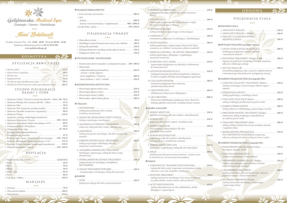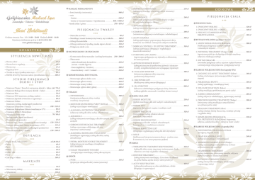 • • • • • • Henna całość Henna brwi z regulacją Henna rzęs Regulacja brwi Trwała na rzęsy (podkręcanie rzęs) BLINK & GO by Nouveau Lashes (przedłużanie rzęs) 45 zł 30 zł 25 zł 15 zł 80 zł 200 zł M A SA ŻE M A NUA LNE R EH A BIL I T AC J A T ER MOT ER A PI A KONSULTACJA LEKARSKA K INEZ Y T ER A PI A H Y DROT ER A PI A FIZ Y KOT ER A PI A SOLARIUM - ERGOLINA EXCELLENCE 800 OPALENIZNA BEZ SŁOŃCA Air Brusch - natryskowe opalanie ciała 2 zł/1min 120 zł