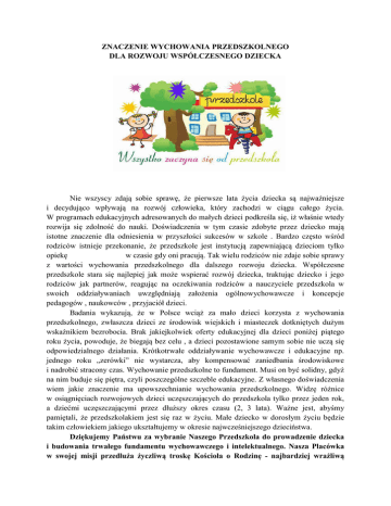 ZNACZENIE WYCHOWANIA PRZEDSZKOLNEGO DLA ROZWOJU WSPÓŁCZESNEGO DZIECKA Nie wszyscy zdają sobie sprawę, że pierwsze lata życia dziecka są najważniejsze i decydująco wpływają na rozwój człowieka, który zachodzi w ciągu całego życia. W programach edukacyjnych adresowanych do małych dzieci podkreśla się, iż właśnie wtedy rozwija się zdolność do nauki. Doświadczenia w tym czasie zdobyte przez dziecko mają istotne znaczenie dla odniesienia w przyszłości sukcesów w szkole . Bardzo często wśród rodziców istnieje przekonanie, że przedszkole jest instytucją zapewniającą dzieciom tylko opiekę w czasie gdy oni pracują. Tak wielu rodziców nie zdaje sobie sprawy z wartości wychowania przedszkolnego dla dalszego rozwoju dziecka. Współczesne przedszkole stara się najlepiej jak może wspierać rozwój dziecka, traktując dziecko i jego rodziców jak partnerów, reagując na oczekiwania rodziców a nauczyciele przedszkola w swoich oddziaływaniach uwzględniają założenia ogólnowychowawcze i koncepcje pedagogów , naukowców , przyjaciół dzieci. Badania wykazują, że w Polsce wciąż za mało dzieci korzysta z wychowania przedszkolnego, zwłaszcza dzieci ze środowisk wiejskich i miasteczek dotkniętych dużym wskaźnikiem bezrobocia. Brak jakiejkolwiek oferty edukacyjnej dla dzieci poniżej piątego roku życia, powoduje, że biegają bez celu , a dzieci pozostawione samym sobie nie uczą się odpowiedzialnego działania. Krótkotrwałe oddziaływanie wychowawcze i edukacyjne np. jednego roku „zerówki” nie wystarcza, aby kompensować zaniedbania środowiskowe i nadrobić stracony czas. Wychowanie przedszkolne to fundament. Musi on być solidny, gdyż na nim buduje się piętra, czyli poszczególne szczeble edukacyjne. Z własnego doświadczenia wiem jakie znaczenie ma upowszechnianie wychowania przedszkolnego. Widzę różnice w osiągnięciach rozwojowych dzieci uczęszczających do przedszkola tylko przez jeden rok, a dziećmi uczęszczającymi przez dłuższy okres czasu (2, 3 lata). Ważne jest, abyśmy pamiętali, że przedszkolakiem jest się raz w życiu. Małe dziecko w dorosłym życiu będzie takim człowiekiem jakiego ukształtujemy w okresie najwcześniejszego dzieciństwa. Dziękujemy Państwu za wybranie Naszego Przedszkola do prowadzenie dziecka i budowania trwałego fundamentu wychowawczego i intelektualnego. Nasza Placówka w swojej misji przedłuża życzliwą troskę Kościoła o Rodzinę - najbardziej wrażliwą i potrzebującą wspólnotę, która we współczesnym świecie przeżywa tyle zagrożeń. Dzięki stworzeniu Wspólnoty nauczycieli, opiekunów, rodziców i dzieci Przedszkole chce stać na straży wszechstronnego rozwoju dziecka oraz umacniania więzi rodzinnych i kościelnych. Przedszkole otwiera swoje bezpieczne podwoje dla dzieci, których rodzicom zależy na przedłużaniu domu rodzinnego w kształtowaniu dziecka od najmłodszych lat w jego wymiarze duchowym - katolickim, intelektualnym, psychicznym, fizycznym i kulturalnym w oparciu o Prawdę głoszoną przez największego i jedynego Nauczyciela Jezusa Chrystusa. Opracował Zespół edukacji przedszkolnej Publicznego Przedszkola Dzieciątka Jezus Parafii Świętej Rodziny w Mławie