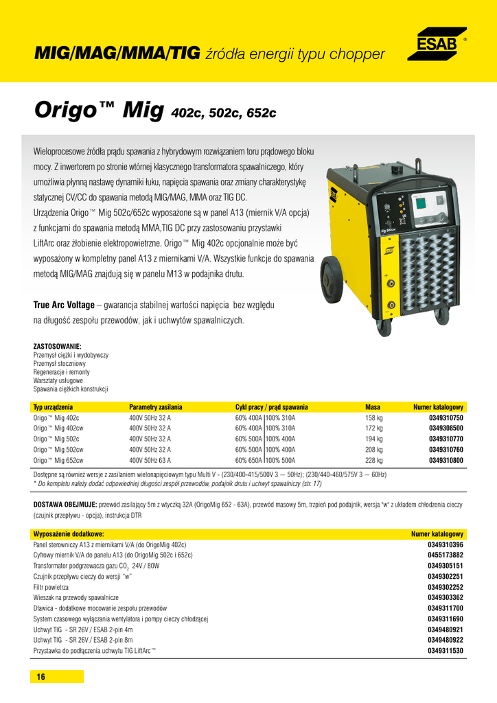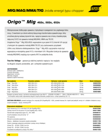 MIG/MAG/MMA/TIG êródła energii typu chopper Origo™ Mig 402c, 502c, 652c Wieloprocesowe êródła pràdu spawania z hybrydowym rozwiàzaniem toru pràdowego bloku mocy. Z inwertorem po stronie wtórnej klasycznego transformatora spawalniczego, który umo˝liwia płynnà nastaw´ dynamiki łuku, napi´cia spawania oraz zmiany charakterystyk´ statycznej CV/CC do spawania metodà MIG/MAG, MMA oraz TIG DC. Urzàdzenia Origo™ Mig 502c/652c wyposa˝one sà w panel A13 (miernik V/A opcja) z funkcjami do spawania metodà MMA,TIG DC przy zastosowaniu przystawki LiftArc oraz ˝łobienie elektropowietrzne. Origo™ Mig 402c opcjonalnie mo˝e byç wyposa˝ony w kompletny panel A13 z miernikami V/A. Wszystkie funkcje do spawania metodà MIG/MAG znajdujà si´ w panelu M13 w podajnika drutu. True Arc Voltage – gwarancja stabilnej wartoÊci napi´cia bez wzgl´du na długoÊç zespołu przewodów, jak i uchwytów spawalniczych. ZASTOSOWANIE: Przemysł ci´˝ki i wydobywczy Przemysł stoczniowy Regeneracje i remonty Warsztaty usługowe Spawania ci´˝kich konstrukcji Typ urzàdzenia Origo™ Mig 402c Origo™ Mig 402cw Origo™ Mig 502c Origo™ Mig 502cw Origo™ Mig 652cw Parametry zasilania 400V 50Hz 32 A 400V 50Hz 32 A 400V 50Hz 32 A 400V 50Hz 32 A 400V 50Hz 63 A Cykl pracy / pràd spawania 60% 400A 100% 310A 60% 400A 100% 310A 60% 500A 100% 400A 60% 500A 100% 400A 60% 650A 100% 500A Masa 158 kg 172 kg 194 kg 208 kg 228 kg Numer katalogowy 0349310750 0349308500 0349310770 0349310760 0349310800 Dost´pne sà równie˝ wersje z zasilaniem wielonapi´ciowym typu Multi V - (230/400-415/500V 3 ~ 50Hz); (230/440-460/575V 3 ~ 60Hz) * Do kompletu nale˝y dodaç odpowiedniej długoÊci zespół przewodów, podajnik drutu i uchwyt spawalniczy (str. 17) DOSTAWA OBEJMUJE: przewód zasilajàcy 5m z wtyczkà 32A (OrigoMig 652 - 63A), przewód masowy 5m, trzpieƒ pod podajnik, wersja "w" z układem chłodzenia cieczy (czujnik przepływu - opcja), instrukcja DTR Wyposa˝enie dodatkowe: Panel sterowniczy A13 z miernikami V/A (do OrigoMig 402c) Cyfrowy miernik V/A do panelu A13 (do OrigoMig 502c i 652c) Transformator podgrzewacza gazu CO2 24V / 80W Czujnik przepływu cieczy do wersji “w” Filtr powietrza Wieszak na przewody spawalnicze D∏awica - dodatkowe mocowanie zespołu przewodów System czasowego wyłàczania wentylatora i pompy cieczy chłodzàcej Uchwyt TIG - SR 26V / ESAB 2-pin 4m Uchwyt TIG - SR 26V / ESAB 2-pin 8m Przystawka do podłàczenia uchwytu TIG LiftArc™ 16 Numer katalogowy 0349310396 0455173882 0349305151 0349302251 0349302252 0349303362 0349311700 0349311690 0349480921 0349480922 0349311530