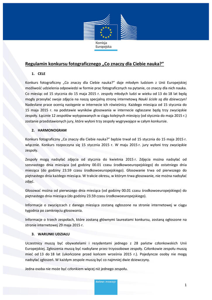 Regulamin konkursu fotograficznego „Co znaczy dla Ciebie nauka?” 1. CELE Konkurs fotograficzny „Co znaczy dla Ciebie nauka?” daje młodym ludziom z Unii Europejskiej możliwość udzielenia odpowiedzi w formie prac fotograficznych na pytanie, co znaczy dla nich nauka. Co miesiąc od 15 stycznia do 15 maja 2015 r. zespoły młodych ludzi w wieku od 13 do 18 lat będą mogły przesyłać swoje zdjęcia na naszą specjalną stronę internetową Nauki ścisłe są dla dziewczyn! Nadesłane prace ocenią następnie w internecie ich rówieśnicy. Każdego miesiąca od 15 stycznia do 15 maja 2015 r. na podstawie wyników głosowania w internecie ogłaszane będą trzy zwycięskie zespoły. Łącznie 12 zespołów wytypowanych w ciągu kolejnych miesięcy (od stycznia do maja 2015 r.) zostanie przedstawionych jury, które wyłoni trzy zespoły wygrywające w całym konkursie. 2. HARMONOGRAM Konkurs fotograficzny „Co znaczy dla Ciebie nauka?” będzie trwał od 15 stycznia do 15 maja 2015 r. włącznie. Konkurs rozpoczyna się 15 stycznia 2015 r. W maju 2015 r. jury wyłoni trzy zwycięskie zespoły. Zespoły mogą nadsyłać zdjęcia od stycznia do kwietnia 2015 r. Zdjęcia można nadsyłać od szesnastego dnia miesiąca (od godziny 00.01 czasu środkowoeuropejskiego) do ostatniego dnia miesiąca (do godziny 23.59 czasu środkowoeuropejskiego). Głosowanie trwa od pierwszego do piętnastego dnia każdego miesiąca. W trakcie okresu, w którym trwa głosowanie, nie można nadsyłać zdjęć. Głosować można od pierwszego dnia miesiąca (od godziny 00.01 czasu środkowoeuropejskiego) do piętnastego dnia miesiąca (do godziny 23.59 czasu środkowoeuropejskiego). Informacje o zwycięzcach z danego miesiąca zostaną ogłoszone na stronie internetowej w ciągu tygodnia po zamknięciu głosowania. Informacje o trzech zespołach, które zostaną głównymi laureatami konkursu, zostaną ogłoszone na stronie internetowej 29 maja 2015 r. 3. WARUNKI UDZIAŁU Uczestnicy muszą być obywatelami i rezydentami jednego z 28 państw członkowskich Unii Europejskiej. Zgłoszenia muszą być nadsyłane przez trzyosobowe zespoły. Członkowie zespołu muszą mieć od 13 do 18 lat (ukończone przed końcem września 2015 r.). Pojedyncze osoby nie mogą nadsyłać zgłoszeń. W każdym zespole muszą być co najmniej dwie dziewczyny. Jedna osoba nie może być członkiem więcej niż jednego zespołu. 1 Członkowie zwycięskich zespołów zostaną poproszeni o udokumentowanie swojej tożsamości. 4. NADSYŁANIE ZDJĘĆ – JAK WZIĄĆ UDZIAŁ W KONKURSIE Uczestnicy wypełniają internetowy formularz rejestracyjny i oświadczają, że spełniają warunki regulaminu konkursu. Należy podać nazwę zespołu i prawidłowy adres e‐mail, a także kraj zamieszkania, płeć oraz wiek. Następnie można przesłać zdjęcie na stronę internetową. Każdy zespół może nadesłać tylko jedno zdjęcie w miesiącu. Nadesłane zdjęcia muszą być w formacie jpg/jpeg, w orientacji poziomej. Ponieważ jakość zdjęć powinna umożliwiać wydruk, muszą mieć co najmniej 5 Mpx (3200 × 4250 pikseli) i preferowaną rozdzielczość 300 dpi (nie mniejszą niż 200 dpi). Wszystkie zdjęcia muszą być oryginalne. Nadsyłający powinni zadbać o ich oryginalność, aspekt estetyczny i kreatywność. Zdjęcia mogą być obrabiane przy użyciu odpowiedniego oprogramowania. Nie mogą one naruszać prawa do prywatności żadnej osoby żyjącej lub zmarłej ani w inny sposób naruszać praw osobistych ani majątkowych żadnej osoby. Aby zapewnić poszanowanie prawa do prywatności innych osób, uczestnikom konkursu fotograficznego zabrania się nadsyłania zdjęć przedstawiających możliwe do rozpoznania osoby. Zdjęcia nie mogą zawierać treści związanych z przemocą, seksistowskich, wyrażających uprzedzenia lub w jakikolwiek sposób dyskryminujących, nie mogą służyć celom komercyjnym ani reklamie produktów lub usług ani być nieodpowiednie w jakikolwiek inny sposób. Wszelkie takie zdjęcia zostaną zdyskwalifikowane. Biorąc udział w konkursie i rejestrując zdjęcia na stronie internetowej Komisji Europejskiej, uczestnik zobowiązuje się do przestrzegania reguł konkursowych oraz podporządkowania się decyzjom Komisji Europejskiej, które mają charakter ostateczny we wszystkich sprawach związanych z konkursem. 5. KRYTERIA PRZYZNAWANIA NAGRÓD Co miesiąc, na podstawie publicznego głosowania w internecie, w którym będą uczestniczyć osoby odwiedzające stronę, przyznawane będą trzy nagrody. Głosowanie będzie trwało od godziny 00.01 czasu środkowoeuropejskiego pierwszego dnia miesiąca do godziny 23.59 czasu środkowoeuropejskiego piętnastego dnia miesiąca, od stycznia do maja 2015 r. Trzy zdjęcia, które otrzymają największą liczbę głosów w miesiącu, w którym zostały nadesłane, zostaną ogłoszone zwycięzcami tego miesiąca. Jeżeli w danym miesiącu kilka zespołów otrzyma taką samą najwyższą liczbę głosów, wszystkie zwycięskie zespoły otrzymają nagrody. W maju 2015 r. jury, bazując na trzech kryteriach, wyłoni trzy zespoły, które zostaną głównymi laureatami konkursu. Do kryteriów należą: kreatywność, powiązanie z nauką i jakość zdjęcia. 2 Głosujący muszą wybrać propozycje trzech najlepszych zdjęć. Każda osoba może uczestniczyć tylko w jednym głosowaniu (trzy głosy) w danym miesiącu. Aby zapobiec nadsyłaniu większej liczby głosów przez jedną osobę, każdy głosujący będzie musiał podać prawidłowy adres e‐mail. Komisja Europejska zastrzega sobie prawo zmiany, rozszerzenia lub zawężenia warunków konkursu albo też zawieszenia lub zakończenia konkursu bez wcześniejszego powiadomienia. Zależnie od liczby otrzymanych zgłoszeń Komisja Europejska zastrzega sobie prawo zakończenia okresu zgłoszeniowego konkursu przed majem 2015 r. Komisja Europejska poinformuje o wszelkich takich zmianach na stronie internetowej konkursu.