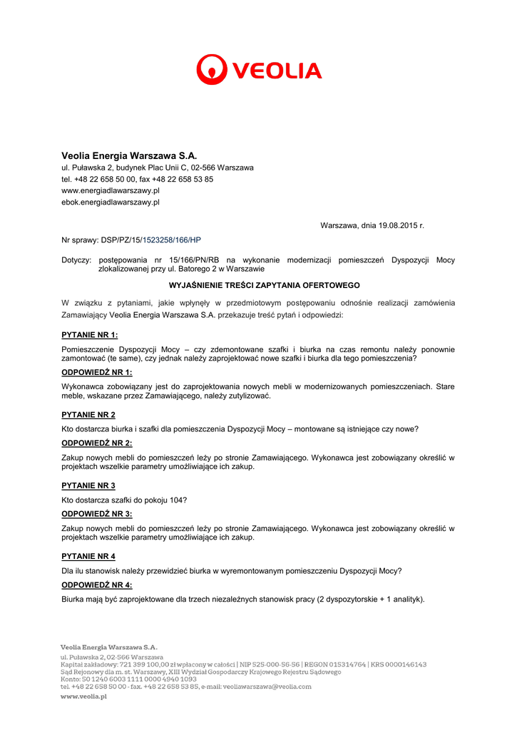 Veolia Energia Warszawa S.A. ul. Puławska 2, budynek Plac Unii C, 02-566 Warszawa tel. +48 22 658 50 00, fax +48 22 658 53 85 www.energiadlawarszawy.pl ebok.energiadlawarszawy.pl Warszawa, dnia 19.08.2015 r. Nr sprawy: DSP/PZ/15/1523258/166/HP Dotyczy: postępowania nr 15/166/PN/RB na wykonanie modernizacji pomieszczeń Dyspozycji Mocy zlokalizowanej przy ul. Batorego 2 w Warszawie WYJAŚNIENIE TREŚCI ZAPYTANIA OFERTOWEGO W związku z pytaniami, jakie wpłynęły w przedmiotowym postępowaniu odnośnie realizacji zamówienia Zamawiający Veolia Energia Warszawa S.A. przekazuje treść pytań i odpowiedzi: PYTANIE NR 1: Pomieszczenie Dyspozycji Mocy – czy zdemontowane szafki i biurka na czas remontu należy ponownie zamontować (te same), czy jednak należy zaprojektować nowe szafki i biurka dla tego pomieszczenia? ODPOWIEDŹ NR 1: Wykonawca zobowiązany jest do zaprojektowania nowych mebli w modernizowanych pomieszczeniach. Stare meble, wskazane przez Zamawiającego, należy zutylizować. PYTANIE NR 2 Kto dostarcza biurka i szafki dla pomieszczenia Dyspozycji Mocy – montowane są istniejące czy nowe? ODPOWIEDŹ NR 2: Zakup nowych mebli do pomieszczeń leży po stronie Zamawiającego. Wykonawca jest zobowiązany określić w projektach wszelkie parametry umożliwiające ich zakup. PYTANIE NR 3 Kto dostarcza szafki do pokoju 104? ODPOWIEDŹ NR 3: Zakup nowych mebli do pomieszczeń leży po stronie Zamawiającego. Wykonawca jest zobowiązany określić w projektach wszelkie parametry umożliwiające ich zakup. PYTANIE NR 4 Dla ilu stanowisk należy przewidzieć biurka w wyremontowanym pomieszczeniu Dyspozycji Mocy? ODPOWIEDŹ NR 4: Biurka mają być zaprojektowane dla trzech niezależnych stanowisk pracy (2 dyspozytorskie + 1 analityk). PYTANIE NR 5 Prosimy o potwierdzenie iż w przypadku rozbudowy rozdzielnicy elektrycznej w pomieszczeniu 101 zakres robót nie obejmuje wymiany UPS i kabla WLZ zasilającego istniejącą rozdzielnicę elektryczną. ODPOWIEDŹ NR 5: Umowa nie obejmuje swoim zakresem wymiany UPS i kabla WLZ. PYTANIE NR 6 Czy istniejący kabel WLZ zasilający istniejącą rozdzielnię która będzie rozbudowana o kolejne obwody jest wystarczający do zwiększenia mocy? ODPOWIEDŹ NR 6: Tak, istniejący kabel WLZ zasilający istniejącą rozdzielnię jest wystarczający do zwiększenia mocy. PYTANIE NR 7 Czy parametry istniejącego UPS są wystarczające do dołożenia kolejnych obwodów w związku z budową ściany graficznej? ODPOWIEDŹ NR 7: Zakup nowego UPS spełniającego wymogi nowego systemu leży po stronie Zamawiającego. PYTANIE NR 8 Prosimy o informację czy wykonanie okablowania strukturalnego LAN w kategorii 6 spełni wymagania Zamawiającego. ODPOWIEDŹ NR 8: Tak, spełni wymagania Zamawiającego. PYTANIE NR 9 Prosimy o informację czy postępowanie obejmuje również ew. wymianę kabla zasilającego rozdzielnicę w pom. 101. ODPOWIEDŹ NR 9: Nie, zamówienie nie obejmuje wymiany kabla zasilającego rozdzielnicę w pom. 101. PYTANIE NR 10 Prosimy o informację czy Zamawiający dopuszcza wykorzystanie istniejących czujek systemu sygnalizacji pożaru (system wykorzystany w budynku nie jest już produkowany - brak możliwości zakupu nowych urządzeń) ODPOWIEDŹ NR 10: W przypadku braku możliwości zakupu nowych czujek Zamawiający dopuszcza zastosowania istniejących, po uprzednim sprawdzeniu poprawności ich działania. PYTANIE NR 11 Jeżeli to możliwe prosimy o przekazanie informacji o planowanej ścianie graficznej z monitorów (wielkość, waga, moc elektryczna) oraz przewidywanej aranżacji pomieszczenia Dyspozycji Mocy (liczba stanowisk roboczych). ODPOWIEDŹ NR 11: Parametry odnośnie ściany graficznej są na etapie ustalenia. Zapraszamy do udziału w przedmiotowym postępowaniu. Kierownik Działu Zakupów /-/ Marek Tymiński 2