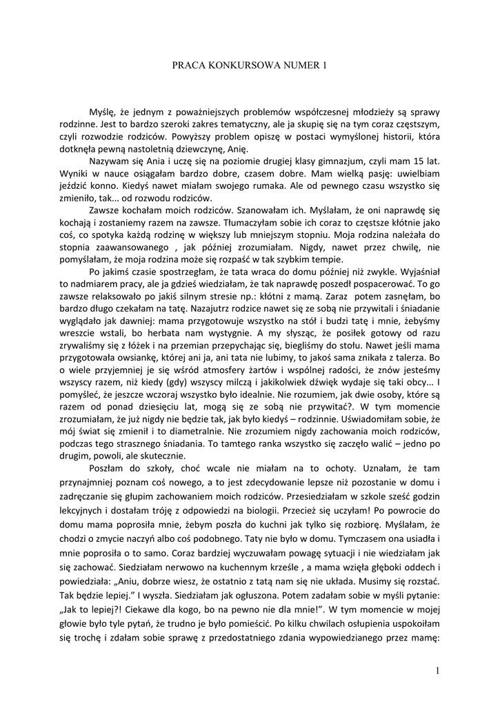 PRACA KONKURSOWA NUMER 1 Myślę, że jednym z poważniejszych problemów współczesnej młodzieży są sprawy rodzinne. Jest to bardzo szeroki zakres tematyczny, ale ja skupię się na tym coraz częstszym, czyli rozwodzie rodziców. Powyższy problem opiszę w postaci wymyślonej historii, która dotknęła pewną nastoletnią dziewczynę, Anię. Nazywam się Ania i uczę się na poziomie drugiej klasy gimnazjum, czyli mam 15 lat. Wyniki w nauce osiągałam bardzo dobre, czasem dobre. Mam wielką pasję: uwielbiam jeździć konno. Kiedyś nawet miałam swojego rumaka. Ale od pewnego czasu wszystko się zmieniło, tak... od rozwodu rodziców. Zawsze kochałam moich rodziców. Szanowałam ich. Myślałam, że oni naprawdę się kochają i zostaniemy razem na zawsze. Tłumaczyłam sobie ich coraz to częstsze kłótnie jako coś, co spotyka każdą rodzinę w większy lub mniejszym stopniu. Moja rodzina należała do stopnia zaawansowanego , jak później zrozumiałam. Nigdy, nawet przez chwilę, nie pomyślałam, że moja rodzina może się rozpaść w tak szybkim tempie. Po jakimś czasie spostrzegłam, że tata wraca do domu później niż zwykle. Wyjaśniał to nadmiarem pracy, ale ja gdzieś wiedziałam, że tak naprawdę poszedł pospacerować. To go zawsze relaksowało po jakiś silnym stresie np.: kłótni z mamą. Zaraz potem zasnęłam, bo bardzo długo czekałam na tatę. Nazajutrz rodzice nawet się ze sobą nie przywitali i śniadanie wyglądało jak dawniej: mama przygotowuje wszystko na stół i budzi tatę i mnie, żebyśmy wreszcie wstali, bo herbata nam wystygnie. A my słysząc, że posiłek gotowy od razu zrywaliśmy się z łóżek i na przemian przepychając się, biegliśmy do stołu. Nawet jeśli mama przygotowała owsiankę, której ani ja, ani tata nie lubimy, to jakoś sama znikała z talerza. Bo o wiele przyjemniej je się wśród atmosfery żartów i wspólnej radości, że znów jesteśmy wszyscy razem, niż kiedy (gdy) wszyscy milczą i jakikolwiek dźwięk wydaje się taki obcy... I pomyśleć, że jeszcze wczoraj wszystko było idealnie. Nie rozumiem, jak dwie osoby, które są razem od ponad dziesięciu lat, mogą się ze sobą nie przywitać?. W tym momencie zrozumiałam, że już nigdy nie będzie tak, jak było kiedyś – rodzinnie. Uświadomiłam sobie, że mój świat się zmienił i to diametralnie. Nie zrozumiem nigdy zachowania moich rodziców, podczas tego strasznego śniadania. To tamtego ranka wszystko się zaczęło walić – jedno po drugim, powoli, ale skutecznie. Poszłam do szkoły, choć wcale nie miałam na to ochoty. Uznałam, że tam przynajmniej poznam coś nowego, a to jest zdecydowanie lepsze niż pozostanie w domu i zadręczanie się głupim zachowaniem moich rodziców. Przesiedziałam w szkole sześć godzin lekcyjnych i dostałam tróję z odpowiedzi na biologii. Przecież się uczyłam! Po powrocie do domu mama poprosiła mnie, żebym poszła do kuchni jak tylko się rozbiorę. Myślałam, że chodzi o zmycie naczyń albo coś podobnego. Taty nie było w domu. Tymczasem ona usiadła i mnie poprosiła o to samo. Coraz bardziej wyczuwałam powagę sytuacji i nie wiedziałam jak się zachować. Siedziałam nerwowo na kuchennym krześle , a mama wzięła głęboki oddech i powiedziała: „Aniu, dobrze wiesz, że ostatnio z tatą nam się nie układa. Musimy się rozstać. Tak będzie lepiej.” I wyszła. Siedziałam jak ogłuszona. Potem zadałam sobie w myśli pytanie: „Jak to lepiej?! Ciekawe dla kogo, bo na pewno nie dla mnie!”. W tym momencie w mojej głowie było tyle pytań, że trudno je było pomieścić. Po kilku chwilach osłupienia uspokoiłam się trochę i zdałam sobie sprawę z przedostatniego zdania wypowiedzianego przez mamę: 1 „Musimy się rozstać.” Te słowa zostały w mojej pamięci na bardzo długo. Były jak zaklęcie psujące cały świat w jednej chwili. Po długim namyśle doszłam do wniosku, że nie zadałam drugiego okropnego zaklęcia mojej mamie – dlaczego?. Poszłam do swojego pokoju i zaczęłam płakać. Dawno nie płakałam. Łzy płynęły mi wielkimi strumieniami. Nie poszłam do mamy, bo ona chyba też płakała. W nocy nie spałam w ogóle, wciąż miałam mnóstwo pytań i to najgorsze: dlaczego? Na drugi dzień zaspałam, ale poszłam do szkoły. Znów dostałam tróję, ale tym razem z matematyki, za którą przepadam. Nie wiem co się ostatnio dzieje. Wszystko stało się tak nagle. Ciągle nam w głowie słowa mamy te, które zepsuły wszystko. Kiedy wróciłam do domu rodzice już byli. Spostrzegłam ich samochody na podjeździe. Przez chwilę zastanawiałam się co tym razem mnie spotka, ale dalej, odważnie szłam do przodu. Przystanęłam przed drzwiami i wzięłam głęboki oddech – starałam się myśleć pozytywnie. Nacisnęłam klamkę i weszłam do domu. Znów panowała grobowa cisza. Już wiedziałam, że moje optymistyczne podejście nic nie da, kiedy usłyszałam słowa taty przerywające całą ciszę: „Dobrze, wyprowadzę się. Chcę dla Ani jak najlepiej, pamiętaj o tym. Do zobaczenia w piątek.” Usłyszałam jak wychodzi z kuchni. Tata zobaczył, że już jestem i uznał, że dopiero przyszłam, bo przywitał mnie i zapytał, typowo dla rodziców, jak tam w szkole. Powiedziałam, że dostałam trójkę z matematyki. Wydał się zdziwiony moją słabą oceną, wiedział, że lubię ten przedmiot. Ale po kilku sekundach ciszy, która w ostatnich dniach stała się czymś o wiele gorszym od trói, powiedział, że na pewno dam radę to poprawić. Tylko trói nie można poprawić… W każdym razie zareagował bardzo spokojnie, co było przeciwieństwem mamy. Tata powiedział, zakładając płaszcz, że nie długo wróci i wyszedł tak szybko, że nawet nie zdążyłam się zapytać gdzie jedzie. Zdjęłam kurtkę, weszłam do kuchni i przywitałam się z mamą. Wyglądała niewyraźnie, na zmartwioną. Zapytałam, czy wszystko w porządku. Milczała. Po 