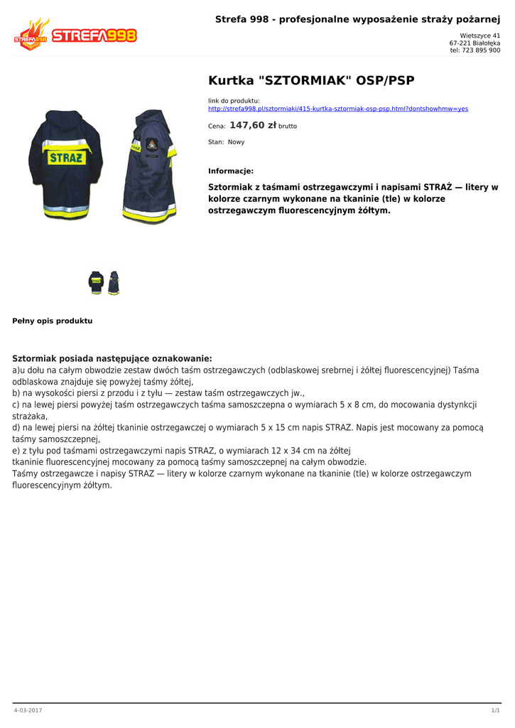 Strefa 998 - profesjonalne wyposażenie straży pożarnej Wietszyce 41 67-221 Białołęka tel: 723 895 900 Kurtka "SZTORMIAK" OSP/PSP link do produktu: http://strefa998.pl/sztormiaki/415-kurtka-sztormiak-osp-psp.html?dontshowhmw=yes Cena: 147,60 zł brutto Stan: Nowy Informacje: Sztormiak z taśmami ostrzegawczymi i napisami STRAŻ — litery w kolorze czarnym wykonane na tkaninie (tle) w kolorze ostrzegawczym fluorescencyjnym żółtym. Pełny opis produktu Sztormiak posiada następujące oznakowanie: a)u dołu na całym obwodzie zestaw dwóch taśm ostrzegawczych (odblaskowej srebrnej i żółtej fluorescencyjnej) Taśma odblaskowa znajduje się powyżej taśmy żółtej, b) na wysokości piersi z przodu i z tyłu — zestaw taśm ostrzegawczych jw., c) na lewej piersi powyżej taśm ostrzegawczych taśma samoszczepna o wymiarach 5 x 8 cm, do mocowania dystynkcji strażaka, d) na lewej piersi na żółtej tkaninie ostrzegawczej o wymiarach 5 x 15 cm napis STRAZ. Napis jest mocowany za pomocą taśmy samoszczepnej, e) z tyłu pod taśmami ostrzegawczymi napis STRAZ, o wymiarach 12 x 34 cm na żółtej tkaninie fluorescencyjnej mocowany za pomocą taśmy samoszczepnej na całym obwodzie. Taśmy ostrzegawcze i napisy STRAZ — litery w kolorze czarnym wykonane na tkaninie (tle) w kolorze ostrzegawczym fluorescencyjnym żółtym. 4-03-2017 1/1