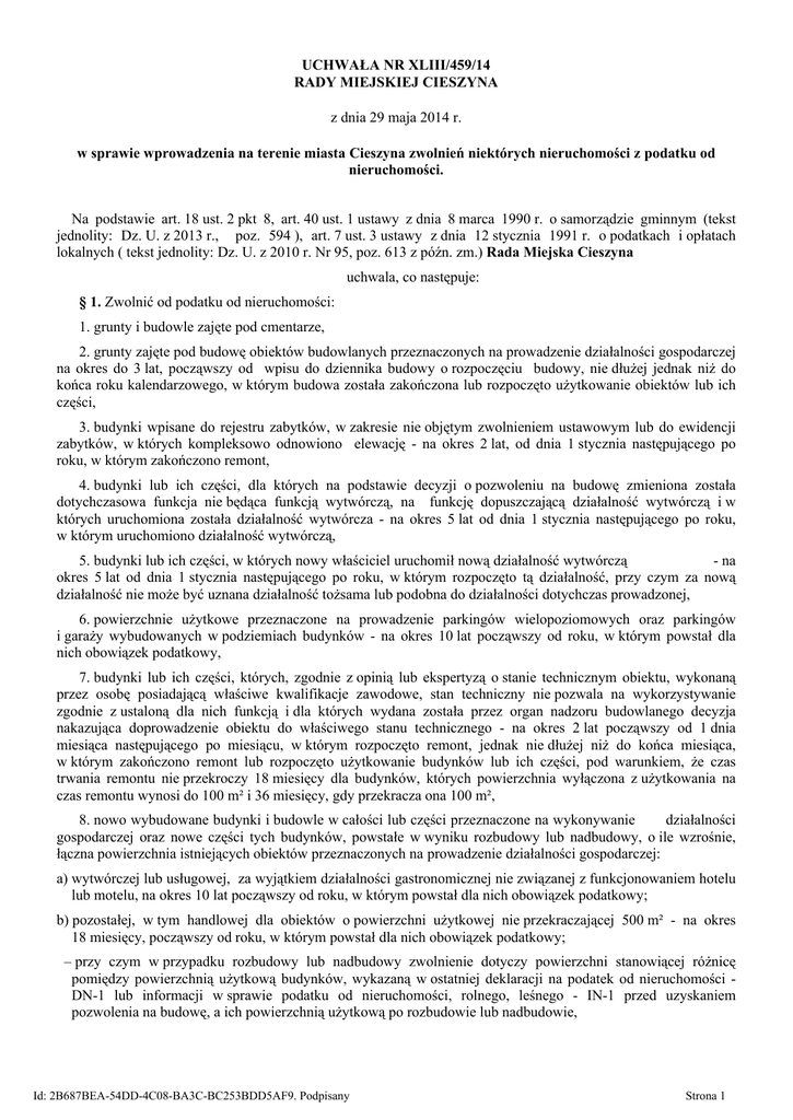 UCHWAŁA NR XLIII/459/14 RADY MIEJSKIEJ CIESZYNA z dnia 29 maja 2014 r. w sprawie wprowadzenia na terenie miasta Cieszyna zwolnień niektórych nieruchomości z podatku od nieruchomości. Na podstawie art. 18 ust. 2 pkt 8, art. 40 ust. 1 ustawy z dnia 8 marca 1990 r. o samorządzie gminnym (tekst jednolity: Dz. U. z 2013 r., poz. 594 ), art. 7 ust. 3 ustawy z dnia 12 stycznia 1991 r. o podatkach i opłatach lokalnych ( tekst jednolity: Dz. U. z 2010 r. Nr 95, poz. 613 z późn. zm.) Rada Miejska Cieszyna uchwala, co następuje: § 1. Zwolnić od podatku od nieruchomości: 1. grunty i budowle zajęte pod cmentarze, 2. grunty zajęte pod budowę obiektów budowlanych przeznaczonych na prowadzenie działalności gospodarczej na okres do 3 lat, począwszy od wpisu do dziennika budowy o rozpoczęciu budowy, nie dłużej jednak niż do końca roku kalendarzowego, w którym budowa została zakończona lub rozpoczęto użytkowanie obiektów lub ich części, 3. budynki wpisane do rejestru zabytków, w zakresie nie objętym zwolnieniem ustawowym lub do ewidencji zabytków, w których kompleksowo odnowiono elewację - na okres 2 lat, od dnia 1 stycznia następującego po roku, w którym zakończono remont, 4. budynki lub ich części, dla których na podstawie decyzji o pozwoleniu na budowę zmieniona została dotychczasowa funkcja nie będąca funkcją wytwórczą, na funkcję dopuszczającą działalność wytwórczą i w których uruchomiona została działalność wytwórcza - na okres 5 lat od dnia 1 stycznia następującego po roku, w którym uruchomiono działalność wytwórczą, 5. budynki lub ich części, w których nowy właściciel uruchomił nową działalność wytwórczą - na okres 5 lat od dnia 1 stycznia następującego po roku, w którym rozpoczęto tą działalność, przy czym za nową działalność nie może być uznana działalność tożsama lub podobna do działalności dotychczas prowadzonej, 6. powierzchnie użytkowe przeznaczone na prowadzenie parkingów wielopoziomowych oraz parkingów i garaży wybudowanych w podziemiach budynków - na okres 10 lat począwszy od roku, w którym powstał dla nich obowiązek podatkowy, 7. budynki lub ich części, których, zgodnie z opinią lub ekspertyzą o stanie technicznym obiektu, wykonaną przez osobę posiadającą właściwe kwalifikacje zawodowe, stan techniczny nie pozwala na wykorzystywanie zgodnie z ustaloną dla nich funkcją i dla których wydana została przez organ nadzoru budowlanego decyzja nakazująca doprowadzenie obiektu do właściwego stanu technicznego - na okres 2 lat począwszy od 1 dnia miesiąca następującego po miesiącu, w którym rozpoczęto remont, jednak nie dłużej niż do końca miesiąca, w którym zakończono remont lub rozpoczęto użytkowanie budynków lub ich części, pod warunkiem, że czas trwania remontu nie przekroczy 18 miesięcy dla budynków, których powierzchnia wyłączona z użytkowania na czas remontu wynosi do 100 m² i 36 miesięcy, gdy przekracza ona 100 m², 8. nowo wybudowane budynki i budowle w całości lub części przeznaczone na wykonywanie działalności gospodarczej oraz nowe części tych budynków, powstałe w wyniku rozbudowy lub nadbudowy, o ile wzrośnie, łączna powierzchnia istniejących obiektów przeznaczonych na prowadzenie działalności gospodarczej: a) wytwórczej lub usługowej, za wyjątkiem działalności gastronomicznej nie związanej z funkcjonowaniem hotelu lub motelu, na okres 10 lat począwszy od roku, w którym powstał dla nich obowiązek podatkowy; b) pozostałej, w tym handlowej dla obiektów o powierzchni użytkowej nie przekraczającej 500 m² - na okres 18 miesięcy, począwszy od roku, w którym powstał dla nich obowiązek podatkowy; – przy czym w przypadku rozbudowy lub nadbudowy zwolnienie dotyczy powierzchni stanowiącej różnicę pomiędzy powierzchnią użytkową budynków, wykazaną w ostatniej deklaracji na podatek od nieruchomości DN-1 lub informacji w sprawie podatku od nieruchomości, rolnego, leśnego - IN-1 przed uzyskaniem pozwolenia na budowę, a ich powierzchnią użytkową po rozbudowie lub nadbudowie, Id: 2B687BEA-54DD-4C08-BA3C-BC253BDD5AF9. Podpisany Strona 1 9. budynki, budowle i grunty kempingów, 10. budynki lub ich części, budowle oraz grunty zajęte na prowadzenie domów pomocy społecznej oraz placówek opiekuńczo - wychowawczych dla dzieci i młodzieży zapewniających całodobową, ciągłą lub okresową opiekę i wychowanie, 11. budynki lub ich części oraz grunty zajęte na potrzeby prowadzonej działalności w zakresie zwalczania patologii społecznej, z wyjątkiem wykorzystywanych do prowadzenia działalności gospodarczej, 12. budynki lub ich części zajęte na potrzeby prowadzonej działalności na rzecz emerytów, rencistów, osób niepełnosprawnych, kombatantów i inwalidów wojennych, z wyjątkiem wykorzystywanych do prowadzenia działalności gospodarczej, 13. budynki, budowle i grunty wykorzystywane na prowadzenie działalności związanej z ochroną przeciwpożarową, 14. budynki, budowle i grunty związane z prowadzeniem działalności oświatowej w zakresie nie objętym zwolnieniem określonym w art. 7 ust 2 pkt 2 ustawy o podatkach i opłatach lokalnych, za wyjątkiem przedmiotów opodatkowania zajętych na działalność gospodarczą inną niż działalność oświatowa. § 2. 1. Zwolnienia od podatku od nieruchomości, o których mowa § 1 pkt 2 - 9 w przypadku, gdy dotyczą budynków lub ich części, budowli i gruntów będących w posiadaniu przedsiębiorcy, na którym w myśl art. 3 ust. 1 ustawy o podatkach i opłatach lokalnych ciąży obowiązek podatkowy, stanowią pomoc de minimis, o której mowa w rozporządzeniu Komisji (UE) nr 1407/2013 z dnia 18 grudnia 2013 r. w sprawie stosowania art.107 i 108 Traktatu o funkcjonowaniu Unii Europejskiej do pomocy de minimis (Dz. Urz. UE L 352 z 24.12. 2013 ). 2. Podmioty ubiegające się o udzielenie pomocy de minimis oraz korzystają