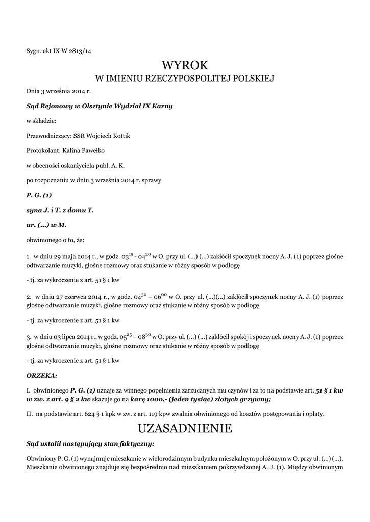 Sygn. akt IX W 2813/14 WYROK W IMIENIU RZECZYPOSPOLITEJ POLSKIEJ Dnia 3 września 2014 r. Sąd Rejonowy w Olsztynie Wydział IX Karny w składzie: Przewodniczący: SSR Wojciech Kottik Protokolant: Kalina Pawełko w obecności oskarżyciela publ. A. K. po rozpoznaniu w dniu 3 września 2014 r. sprawy P. G. (1) syna J. i T. z domu T. ur. (...) w M. obwinionego o to, że: 1. w dniu 29 maja 2014 r., w godz. 0315 - 0420 w O. przy ul. (...) (...) zakłócił spoczynek nocny A. J. (1) poprzez głośne odtwarzanie muzyki, głośne rozmowy oraz stukanie w różny sposób w podłogę - tj. za wykroczenie z art. 51 § 1 kw 2. w dniu 27 czerwca 2014 r., w godz. 0430 – 0600 w O. przy ul. (...)(...) zakłócił spoczynek nocny A. J. (1) poprzez głośne odtwarzanie muzyki, głośne rozmowy oraz stukanie w różny sposób w podłogę - tj. za wykroczenie z art. 51 § 1 kw 3. w dniu 03 lipca 2014 r., w godz. 0525 – 0830 w O. przy ul. (...) (...) zakłócił spokój i spoczynek nocny A. J. (1) poprzez głośne odtwarzanie muzyki, głośne rozmowy oraz stukanie w różny sposób w podłogę - tj. za wykroczenie z art. 51 § 1 kw ORZEKA: I. obwinionego P. G. (1) uznaje za winnego popełnienia zarzucanych mu czynów i za to na podstawie art. 51 § 1 kw w zw. z art. 9 § 2 kw skazuje go na karę 1000,- (jeden tysiąc) złotych grzywny; II. na podstawie art. 624 § 1 kpk w zw. z art. 119 kpw zwalnia obwinionego od kosztów postępowania i opłaty. UZASADNIENIE Sąd ustalił następujący stan faktyczny: Obwiniony P. G. (1) wynajmuje mieszkanie w wielorodzinnym budynku mieszkalnym położonym w O. przy ul. (...) (...). Mieszkanie obwinionego znajduje się bezpośrednio nad mieszkaniem pokrzywdzonej A. J. (1). Między obwinionym a oskarżycielką posiłkową istnieje konflikt na tle głośnego i uciążliwego zachowywania się P. G., zwłaszcza gdy ten wraca w środku nocy. Obwiniony pracuje jako(...)i kończy swoją pracę często w środku nocy. W nocy z 28 na 29 maja 2014 r. obwiniony wrócił do domu ok. godz. 0315 w towarzystwie kilku osób. W mieszkaniu toczyły się głośne rozmowy tych osób i była odtwarzana głośna muzyka. Z uwagi na to, że zachowanie obwinionego zakłócało pokrzywdzonej ciszę nocną, wezwała ona Policję na interwencję. Przybyli na miejsce zdarzenia funkcjonariusze Policji - D. T. (1) oraz A. M. (1) już po wejściu do budynku słyszeli głośną muzykę. Udali się początkowo do mieszkania zgłaszającej, w którym również było słychać muzykę. Następnie poszli do mieszkania obwinionego, który miał bardzo lekceważący stosunek do interwencji, obrażał wręcz pokrzywdzoną, nie chciał ściszyć głośno odtwarzanej muzyki. W nocy z 26 na 27 czerwca 2014 r., obwiniony wrócił wraz z towarzystwem do mieszkania ok. godz. 0430 i ponownie osoby te głośno rozmawiając i tupiąc w podłogę obudziły pokrzywdzoną, która zgłosiła na Policji zakłócanie ciszy nocnej przez obwinionego. Przybyłych na interwencję funkcjonariuszy obwiniony nie wpuścił do mieszkania rozmawiając z nimi na klatce schodowej, z mieszkania dochodziły głośne rozmowy i śmiechy. Obwiniony, od którego wyczuwalna była silna woń alkoholu nie przyjął proponowanego mu mandatu karnego. Do kolejnego zakłócania ciszy nocnej przez obwinionego doszło w nocy, a właściwie nad ranem w dniu 03 lipca 2014 r, kiedy to o godzinie 0530 w wyniku zgłoszenia pokrzywdzonej na miejscu zjawił się patrol Policji. Policjanci stwierdzili ponownie głośno grającą muzykę w mieszkaniu obwinionego, a on sam nie chciał przyjąć zaproponowanego mu mandatu. Tego dnia głośno grała muzyka w mieszkaniu obwinionego aż do godziny ok. 0830 (dowody: częściowo wyjaśnienia obwinionego k. 58; zeznania świadków - A. J. k. 58; Ł. K. k. 58v; A. M. k. 59; P. M. k. 59; D. T. k. 59; notatki urzędowe k. 6-6v, 20-20v, 35 – 35v) Obwiniony P. G. (1) przesłuchany zarówno w toku czynności wyjaśniających jak i na rozprawie nie przyznał się do stawianych mu zarzutów. Przyznał że jedynie rozmawiał z zaproszonymi przez siebie gośćmi – 2- 3 osobami, ale były to rozmowy zwykłym tonem. Podkreślił, że w jego mieszkaniu jest podłoga wyłożona parkietem, który ma luźne klepki i podczas chodzenia po nich powstaje hałas. Zaznaczył, że muzyka odtwarzana jest z małych głośniczków. Stwierdził, że podczas interwencji policjantów mógł znajdować się pod wpływem alkoholu, po wypiciu 2-3 piw. ( wyjaśnienia obwinionego k. 58-58v) Sąd zważył, co następuje: Wyjaśnienia obwinionego generalnie nie zasługują na wiarę. Wprawdzie obwiniony przyznał że wracał do wynajmowanego przez siebie mieszkania również w środku nocy i to w towarzystwie 2-3 osób, to jednak zaprzeczał aby zarówno on, jak i zaproszeni przez niego goście głośno się zachowywali. Wyjaśnieniom tym przeczą nie tylko jednoznaczne zeznania pokrzywdzonej ale również zeznania wszystkich interweniujących w tej sprawie funkcjonariuszy Policji. Podczas każdej z trzech interwencji będących przedmiotem rozpoznania w niniejszej sprawie funkcjonariusze stwierdzali głośne rozmowy lub głośną muzykę dobiegające z mieszkania obwinionego. Hałasy te słyszalne były już po wejściu do klatki schodowej budynku i były również słyszalne w mieszkaniu pokrzywdzonej. Należy z całą mocą podkreślić, że jeszcze o ile do zeznań pokrzywdzonej można podchodzić z pewną dozą ostrożności z uwagi na jej konflikt z obwinionym, o tyle takich wątpliwości w stosunku do jednoznacznych i kategorycznych zeznań funkcjonariuszy Policji mieć nie można. Świadkowie ci to osoby całkowicie obce dla obwinionego, w żaden sposób niezainteresowane osobiście rozstrzygnięciem w niniejszej sprawie i zeznające na okoliczności związane wyłącznie z ich służbą. Relacje tych świadków układają się w logiczną i komplementarną całość i pozwalają no poczynienie pewnych ustaleń przez Sąd. Znajdują równie