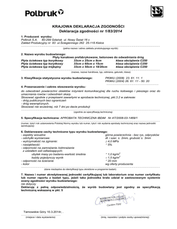 KRAJOWA DEKLARACJA ZGODNOŚCI Deklaracja zgodności nr 1/83/2014 1. Producent wyrobu: Polbruk S.A. 80-299 Gdańsk ul. Nowy Świat 16 c Zakład Produkcyjny nr 83 ul.Ściegiennego 262 25-116 Kielce .................................................................................................................................................................................................................. (pełna nazwa i adres zakładu produkującego wyrób) 2. Nazwa wyrobu budowlanego: Płyty kanałowe prefabrykowane, betonowe do odwadniania dróg Płyta ściekowa typ korytkowy 33cm x 25cm x 8cm klasa obciążenia C250 Płyta ściekowa typ korytkowy 33cm x 60cm x 15cm klasa obciążenia C250 Płyta ściekowa typ trójkątny 33cm x 50cm x 18/20cm klasa obciążenia C250 .................................................................................................................................................................................................................. (nazwa, nazwa handlowa, typ, odmiana, gatunek, klasa) 3. Klasyfikacja statystyczna wyrobu budowlanego: PKWiU (2008) 23. 61. 11. 1 PKWiU (2004) 26. 61. 11 - 50. 20 ............................................................................... 4. Przeznaczenie i zakres stosowania wyrobu: do odwodnień powierzchni obiektów inżynierii komunikacyjnej dla ruchu kołowego i pieszego oraz do umacniania rowów i odwodnień skarp. Stosować zgodnie z przepisami zawartymi w aprobacie technicznej, pkt.3.2 w zakresie: - dróg publicznych bez ograniczeń - dróg wewnętrznych. Stosować nie wcześniej, niż 7 dni po dacie produkcji .................................................................................................................................................................................................................. (zgodnie ze specyfikacją techniczną) 5. Specyfikacja techniczna: APROBATA TECHNICZNA IBDiM Nr AT/2008-03-1469/1 .................................................................................................................................................................................................................. (numer, tytuł i rok ustanowienia Polskiej Normy wyrobu lub numer, tytuł i rok wydania aprobaty technicznej oraz nazwa jednostki aprobującej) 6. Deklarowane cechy techniczne typu wyrobu budowlanego: - aspekty wizualne górna powierzchnia - bez rys, odprysków - odchyłki wymiarowe: dł. i szer. ± 2mm, grubość ± 3mm - wytrzymałość na zginanie: ≥ 4,0 MPa - nasiąkliwość: ≤ 5% - odporność na zamrażanie /odmrażanie z udziałem soli odladzających: ≤ 1,0 kg/m2 ubytek masy po badaniu-wartość średnia każdy pojedynczy wynik < 1,5 kg/m2 - odporność na ścieranie ≤ 20 mm - kolor wg oferty producenta .................................................................................................................................................................................................................. (dane niezbędne do identyfikacji typu określone w programie badań) 7. Nazwa i numer akredytowanej jednostki certyfikującej lub laboratorium oraz numer certyfikatu lub numer raportu z badań typu, jeżeli taka jednostka brała udział w zastosowanym systemie oceny zgodności wyrobu budowlanego: nie dotyczy Deklaruję z pełną odpowiedzialnością, że wyrób budowlany jest zgodny ze specyfikacją techniczną wskazaną w pkt. 5 Tarnowskie Góry 10.3.2014r, . ………………………………………….. (miejsce i data wystawienia) ……………………………………………………….. (imię, nazwisko i podpis osoby upoważnionej)