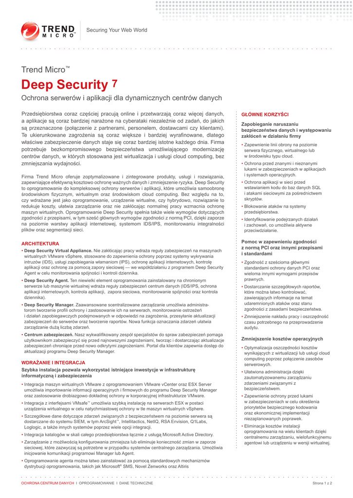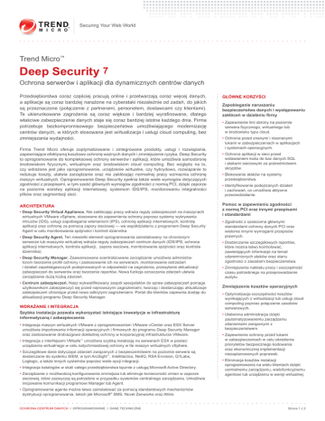 Securing Your Web World Trend Micro™ Deep Security 7 Ochrona serwerów i aplikacji dla dynamicznych centrów danych Przedsiębiorstwa coraz częściej pracują online i przetwarzają coraz więcej danych, a aplikacje są coraz bardziej narażone na cyberataki niezależnie od zadań, do jakich są przeznaczone (połączenie z partnerami, personelem, dostawcami czy klientami). Te ukierunkowane zagrożenia są coraz większe i bardziej wyrafinowane, dlatego właściwe zabezpieczenie danych staje się coraz bardziej istotne każdego dnia. Firma potrzebuje bezkompromisowego bezpieczeństwa umożliwiającego modernizację centrów danych, w których stosowana jest wirtualizacja i usługi cloud computing, bez zmniejszania wydajności. Firma Trend Micro oferuje zoptymalizowane i zintegrowane produkty, usługi i rozwiązania, zapewniające efektywną kosztowo ochronę ważnych danych i zmniejszenie ryzyka. Deep Security to oprogramowanie do kompleksowej ochrony serwerów i aplikacji, które umożliwia samoobronę środowiskom fizycznym, wirtualnym oraz środowiskom cloud computing. Bez względu na to, czy wdrażane jest jako oprogramowanie, urządzenie wirtualne, czy hybrydowo, rozwiązanie to redukuje koszty, ułatwia zarządzanie oraz nie zakłócając normalnej pracy wzmacnia ochronę maszyn wirtualnych. Oprogramowanie Deep Security spełnia także wiele wymogów dotyczących zgodności z przepisami, w tym sześć głównych wymogów zgodności z normą PCI, dzięki zaporze na poziomie warstwy aplikacji internetowej, systemom IDS/IPS, monitorowaniu integralności plików oraz segmentacji sieci. ARCHITEKTURA • Deep Security Virtual Appliance. Nie zakłócając pracy wdraża reguły zabezpieczeń na maszynach wirtualnych VMware vSphere, stosowane do zapewnienia ochrony poprzez systemy wykrywania intruzów (IDS), usługi zapobiegania włamaniom (IPS), ochronę aplikacji internetowych, kontrolę aplikacji oraz ochronę za pomocą zapory sieciowej — we współdziałaniu z programem Deep Security Agent w celu monitorowania spójności i kontroli dziennika. • Deep Security Agent. Ten niewielki element oprogramowania zainstalowany na chronionym serwerze lub maszynie wirtualnej wdraża reguły zabezpieczeń centrum danych (IDS/IPS, ochrona aplikacji internetowych, kontrola aplikacji, zapora sieciowa, monitorowanie spójności oraz kontrola dziennika). • Deep Security Manager. Zaawansowane scentralizowane zarządzanie umożliwia administra torom tworzenie profili ochrony i zastosowanie ich na serwerach, monitorowanie ostrzeżeń i działań zapobiegawczych podejmowanych w odpowiedzi na zagrożenia, przesyłanie aktualizacji zabezpieczeń do serwerów oraz tworzenie raportów. Nowa funkcja oznaczania zdarzeń ułatwia zarządzanie dużą liczbą zdarzeń. • Centrum zabezpieczeń. Nasz wykwalifikowany zespół specjalistów do spraw zabezpieczeń pomaga użytkownikom zabezpieczyć się przed najnowszymi zagrożeniami, tworząc i dostarczając aktualizacje zabezpieczeń chroniące przed nowo odkrytymi zagrożeniami. Portal dla klientów zapewnia dostęp do aktualizacji programu Deep Security Manager. WDRAŻANIE I INTEGRACJA Szybka instalacja pozwala wykorzystać istniejące inwestycje w infrastrukturę informatyczną i zabezpieczenia • Integracja maszyn wirtualnych VMware z oprogramowaniem VMware vCenter oraz ESX Server umożliwia importowanie informacji operacyjnych i firmowych do programu Deep Security Manager oraz zastosowanie drobiazgowo dokładnej ochrony w korporacyjnej infrastrukturze VMware. • Integracja z interfejsami VMsafe™ umożliwia szybką instalację na serwerach ESX w postaci urządzenia wirtualnego w celu natychmiastowej ochrony w tle maszyn wirtualnych vSphere. • Szczegółowe dane dotyczące zdarzeń związanych z bezpieczeństwem na poziomie serwera są dostarczane do systemu SIEM, w tym ArcSight™, Intellitactics, NetIQ, RSA Envision, Q1Labs, Loglogic, a także innych systemów poprzez wiele opcji integracji. • Integracja katalogów w skali całego przedsiębiorstwa łącznie z usługą Microsoft Active Directory. • Zarządzanie z możliwością konfigurowania zmniejsza lub eliminuje konieczność zmian w zaporze sieciowej, które zazwyczaj są potrzebne w przypadku systemów centralnego zarządzania. Umożliwia inicjowanie komunikacji programowi Manager lub Agent. GŁÓWNE KORZYŚCI Zapobieganie naruszaniu bezpieczeństwa danych i występowaniu zakłóceń w działaniu firmy • Zapewnienie linii obrony na poziomie serwera fizycznego, wirtualnego lub w środowisku typu cloud. • Ochrona przed znanymi i nieznanymi lukami w zabezpieczeniach w aplikacjach i systemach operacyjnych. • Ochrona aplikacji w sieci przed wstawianiem kodu do baz danych SQL i atakami sieciowymi za pośrednictwem skryptów. • Blokowanie ataków na systemy przedsiębiorstwa. • Identyfikowanie podejrzanych działań i zachowań, co umożliwia aktywne przeciwdziałanie. Pomoc w zapewnieniu zgodności z normą PCI oraz innymi przepisami i standardami • Zgodność z sześcioma głównymi standardami ochrony danych PCI oraz wieloma innymi wymogami przepisów prawnych. • Dostarczanie szczegółowych raportów, które można łatwo kontrolować, zawierających informacje na temat udaremnionych ataków oraz stanu zgodności z zasadami bezpieczeństwa. • Zmniejszenie nakładu pracy i oszczędność czasu potrzebnego na przeprowadzenie audytu. Zmniejszenie kosztów operacyjnych • Optymalizacja oszczędności kosztów wynikających z wirtualizacji lub usługi cloud computing poprzez połączenie zasobów serwerowych. • Ułatwiona administracja dzięki zautomatyzowanemu zarządzaniu zdarzeniami związanymi z bezpieczeństwem. • Zapewnienie ochrony przed lukami w zabezpieczeniach w celu określenia priorytetów bezpiecznego kodowania oraz ekonomicznej implementacji niezaplanowanych poprawek. • Eliminacja kosztów instalacji oprogramowania na wielu klientach dzięki centralnemu zarz