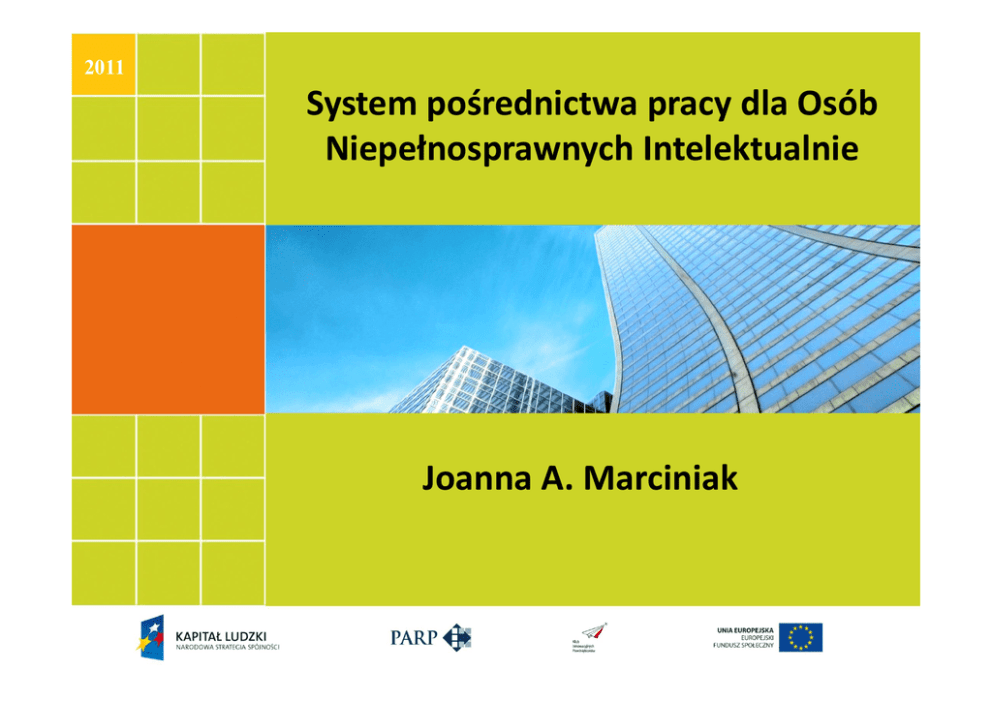 2011 System pośrednictwa pracy dla Osób Niepełnosprawnych Intelektualnie Joanna A. Marciniak [email protected] Pomost między pracodawcami a niepełnosprawnymi zdolnymi do pracy System składa się z: • • Komputerowego Testu Zainteresowań Zawodowych (KTZZ Interaktywnej bazy danych [email protected] Aktywizacja zawodowa Osób Niepełnosprawnych Intelektualnie • Test adekwatny do możliwości osób badanych • Szybka diagnoza zainteresowań zawodowych • Badanie w sposób naturalny stanowi trening korzystania z komputera • Gromadzenie informacji na temat osób poszukujących pracy i pracodawców [email protected] Konstrukcja KTZZ Cel: eliminacja trudności wynikających z niepełnosprawności intelektualnej. •itemy w postaci z filmów •wybór pozycji podyktowany dostępnymi zawodami i poprzedzony badaniem rynku pracy, •test dostępny dla osób upośledzonych w stopniu lekkim i umiarkowanym, •charakterystyka psychometryczna na podstawie populacji ONI. KTZZ przeszedł pomyślnie badania pilotażowe w zakresie: •trafności, •rzetelności, •łatwości obsługi. [email protected] Co dalej? System pośrednictwa pracy dla Osób Niepełnosprawnych Intelektualnie czeka na możliwość wykorzystania w urzędach pracy, szkołach oraz wszelkiego typu placówkach zajmujących się wspieraniem ONI. Autorka chciałaby rozwinąć współpracę w zakresie działalności badawczej, rozwoju metody, bądź jej zastosowania na innych grupach. Dziękuję za uwagę! Zainteresowanych jakąkolwiek formą współpracy zapraszam do kontaktu: [email protected]
