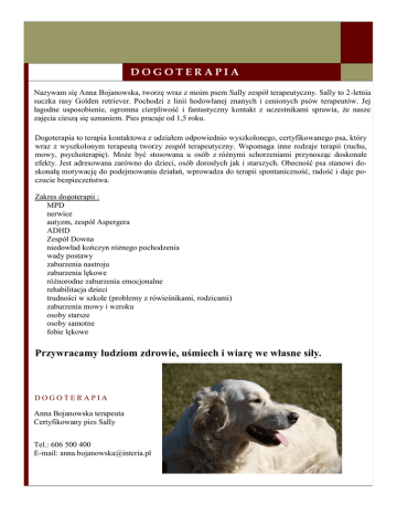 DOGOTERAPIA Nazywam się Anna Bojanowska, tworzę wraz z moim psem Sally zespół terapeutyczny. Sally to 2-letnia suczka rasy Golden retriever. Pochodzi z linii hodowlanej znanych i cenionych psów terapeutów. Jej łagodne usposobienie, ogromna cierpliwość i fantastyczny kontakt z uczestnikami sprawia, że nasze zajęcia cieszą się uznaniem. Pies pracuje od 1,5 roku. Dogoterapia to terapia kontaktowa z udziałem odpowiednio wyszkolonego, certyfikowanego psa, który wraz z wyszkolonym terapeutą tworzy zespół terapeutyczny. Wspomaga inne rodzaje terapii (ruchu, mowy, psychoterapię). Może być stosowana u osób z różnymi schorzeniami przynosząc doskonałe efekty. Jest adresowana zarówno do dzieci, osób dorosłych jak i starszych. Obecność psa stanowi doskonałą motywację do podejmowania działań, wprowadza do terapii spontaniczność, radość i daje poczucie bezpieczeństwa. Zakres dogoterapii : MPD nerwice autyzm, zespół Aspergera ADHD Zespół Downa niedowład kończyn różnego pochodzenia wady postawy zaburzenia nastroju zaburzenia lękowe różnorodne zaburzenia emocjonalne rehabilitacja dzieci trudności w szkole (problemy z rówieśnikami, rodzicami) zaburzenia mowy i wzroku osoby starsze osoby samotne fobie lękowe Przywracamy ludziom zdrowie, uśmiech i wiarę we własne siły. DOGOTERAPIA Anna Bojanowska terapeuta Certyfikowany pies Sally Tel.: 606 500 400 E-mail: [email protected]