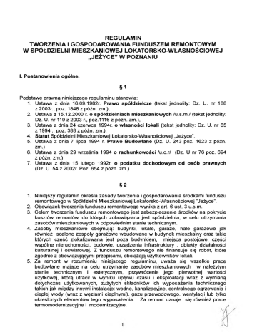 REGULAMIN TWORZENIA I GOSPODAROWANIA FUNDUSZEM REMONTOWYM W SPÓŁDZIELNI MIESZKANIOWEJ LOKATORSKO-WŁASNOŚCIOWEJ „JEŻYCE” W POZNANIU I. Postanowienia ogólne. §1 Podstawę prawną niniejszego regulaminu stanowią: 1. Ustawa z dnia 16.09.1982r. Prawo spółdzielcze (tekst jednolity: Dz. U. nr 188 z 2003r., poz. 1848 z późn. zm.), 2. Ustawa z 15.12.2000 r. o spółdzielniach mieszkaniowych /u.s.m./ (tekst jednolity: Dz. U. nr 119 z 2003 r., poz.1116 z późn. zm.), 3. Ustawa z dnia 24 czerwca 1994r. o własności lokali (tekst jednolity: Dz. U. nr 85 z 1994r., poz. 388 z późn. zm.), 4. Statut Spółdzielni Mieszkaniowej Lokatorsko-Własnościowej „Jeżyce”. 5. Ustawa z dnia 7 lipca 1994 r. Prawo Budowlane (Dz. U. 243 poz. 1623 z późn. zm.) 6. Ustawa z dnia 29 września 1994 o rachunkowości /u.o.r/ (Dz. U nr 76 poz. 694 z późn. zm.) 7. Ustawa z dnia 15 lutego 1992r. o podatku dochodowym od osób prawnych (Dz. U. 54 z 2002r. Poz. 654 z późn. zm.) §2 1. Niniejszy regulamin określa zasady tworzenia i gospodarowania środkami funduszu remontowego w Spółdzielni Mieszkaniowej Lokatorsko-Własnościowej ’’Jeżyce”. 2. Obowiązek tworzenia funduszu remontowego wynika z art. 6 ust. 3 u.s.m. 3. Celem tworzenia funduszu remontowego jest zabezpieczenie środków na pokrycie kosztów remontów, do których zobowiązana jest spółdzielnia, w celu utrzymania zasobów mieszkaniowych w odpowiednim stanie technicznym. 4. Zasoby mieszkaniowe obejmują: budynki, lokale, garaże, hale garażowe jak również scalone zespoły garażowe wbudowane w budynek mieszkalny oraz takie których część zlokalizowana jest poza budynkiem, miejsca postojowe, części wspólne nieruchomości, budowle, urządzenia infrastruktury , obiekty działalności kulturalnej i oświatowej. Z funduszu remontowego nie finansuje się robót, które zgodnie z obowiązującymi przepisami, obciążają użytkowników lokali. 5. Za remont w rozumieniu niniejszego regulaminu, uważa się wszelkie prace budowlane mające na celu utrzymanie zasobów mieszkaniowych w należytym stanie technicznym i estetycznym, przywrócenie jego pierwotnej wartości użytkowej, którą utracił w wyniku upływu czasu i eksploatacji wraz z wymianą dotychczas użytkowanych, zużytych składników ich wyposażenia technicznego takich jak między innymi instalacje: wodne, kanalizacyjne, centralnego ogrzewania i ciepłej wody (wraz z węzłami cieplnymi), gazu przewodowego, wentylacji lub tylko określonych elementów tego wyposażenia. Za remont uznaje się również prace termomodernizacyjne i modernizacyjne. II. Tworzenie funduszu i wydatkowanie środków. §3 1. Źródłami tworzenia funduszu remontowego są: 1) odpisy dokonywane w ciężar kosztów gospodarki zasobami mieszkaniowymi w wysokości ustalonej w planie gospodarczo-finansowym Spółdzielni, uchwalonym przez Radę Nadzorczą, 2) wpływy na wymianę wodomierzy i ciepłomierzy lokalowych, 3) wpływy przypadające na remonty dźwigów, 4) kwoty uzyskane od wykonawców z tytułu wad, usterek oraz uzyskane odszkodowania z firm ubezpieczeniowych dotyczące usuwania szkód w zasobach mieszkaniowych, 5) uzyskane nadwyżki bilansowe z prowadzonej działalności gospodarczej, 6) inne wpływy np. premie termomodernizacyjne i dotacje. 2. Spółdzielnia może przejściowo w formie pożyczki wewnętrznej zasilić fundusz remontowy wolnymi środkami funduszu zasobowego. Decyzję o zasileniu funduszu podejmuje Zarząd Spółdzielni w formie uchwały, w której określa wielkość pożyczki oraz okres na jaki zostaje udzielona. §4 1. Fundusz remontowy przeznaczony jest na pokrycie kosztów remontów zasobów mieszkaniowych określonych w § 2 ust. 4, z zastrzeżeniem postanowienia zawartego w § 5 ust. 2 2. Środki funduszu remontowego ponadto przeznacza się na: 1) spłatę kredytów bankowych i pożyczek zaciągniętych na remonty zasobów mieszkaniowych, 2) zapłaty dla firm ubezpieczeniowych z tytułów regresów za wypłacone kwoty odszkodowań dla członków Spółdzielni oraz odszkodowania za mieszkania nie ubezpieczone, 3) finansowanie robót remontowych obciążających Spółdzielnię na podstawie Regulaminu określającego obowiązki Spółdzielni i jej członków w zakresie napraw wewnątrz lokali, 4) spisanie przedawnionych należności z tytułu wykonawstwa remontowego. §5 1. Wysokości stawek odpisów, o których mowa w § 3 ust.1 pkt 1 są określane w planie gospodarczo-finansowym Spółdzielni, uchwalanym przez Radę Nadzorczą na dany rok. Zmiana stawki odpisu dokonywana jest uchwałą Rady Nadzorczej. Jt / 2. Użytkownicy garaży wolnostojących oraz zespołów garażowych wolnostojących jak również garaży stanowiących scalona grupę , której część jest zlokalizowana poza budynkiem nie wnoszą odpisów na fundusz remontowy, z uwagi na obowiązek pokrywania przez nich pełnych kosztów remontów we własnym zakresie. 3. Właściciele i osoby posiadające własnościowe spółdzielcze prawo do garaży wbudowanych w budynkach mieszkalnych oraz miejsc postojowych znajdujących się wewnątrz budynków wnoszą odpisy na fundusz remontowy w wysokości 50% miesięcznej stawki odpisu na ten fundusz, obowiązującej dla lokali mieszkalnych dla danej nieruchomości (w zł/m2 p.u.). §6 1. Wysokość stawki odpisu na fundusz remontowy jest jednakowa dla wszystkich nieruchomości, przy czym może ona ulec podwyższeniu dla poszczególnych nieruchomości, w przypadku ustalenia potrzeb remontowych, przekraczających zakumulowane środki funduszu remontowego niewystarczające na bieżące finansowanie robót remontowych. Rada Nadzorcza może podjąć decyzję o podwyższeniu stawki dla danej nieruchomości. Rada Nadzorcza może podjąć decyzję o obniżeniu stawki odpisu na fundusz remontowy w nieruchomościach, w których zakumulowane środki funduszu remontowego wystarczają na bieżące finansowanie robót remontowych oraz robót przewidzianych do wykonania w najb