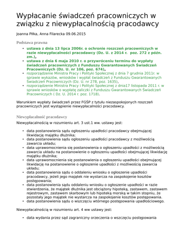Wypłacanie świadczeń pracowniczych w związku z niewypłacalnością pracodawcy Joanna Piłka, Anna Filarecka 09.06.2015 Podstawa prawna • ustawa z dnia 13 lipca 2006r. o ochronie roszczeń pracowniczych w razie niewypłacalności pracodawcy (Dz. U. z 2014 r. poz. 272 z późn. zm.), • ustawa z dnia 6 maja 2010 r. o przywróceniu terminu do wypłaty świadczeń pracowniczych z Funduszu Gwarantowanych Świadczeń Pracowniczych (Dz. U. nr 106, poz. 674), • rozporządzenie Ministra Pracy i Polityki Społecznej z dnia 7 grudnia 2011r. w sprawie wykazów, wniosków i wypłat świadczeń z Funduszu Gwarantowanych Świadczeń Pracowniczych (Dz. U. nr 278, poz. 1635), • rozporządzenie Ministra Pracy i Polityki Społecznej z dnia17 listopada 2011 r. w sprawie wniosków o wypłatę zaliczki z Funduszu Gwarantowanych Świadczeń Pracowniczych ( Dz. U. 2014 r. poz. 1718). Warunkiem wypłaty świadczeń przez FGŚP z tytułu niezaspokojonych roszczeń pracowniczych jest wystąpienie niewypłacalności pracodawcy. Niewypłacalność pracodawcy Niewypłacalnością w rozumieniu art. 3 ust.1 ww. ustawy jest: • data postanowienia sądu ogłoszeniu upadłości pracodawcy obejmującej likwidację majątku dłużnika; • data postanowienia sądu ogłoszeniu upadłości pracodawcy z możliwością zawarcia układu; • data uprawomocnienia się postanowienia o ogłoszeniu upadłości z możliwością zawarcia układu na postanowienie o ogłoszeniu upadłości obejmującej likwidację majątku dłużnika; • data uprawomocnienia się postanowienia o ogłoszeniu upadłości obejmującej likwidację na postanowienie o ogłoszenie upadłości z możliwością zawarcia układu; • data postanowienia sądu o oddaleniu wniosku o ogłoszenie upadłości pracodawcy, jeżeli jego majątek nie wystarcza na zaspokojenie kosztów postępowania; • data postanowienia sądu oddaleniu wniosku o ogłoszenie upadłości w razie stwierdzenia, że majątek dłużnika jest obciążony hipoteką, zastawem, zastawem rejestrowym, zastawem skarbowym lub hipoteką morską w takim stopniu, że pozostały jego majątek nie wystarcza na zaspokojenie kosztów postępowania. • data postanowienia sądu o wszczęciu wtórnego postępowania upadłościowego. Niewypłacalnością w rozumieniu art. 4 ww ustawy jest: • data wydania przez sąd zagraniczny orzeczenia o wszczęciu postępowania upadłościowego, postępowania układowego lub innego podobnego postępowania w państwach członkowskich Unii Europejskiej lub w państwach członkowskich Europejskiego Porozumienia o Wolnym Handlu (EFTA) - stronach umowy o Europejskim Obszarze Gospodarczym wobec instytucji kredytowych i zakładów ubezpieczeń mających siedziby w tych państwach; • data wydania przez sąd zagraniczny orzeczenia, zgodnie z którym nie zostaje wszczęte postępowanie upadłościowe z uwagi na stwierdzenie definitywnego zamknięcia przedsiębiorstwa albo z powodu niewystarczalności aktywów na zaspokojenie kosztów tego postępowania. Niewypłacalnością w rozumieniu art. 5 ww ustawy jest: • data wydania przez sąd upadłościowy postanowienia o uznaniu zagranicznego postępowania upadłościowego wszczętego wobec przedsiębiorcy zagranicznego z Danii lub państw członkowskich Europejskiego Porozumienia o Wolnym Handlu (EFTA) - stron umowy o Europejskim Obszarze Gospodarczym, zgodnie z przepisami Prawa upadłościowego i naprawczego dotyczącymi międzynarodowego postępowania upadłościowego, • data wydania przez sąd zagraniczny orzeczenia, zgodnie z którym nie zostaje wszczęte postępowanie upadłościowe z uwagi na stwierdzenie definitywnego zamknięcia przedsiębiorstwa albo z powodu niewystarczalności aktywów na zaspokojenie kosztów tego postępowania. Niewypłacalnością w rozumieniu art. 6 ww ustawy jest: • data wydania orzeczenia przez organ sądowy lub każdy inny właściwy organ państwa członkowskiego Unii Europejskiej, z wyłączeniem Danii, uprawniony do wszczęcia postępowania upadłościowego, zgodnie z art. 3 ust. 1 rozporządzenia Rady (WE) nr 1346/2000, o wszczęciu wobec przedsiębiorcy zagranicznego postępowania upadłościowego, o którym mowa w art. 2 lit. a lub lit. c tego rozporządzenia, oraz powoła zarządcę; zarządca, w rozumieniu art. 2 lit. b rozporządzenia Rady (WE) nr 1346/2000, obwieszcza w Monitorze Sądowym i Gospodarczym o wydaniu orzeczenia o wszczęciu postępowania upadłościowego, o wydaniu orzeczenia o powołaniu zarządcy oraz dane o osobie zarządcy. Obwieszczenie zawiera istotną treść orzeczenia o wszczęciu postępowania oraz orzeczenia o powołaniu zarządcy, informacje o osobie zarządcy oraz informację, że właściwość sądu wynika z art. 3 ust. 1 rozporządzenia Rady (WE) nr 1346/2000. • data wydania orzeczenia przez organ sądowy lub każdy inny właściwy organ państwa członkowskiego Unii Europejskiej, z wyłączeniem Danii, uprawniony do wszczęcia postępowania upadłościowego, zgodnie z art. 3 ust. 1 rozporządzenia Rady (WE) nr 1346/2000, zgodnie z którym nie zostaje wszczęte postępowanie upadłościowe z uwagi na stwierdzenie definitywnego zamknięcia przedsiębiorstwa albo z powodu niewystarczalności aktywów na zaspokojenie kosztów tego postępowania; • data wydania przez sąd upadłościowy postanowienia, zgodnie z art. 3 ust. 2 i 4 rozporządzenia Rady (WE) nr 1346/2000, o ogłoszeniu upadłości przedsiębiorcy zagranicznego, mające skutki ograniczone do majątku dłużnika znajdującego się na terytorium Rzeczypospolitej Polskiej. Zgodnie z art. 8. 1. niewypłacalność pracodawcy, o którym mowa w art. 2 ust. 1, zachodzi również, gdy w postępowaniu krajowym w razie niezaspokojenia przez pracodawcę roszczeń pracowniczych z powodu braku środków finansowych: • na podstawie przepisów Prawa upadłościowego i naprawczego sąd upadłościowy wyda postanowienie o umorzeniu postępowania upadłościowego obejmującego likwidację majątku 