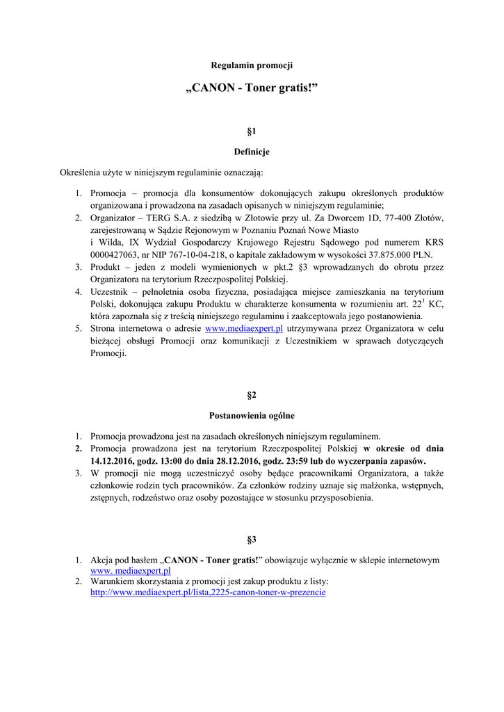 Regulamin promocji „CANON - Toner gratis!” §1 Definicje Określenia użyte w niniejszym regulaminie oznaczają: 1. Promocja – promocja dla konsumentów dokonujących zakupu określonych produktów organizowana i prowadzona na zasadach opisanych w niniejszym regulaminie; 2. Organizator – TERG S.A. z siedzibą w Złotowie przy ul. Za Dworcem 1D, 77-400 Złotów, zarejestrowaną w Sądzie Rejonowym w Poznaniu Poznań Nowe Miasto i Wilda, IX Wydział Gospodarczy Krajowego Rejestru Sądowego pod numerem KRS 0000427063, nr NIP 767-10-04-218, o kapitale zakładowym w wysokości 37.875.000 PLN. 3. Produkt – jeden z modeli wymienionych w pkt.2 §3 wprowadzanych do obrotu przez Organizatora na terytorium Rzeczpospolitej Polskiej. 4. Uczestnik – pełnoletnia osoba fizyczna, posiadająca miejsce zamieszkania na terytorium Polski, dokonująca zakupu Produktu w charakterze konsumenta w rozumieniu art. 22 1 KC, która zapoznała się z treścią niniejszego regulaminu i zaakceptowała jego postanowienia. 5. Strona internetowa o adresie www.mediaexpert.pl utrzymywana przez Organizatora w celu bieżącej obsługi Promocji oraz komunikacji z Uczestnikiem w sprawach dotyczących Promocji. §2 Postanowienia ogólne 1. Promocja prowadzona jest na zasadach określonych niniejszym regulaminem. 2. Promocja prowadzona jest na terytorium Rzeczpospolitej Polskiej w okresie od dnia 14.12.2016, godz. 13:00 do dnia 28.12.2016, godz. 23:59 lub do wyczerpania zapasów. 3. W promocji nie mogą uczestniczyć osoby będące pracownikami Organizatora, a także członkowie rodzin tych pracowników. Za członków rodziny uznaje się małżonka, wstępnych, zstępnych, rodzeństwo oraz osoby pozostające w stosunku przysposobienia. §3 1. Akcja pod hasłem „CANON - Toner gratis!” obowiązuje wyłącznie w sklepie internetowym www. mediaexpert.pl 2. Warunkiem skorzystania z promocji jest zakup produktu z listy: http://www.mediaexpert.pl/lista,2225-canon-toner-w-prezencie 3. Klient przy zakupie wybranego produktu z pkt. 2 §3 otrzyma toner zgodnie z wykazem: 4. Aby skorzystać z promocji należy dodać wybrany produkt do koszyka, w którym automatycznie zostanie dodany odpowiedni model tonera w cenie 1 zł przy czym kwota 1zł będzie pomniejszać cenę wybranego ekspresu. 5. W przypadku zwrotu zakupionego produktu, zwrotowi podlega również produkt gratisowy, otrzymany wraz z produktem głównym. 6. W przypadku zakupu na raty w okresie obowiązywania akcji warunkiem skorzystania z aktualnych promocji ratalnych jest indywidualna ocena zdolności kredytowej Klienta przez bank. W przypadku negatywnej odpowiedzi banku na wniosek kredytowy Klienta zostaną zaproponowane inne alternatywne formy płatności. (Wysokość rat zaprezentowanych w akcji nie zawiera ubezpieczenia. RRSO dla kredytu w opcji bez ubezpieczenia wynosi 0%. Minimalna wartość brutto towaru nabywanego w systemie ratalnym wynosi 100zł. Ubezpieczenie spłaty kredytu ma charakter dobrowolny i stanowi zabezpieczenie pożyczki/kredytu w momencie zgody Klienta na zawarcie umowy ubezpieczenia kredytu. Stopa procentowa dla kredytu 0% w zakresie od 3 do 40 miesięcy wynosi od 0% do 32,6% w zależności od wybranego banku i rodzaju ubezpieczenia.) 7. Materiały reklamowe zaprezentowane na stronie www.mediaexpert.pl nie stanowią oferty w rozumieniu art.66§ 1K.C §4 Reklamacje 1. Reklamacje związane z Promocją mogą być zgłaszane mailowo na adres: [email protected]., przez cały czas trwania promocji, jednak nie później niż w terminie 21 dni od dnia jej zakończenia. 2. Reklamacje spóźnione nie będą rozpatrywane. Organizator rozpatruje reklamacje oraz przekazuje informacje zainteresowanemu w terminie do 14 (czternastu) dni od daty wpłynięcia reklamacji. Za przekazanie odpowiedzi na reklamację w terminie 14 uznaje się wysłanie listu poleconego w tym terminie. §5 Ochrona danych osobowych 1. Administratorem danych osobowych jest Organizator. 2. Dane osobowe Uczestników przetwarzane będą przy zachowaniu zasad określonych w ustawie z dnia 29 sierpnia 1997 r. o ochronie danych osobowych (Dz. U. 2002 Nr 101 poz. 926 z póź. zm.) w celu przeprowadzenia Promocji i wyłonienia osób nagrodzonych. Podanie danych osobowych jest dobrowolne, jednak jest niezbędne w celu wzięcia udziału w Promocji, przyznania i odbioru nagród i prezentów. Uczestnikowi przysługuje prawo wglądu do danych osobowych, ich poprawiania oraz żądania ich usunięcia. 3. Przetwarzanie danych osobowych obejmować będzie zakres danych wskazanych w formularzu rejestracyjnym. Za odrębną zgodą Uczestnika wyrażoną w zgłoszeniu Organizatorowi przysługiwać będzie prawo do przetwarzania danych osobowych w celach marketingowych oraz prawo przesyłania informacji handlowej drogą elektroniczną. 4. Uczestnik jest zobowiązany do informowania Organizatora na piśmie o każdej zmianie w zakresie danych osobowych. Niezależnie od innych postanowień niniejszego regulaminu, w przypadku nie dokonania aktualizacji danych osobowych przez Uczestnika Organizator nie ponosi odpowiedzialności za opóźnienie lub brak działania spowodowany brakiem takiej aktualizacji, a w szczególności za niemożność wydania nagrody w konkursie lub prezentu. §7 Postanowienia końcowe 1. Regulamin wchodzi w życie z dniem 14.12.2016 i będzie dostępny w okresie trwania Promocji w siedzibie Organizatora oraz na Stronie internetowej: http://www.mediaexpert.pl/lp,2225-canon-toner-w-prezencie 2. Tytuły poszczególnych punktów regulaminu mają charakter informacyjny i nie stanowią części regulaminu. 3. We wszystkich sprawach dotyczących Promocji, a nieuregulowanych regulaminem mają zastosowanie przepisy prawa polskiego. 4. Niniejsza Promocja nie jest grą losową ani zakładem wzajemnym, których wynik zależy od przypadku (przeprowadzenie losowania) w rozumieniu art. 2 ustawy z dnia 19 listopada 2009 roku o grach hazardowych (Dz. U. Nr 201 poz. 1540).