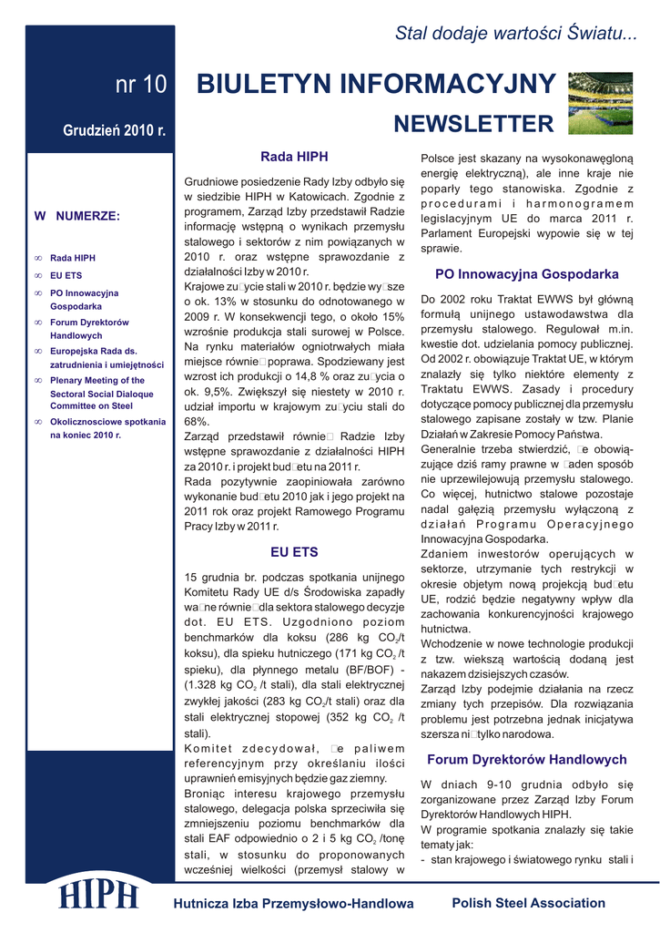 Stal dodaje wartości Światu... nr 10 BIULETYN INFORMACYJNY Grudzień 2010 r. NEWSLETTER Rada HIPH W NUMERZE: • Rada HIPH • EU ETS • PO Innowacyjna Gospodarka • Forum Dyrektorów Handlowych • Europejska Rada ds. zatrudnienia i umiejętności • Plenary Meeting of the Sectoral Social Dialoque Committee on Steel • Okolicznosciowe spotkania na koniec 2010 r. Grudniowe posiedzenie Rady Izby odbyło się w siedzibie HIPH w Katowicach. Zgodnie z programem, Zarząd Izby przedstawił Radzie informację wstępną o wynikach przemysłu stalowego i sektorów z nim powiązanych w 2010 r. oraz wstępne sprawozdanie z działalności Izby w 2010 r. Krajowe zużycie stali w 2010 r. będzie wyższe o ok. 13% w stosunku do odnotowanego w 2009 r. W konsekwencji tego, o około 15% wzrośnie produkcja stali surowej w Polsce. Na rynku materiałów ogniotrwałych miała miejsce również poprawa. Spodziewany jest wzrost ich produkcji o 14,8 % oraz zużycia o ok. 9,5%. Zwiększył się niestety w 2010 r. udział importu w krajowym zużyciu stali do 68%. Zarząd przedstawił również Radzie Izby wstępne sprawozdanie z działalności HIPH za 2010 r. i projekt budżetu na 2011 r. Rada pozytywnie zaopiniowała zarówno wykonanie budżetu 2010 jak i jego projekt na 2011 rok oraz projekt Ramowego Programu Pracy Izby w 2011 r. EU ETS 15 grudnia br. podczas spotkania unijnego Komitetu Rady UE d/s Środowiska zapadły ważne również dla sektora stalowego decyzje dot. EU ETS. Uzgodniono poziom benchmarków dla koksu (286 kg CO2/t koksu), dla spieku hutniczego (171 kg CO2 /t spieku), dla płynnego metalu (BF/BOF) (1.328 kg CO2 /t stali), dla stali elektrycznej zwykłej jakości (283 kg CO2/t stali) oraz dla stali elektrycznej stopowej (352 kg CO2 /t stali). Komitet zdecydował, że paliwem referencyjnym przy określaniu ilości uprawnień emisyjnych będzie gaz ziemny. Broniąc interesu krajowego przemysłu stalowego, delegacja polska sprzeciwiła się zmniejszeniu poziomu benchmarków dla stali EAF odpowiednio o 2 i 5 kg CO2 /tonę stali, w stosunku do proponowanych wcześniej wielkości (przemysł stalowy w Hutnicza Izba Przemysłowo-Handlowa Polsce jest skazany na wysokonawęgloną energię elektryczną), ale inne kraje nie poparły tego stanowiska. Zgodnie z procedurami i harmonogramem legislacyjnym UE do marca 2011 r. Parlament Europejski wypowie się w tej sprawie. PO Innowacyjna Gospodarka Do 2002 roku Traktat EWWS był główną formułą unijnego ustawodawstwa dla przemysłu stalowego. Regulował m.in. kwestie dot. udzielania pomocy publicznej. Od 2002 r. obowiązuje Traktat UE, w którym znalazły się tylko niektóre elementy z Traktatu EWWS. Zasady i procedury dotyczące pomocy publicznej dla przemysłu stalowego zapisane zostały w tzw. Planie Działań w Zakresie Pomocy Państwa. Generalnie trzeba stwierdzić, że obowiązujące dziś ramy prawne w żaden sposób nie uprzewilejowują przemysłu stalowego. Co więcej, hutnictwo stalowe pozostaje nadal gałęzią przemysłu wyłączoną z działań Programu Operacyjnego Innowacyjna Gospodarka. Zdaniem inwestorów operujących w sektorze, utrzymanie tych restrykcji w okresie objetym nową projekcją budżetu UE, rodzić będzie negatywny wpływ dla zachowania konkurencyjności krajowego hutnictwa. Wchodzenie w nowe technologie produkcji z tzw. wiekszą wartością dodaną jest nakazem dzisiejszych czasów. Zarząd Izby podejmie działania na rzecz zmiany tych przepisów. Dla rozwiązania problemu jest potrzebna jednak inicjatywa szersza niż tylko narodowa. Forum Dyrektorów Handlowych W dniach 9-10 grudnia odbyło się zorganizowane przez Zarząd Izby Forum Dyrektorów Handlowych HIPH. W programie spotkania znalazły się takie tematy jak: - stan krajowego i światowego rynku stali i Polish Steel Association www. surowców po 10 miesiącach 2010 r. - kierunki i wielkość importu wyrobów stalowych do UE po 10 miesiącach br. - stan postępowań ochronnych prowadzonych przez UE i inne kraje Świata przeciwko importowi niektórych wyrobów stalowych. W dyskusji przedstawiciele poszczególnych podmiotów członkowskich Izby przedstawili własną ocenę rynków na surowce hutnicze i stal w IV kwartale br. oraz prognozy na 2011 rok. W ich ocenie rok 2010 był lepszy niż 2009 a IV kwartał był lepszy niż poprzednie, poprawiła się płynność finansowa firm kupujących, zamówienia uzyskiwane są z wyprzedzeniem 4-6 tygodni. W prognozach na 2011 r. panuje ostrożny optymizm, popyt powoli się odbudowuje a od II połowy roku oczekiwać się będzie wyraźnego wzrostu zamówień. Zwracano uwagę na potencjalne zagrożenia związane z rosnącymi cenami i dostępnością złomu oraz z trudnymi warunkami pogodowymi w I kwartale 2011 r. Zarząd Izby rozszerzył program Forum o dwa dodatkowe tematy: - przedstawiciel Banku Gospodarstwa Krajowego zaprezentował możliwości wykorzystania przez polskie przedsiębiorstwa instrumentów wsparcia eksportu w ramach Rządowego Programu Wspierania Eksportu. Celem programu jest aktywizacja polskiego eksportu poprzez zwiększenie konkurencyjności przedsiębiorstw krajowych na rynkach zagranicznych. Na realizację tego programu do 2015 r. przewidziano środki w wysokości 5,7 mld zł a ich beneficjentami są firmy eksportujące lub realizujące projekty inwestycyjne poza granicami Polski. - przedstawiciel austriackiej firmy Uniconsult GmbH, zaprezentował projekt utworzenia platformy gospodarczej Górny Śląsk - Górna Austria, mającej na celu wzmocnienie kooperacji ekonomiczno-gospodarczej pomiędzy tymi regionami. .org Europejska Rada ds. zatrudnienia i umiejętności W dniu 15.12.2010 r. uczestniczyliśmy w Brukseli w seminarium pt.: "Towards a European steel council on jobs and skills? Identifying the actors", które zorganizowano w ramach unijnego projektu mającego na celu utworzenie sektorowej Rady ds. zatrudnienia i umiejętności w przemyśle stalowym w UE. Z propozycją utworzenia Rady wystąpiły ws