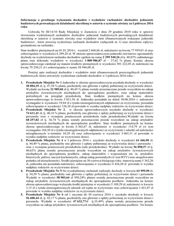 Informacja o przebiegu wykonania dochodów i wydatków rachunków dochodów jednostek budżetowych prowadzących działalność określoną w ustawie o systemie oświaty za I półrocze 2016 roku Uchwałą Nr III/14/10 Rady Miejskiej w Zamościu z dnia 29 grudnia 2010 roku w sprawie utworzenia wydzielonych rachunków dochodów jednostek budżetowych prowadzących działalność określoną w ustawie o systemie oświaty oraz wydatków nimi sfinansowanych wskazano jednostki budżetowe , które utworzą wydzielony rachunek dochodów (załącznik nr 1) oraz określono wpływy gromadzone na rachunku . Stan środków pieniężnych na 01.01.2016 r. wyniósł 2 668,66 zł, należności na kwotę 77 939,01 zł oraz zobowiązania w wysokości 6 299,28 zł. W okresie sprawozdawczym jednostki oświatowe zgromadziły dochody na wydzielonym rachunku dochodów ogółem na sumę 2 299 540,26 zł tj. 48,03% zakładanego planu oraz dokonały wydatków w wysokości 1 800 986,87 zł – 37,62 % planu. Koniec okresu sprawozdawczego zamknął się stanem środków pieniężnych w wysokości 501 222,05 zł, należności na kwotę 79 250,21 zł i zobowiązania w sumie 58 946,08 zł. Poniżej opis realizacji dochodów i wydatków nimi sfinansowanych poszczególnych jednostek budżetowych, które utworzyły wydzielone rachunki dochodów w I półroczu 2016 roku : 1. Przedszkole Miejskie Nr 1 Jednostka w okresie sprawozdawczym uzyskała dochody w wysokości 38 804,35 zł, tj. 47,58 % planu, pochodziły one głównie z opłaty pobieranej za wyżywienie dzieci. Wydatki na kwotę 32 989,04 zł tj. 40,45 % planu zostały przeznaczone przede wszystkim na zakup artykułów żywnościowych niezbędnych do sporządzenia posiłków, oraz zakup materiałów potrzebnych na przegląd przedszkola. Stan środków pieniężnych na koniec okresu sprawozdawczego to kwota 5 821,56 zł. Jednostka posiadała na dzień 30.06.2016 r. należności wymagalne w wysokości 19,84 zł z tytułu nieuregulowanych odpłatności za wyżywienie, posiadała zobowiązania w wysokości 126,28 zł powstałe w wyniku nadpłaty rodziców za wyżywienie dzieci. 2. Przedszkole Miejskie Nr 2, w okresie sprawozdawczym uzyskało dochody w wysokości 74 611,41 zł, tj. 40,16 % planu, pochodziły one głównie z opłaty pobieranej za wyżywienie dzieci i personelu oraz z wynajmu pomieszczeń przedszkola (sale przedszkolne).Wydatki na kwotę 68 257,82 zł tj. 36,74 % planu zostały przeznaczone przede wszystkim na zakup artykułów żywnościowych niezbędnych do sporządzenia posiłków. Stan środków pieniężnych na koniec okresu sprawozdawczego to kwota 6 362,67 zł, należności w wysokości 114,79 zł (w tym wymagalne 104,50 zł z tytułu nieuregulowanych odpłatności za wyżywienie i odsetki od należności niezapłaconych w terminie 10,29 zł) oraz zobowiązania w wysokości 5 065,31 zł powstałe w wyniku nadpłaty rodziców za wyżywienie dzieci. 3. Przedszkole Miejskie Nr 4 w I półroczu 2016 r. uzyskało dochody w wysokości 61 446,90 zł, tj. 44,49 % planu, pochodziły one głównie z opłaty pobieranej za wyżywienie dzieci i personelu – oraz z wynajmu pomieszczeń przedszkola (sale przedszkolne). Wydatki na kwotę 56 098,57 zł tj. 40,62% planu zostały przeznaczone przede wszystkim na zakup artykułów żywnościowych niezbędnych do sporządzenia posiłków, zakup materiałów i wyposażenia (m. in. artykułów biurowych, paliwa, naczyń kuchennych), zakup usług pozostałych (w tym RTV) oraz uregulowanie podatku od nieruchomości. Środki pieniężne na 30 czerwca bieżącego roku stanowią sumę 5 362,26 zł, jednostka nie posiadała należności, zobowiązania w wysokości 4 426,20 zł powstałe w wyniku nadpłaty rodziców za wyżywienie dzieci. 4. Przedszkole Miejskie Nr 5 Na wyodrębniony rachunek wpłynęły dochody w kwocie 63 999,90 zł, tj. 54,59 % planu, pochodziły one głównie z opłaty pobieranej za wyżywienie dzieci i personelu Wydatki w wysokości 58 903,64 zł 950,24% planu) zostały przeznaczone przede wszystkim na zakup artykułów żywnościowych niezbędnych do sporządzenia posiłków. Jednostka na koniec okresu sprawozdawczego wykazała środki pieniężne w wysokości 5 109,29 zł, należności w kwocie 3,15 zł z tytułu nieuregulowanych odsetek od wpłat za wyżywienie oraz zobowiązania 3 421,07 zł powstałe w wyniku nadpłaty rodziców za wyżywienie dzieci. 5. Przedszkole Miejskie Nr 6 od 1 stycznia do 30 czerwca 2016 r. uzyskało dochody w kwocie 56 600,44 zł, tj. 42,17 % planu, pochodziły one głównie z opłaty pobieranej za wyżywienie dzieci i personelu. Wydatki w wysokości 47 632,77zł tj.35,49% planu zostały przeznaczone przede wszystkim na zakup artykułów żywnościowych niezbędnych do sporządzenia posiłków. Na koniec 6. 7. 8. 9. 10. 11. 12. 13. okresu sprawozdawczego jednostka nie posiadała należności, posiadała zobowiązania w wysokości 4 898,50 zł powstałe w wyniku nadpłaty rodziców za wyżywienie dzieci, środki pieniężne wyniosły 8 991,35 zł. Przedszkole Miejskie Nr 7 w okresie sprawozdawczym jednostka wykazała dochody na sumę 52 360,07 zł, tj. 42,87 % planu, pochodziły one głównie z opłaty pobieranej za wyżywienie dzieci i personelu oraz z wynajmu pomieszczeń przedszkola (sale przedszkolne). Wydatki na kwotę 47 148,68 zł (38,60% planu) zostały przeznaczone przede wszystkim na zakup artykułów żywnościowych niezbędnych do sporządzenia posiłków oraz zakup wyposażenia Stan środków pieniężnych na dzień 30.06.2016 r. wynosi 5 219,98 zł, należności na kwotę 2,93 zł (odsetki) z tytułu nieuregulowanych odpłatności za wyżywienie. Jednostka posiadała zobowiązania w wysokości 3 482,49 zł powstałe w wyniku nadpłaty rodziców za wyżywienie dzieci. Przedszkole Miejskie Nr 8 Jednostka zgromadziła dochody w wysokości 82 737,23 zł, tj. 42,70 % planu, pochodziły one głównie z opłaty pobieranej za wyżywienie dzieci i personelu oraz z wynajmu