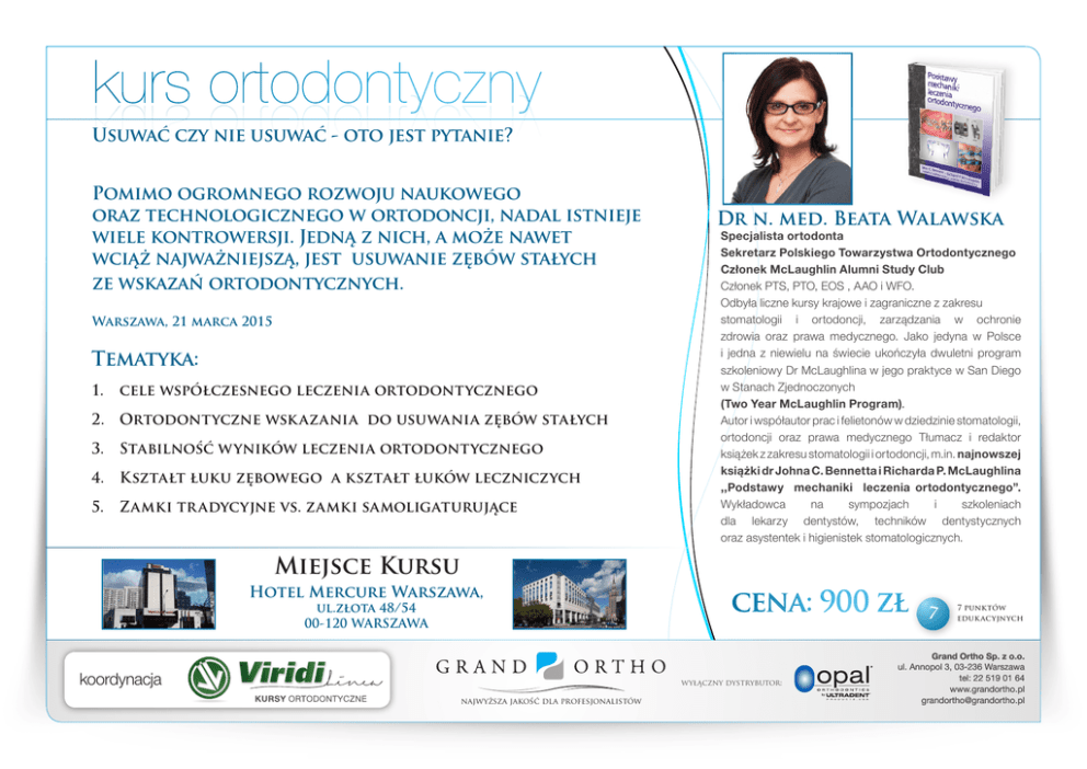 kurs ortodontyczny Usuwać czy nie usuwać - oto jest pytanie? Pomimo ogromnego rozwoju naukowego oraz technologicznego w ortodoncji, nadal istnieje wiele kontrowersji. Jedną z nich, a może nawet wciąż najważniejszą, jest usuwanie zębów stałych ze wskazań ortodontycznych. Warszawa, 21 marca 2015 Tematyka: 1. cele współczesnego leczenia ortodontycznego 2. Ortodontyczne wsk azania do usuwania zębów stałych 3. Stabilność wyników leczenia ortodontycznego 4. Kształt łuku zębowego a kształt łuków leczniczych 5. Zamki tr adycyjne vs. zamki samoligaturujące Dr n. med. Beata Walawska Specjalista ortodonta Sekretarz Polskiego Towarzystwa Ortodontycznego Członek McLaughlin Alumni Study Club Członek PTS, PTO, EOS , AAO i WFO. Odbyła liczne kursy krajowe i zagraniczne z zakresu stomatologii i ortodoncji, zarządzania w ochronie zdrowia oraz prawa medycznego. Jako jedyna w Polsce i jedna z niewielu na świecie ukończyła dwuletni program szkoleniowy Dr McLaughlina w jego praktyce w San Diego w Stanach Zjednoczonych (Two Year McLaughlin Program). Autor i współautor prac i felietonów w dziedzinie stomatologii, ortodoncji oraz prawa medycznego Tłumacz i redaktor książek z zakresu stomatologii i ortodoncji, m.in. najnowszej książki dr Johna C. Bennetta i Richarda P. McLaughlina ,,Podstawy mechaniki leczenia ortodontycznego”. Wykładowca na sympozjach i szkoleniach dla lekarzy dentystów, techników dentystycznych oraz asystentek i higienistek stomatologicznych. Miejsce Kursu Hotel Mercure Warszawa, ul.złota 48/54 00-120 WARSZAWA koordynacja cena: 900 zł wyłączny dystrybutor: najwyższa jakość dla profesjonalistów 7 7 punktów eduk acyjnych Grand Ortho Sp. z o.o. ul. Annopol 3, 03-236 Warszawa tel: 22 519 01 64 www.grandortho.pl [email protected]