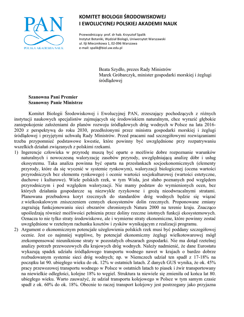 KOMITETBIOLOGIIŚRODOWISKOWEJ IEWOLUCYJNEJPOLSKIEJAKADEMIINAUK Przewodniczący:prof.drhab.KrzysztofSpalik InstytutBotaniki,WydziałBiologii,UniwersytetWarszawski ul.IljiMiecznikowa1,02-096Warszawa e-mail:[email protected] Beata Szydło, prezes Rady Ministrów Marek Gróbarczyk, minister gospodarki morskiej i żeglugi śródlądowej Szanowna Pani Premier Szanowny Panie Ministrze Komitet Biologii Środowiskowej i Ewolucyjnej PAN, zrzeszający pochodzących z różnych instytucji naukowych specjalistów zajmujących się środowiskiem naturalnym, chce wyrazić głębokie zaniepokojenie założeniami do planów rozwoju śródlądowych dróg wodnych w Polsce na lata 20162020 z perspektywą do roku 2030, przedłożonymi przez ministra gospodarki morskiej i żeglugi śródlądowej i przyjętymi uchwałą Rady Ministrów. Przed pracami nad szczegółowymi rozwiązaniami trzeba przypomnieć podstawowe kwestie, które powinny być uwzględnione przy rozpatrywaniu wszelkich działań związanych z polskimi rzekami. 1) Ingerencje człowieka w przyrodę muszą być oparte o możliwie dobre rozpoznanie warunków naturalnych i nowoczesną waloryzację zasobów przyrody, uwzględniającą analizę dóbr i usług ekosystemu. Taka analiza powinna być oparta na przesłankach socjoekonomicznych (elementy przyrody, które da się wycenić w systemie rynkowym), waloryzacji biologicznej (ocena wartości przyrodniczych bez elementu rynkowego) i ocenie wartości socjokulturowej (wartości estetyczne, duchowe i kulturowe). Wiele polskich rzek, w tym Wisła, jest słabo poznanych pod względem przyrodniczym i pod względem waloryzacji. Nie mamy podstaw do wymienionych ocen, bez których działania gospodarcze są niezwykle ryzykowne i grożą nieodwracalnymi stratami. Planowana przebudowa koryt rzecznych do standardów dróg wodnych będzie się wiązać z wielkoskalowym zniszczeniem cennych ekosystemów dolin rzecznych. Proponowane zmiany zagrażają funkcjonowaniu sieci obszarów chronionych Natura 2000 na terenie kraju. Znacząco upośledzają również możliwości pełnienia przez doliny rzeczne istotnych funkcji ekosystemowych. Oznacza to nie tylko straty środowiskowe, ale i wymierne straty ekonomiczne, które powinny zostać uwzględnione w rzetelnym rachunku kosztów i zysków wynikającym z realizacji programu. 2) Argument o ekonomicznym potencjale użeglowienia polskich rzek musi być poddany szczegółowej ocenie. Jest co najmniej wątpliwe, by potencjał ekonomiczny żeglugi wielkotowarowej mógł zrekompensować nieuniknione straty w pozostałych obszarach gospodarki. Nie ma dotąd rzetelnej analizy potrzeb przewozowych dla krajowych dróg wodnych. Należy nadmienić, że dane Eurostatu wykazują spadek udziału śródlądowego transportu wodnego nawet w krajach o bardzo dobrze rozbudowanym systemie sieci dróg wodnych; np. w Niemczech udział ten spadł z 17-18% na początku lat 90. ubiegłego wieku do ok. 12% w ostatnich latach. Z danych GUS wynika, że ok. 45% pracy przewozowej transportu wodnego w Polsce w ostatnich latach to piasek i żwir transportowany na niewielkie odległości, kolejne 18% to węgiel. Struktura ta niewiele się zmieniła od końca lat 80. ubiegłego wieku. Warto zauważyć, że udział transportu kolejowego w Polsce w tym samym czasie spadł z ok. 60% do ok. 18%. Obecnie to raczej transport kolejowy jest postrzegany jako przyjazna środowisku alternatywa dla transportu samochodowego. Dlaczego w takiej sytuacji mamy rozwijać – z ogromnymi kosztami środowiskowymi – transport wodny, zamiast rewitalizować transport kolejowy? 3) Komitet nie znajduje podstaw do twierdzenia, że proponowane działania gospodarcze mogą poprawić bezpieczeństwo powodziowe. Budowa kaskady zbiorników spotęguje ryzyko powodziowe i nie poprawi zaopatrzenia rolnictwa w wodę – to wymagałoby kosztownej infrastruktury, nieprzewidzianej w programie. W świetle współczesnej wiedzy, celów tych nie spełnia regulacja rzek, ale ich renaturalizacja, w tym usuwanie betonowych umocnień, budowa meandrów oraz tworzenie obsadzonych trzciną i krzewami zastoisk w celu zatrzymania wody jak najdłużej przed spłynięciem do morza. Takie działania nie tylko chronią przyległe okolice przed powodziami, ale utrzymują poziom wód gruntowych, poprawiają lokalny mikroklimat i podtrzymują różnorodność biologiczną. Jak najdłuższe zatrzymanie wody w rzece i naturalna filtracja przez żywe brzegi znacząco poprawia jakość wód. Renaturalizacja służy zarówno gospodarce, jak i przyrodzie. Warto również zauważyć, że wiele krajów podjęło tak poważne przedsięwzięcia, jak demontaż zapór, a badania wykazały, że takie działania przynoszą bardzo korzystne skutki przyrodnicze i gospodarcze (np. dla rybołówstwa). Komitet Biologii Środowiskowej i Ewolucyjnej Polskiej Akademii Nauk zwraca się zatem z prośbą o weryfikację planów rozwoju śródlądowych dróg wodnych w Polsce na lata 2016-2020 z perspektywą do roku 2030, a w szczególności o: a) rzetelną analizę kosztów rozwoju śródlądowych dróg wodnych, uwzględniającą koszty środowiskowe, oszacowane na podstawie waloryzacji zasobów przyrody oraz analizy dóbr i usług ekosystemowych; b) aktualizację danych o potrzebach przewozowych dla krajowych dróg wodnych oraz analizę ekonomicznej opłacalności rozwoju transportu wodnego w porównaniu z bardziej przyjaznym środowisku transportem kolejowym; c) zgodną z aktualnym stanem wiedzy analizę wpływu regulacji rzek na bilans wodny naszego kraju i na degradację ekosystemów rzecznych; d) ocenę związanego z planowanymi inwestycjami zagrożenia powodziowego. W imieniu Komitetu Biologii Środowiskowej i Ewolucyjnej PAN prof. dr hab. Krzysztof Spalik przewodniczący Komitetu Warszawa, dn. 17 października 2016 r. Do wiadomości: Prof. dr hab. Jan Szyszko, minister środowiska Przewodniczący i wiceprzewodniczący Sejmowej Komisji Ochrony Środowiska, Zasobów Naturalnych