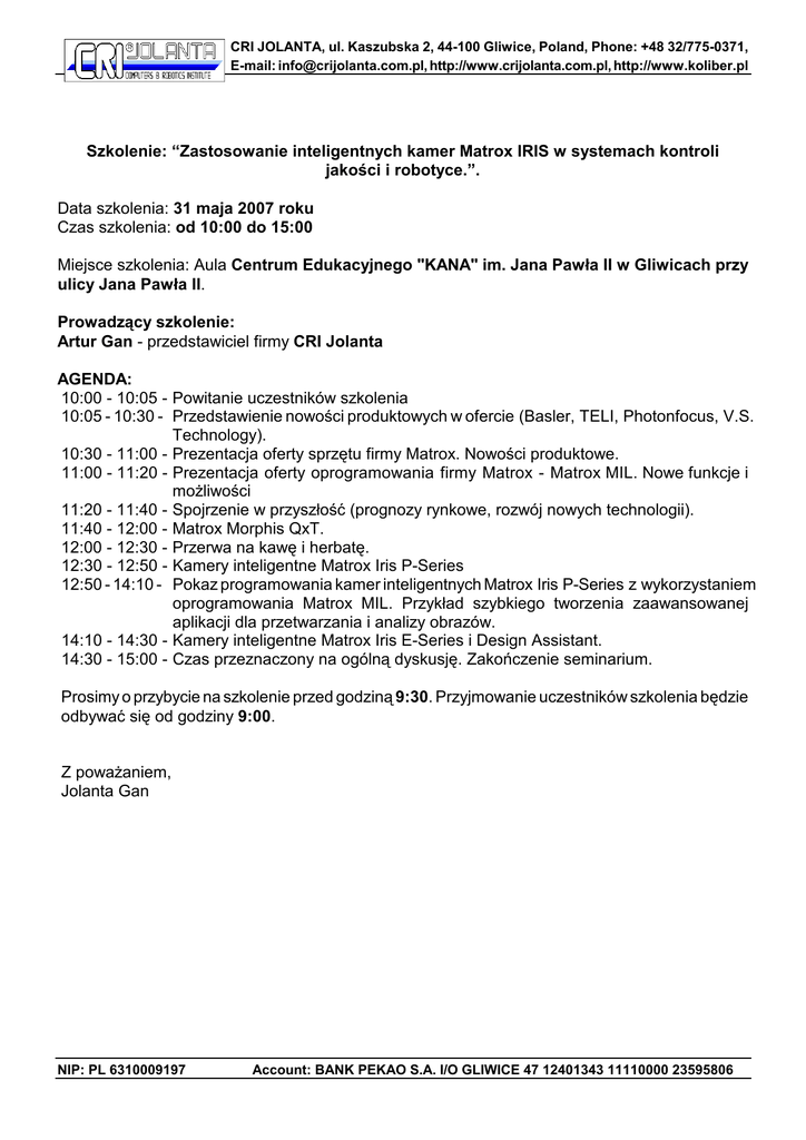 CRI JOLANTA, ul. Kaszubska 2, 44-100 Gliwice, Poland, Phone: +48 32/775-0371, E-mail: [email protected], http://www.crijolanta.com.pl, http://www.koliber.pl Szkolenie: “Zastosowanie inteligentnych kamer Matrox IRIS w systemach kontroli jakości i robotyce.”. Data szkolenia: 31 maja 2007 roku Czas szkolenia: od 10:00 do 15:00 Miejsce szkolenia: Aula Centrum Edukacyjnego "KANA" im. Jana Pawła II w Gliwicach przy ulicy Jana Pawła II. Prowadzący szkolenie: Artur Gan - przedstawiciel firmy CRI Jolanta AGENDA: 10:00 - 10:05 - Powitanie uczestników szkolenia 10:05 - 10:30 - Przedstawienie nowości produktowych w ofercie (Basler, TELI, Photonfocus, V.S. Technology). 10:30 - 11:00 - Prezentacja oferty sprzętu firmy Matrox. Nowości produktowe. 11:00 - 11:20 - Prezentacja oferty oprogramowania firmy Matrox - Matrox MIL. Nowe funkcje i moŜliwości 11:20 - 11:40 - Spojrzenie w przyszłość (prognozy rynkowe, rozwój nowych technologii). 11:40 - 12:00 - Matrox Morphis QxT. 12:00 - 12:30 - Przerwa na kawę i herbatę. 12:30 - 12:50 - Kamery inteligentne Matrox Iris P-Series 12:50 - 14:10 - Pokaz programowania kamer inteligentnych Matrox Iris P-Series z wykorzystaniem oprogramowania Matrox MIL. Przykład szybkiego tworzenia zaawansowanej aplikacji dla przetwarzania i analizy obrazów. 14:10 - 14:30 - Kamery inteligentne Matrox Iris E-Series i Design Assistant. 14:30 - 15:00 - Czas przeznaczony na ogólną dyskusję. Zakończenie seminarium. Prosimy o przybycie na szkolenie przed godziną 9:30. Przyjmowanie uczestników szkolenia będzie odbywać się od godziny 9:00. Z powaŜaniem, Jolanta Gan NIP: PL 6310009197 Account: BANK PEKAO S.A. I/O GLIWICE 47 12401343 11110000 23595806
