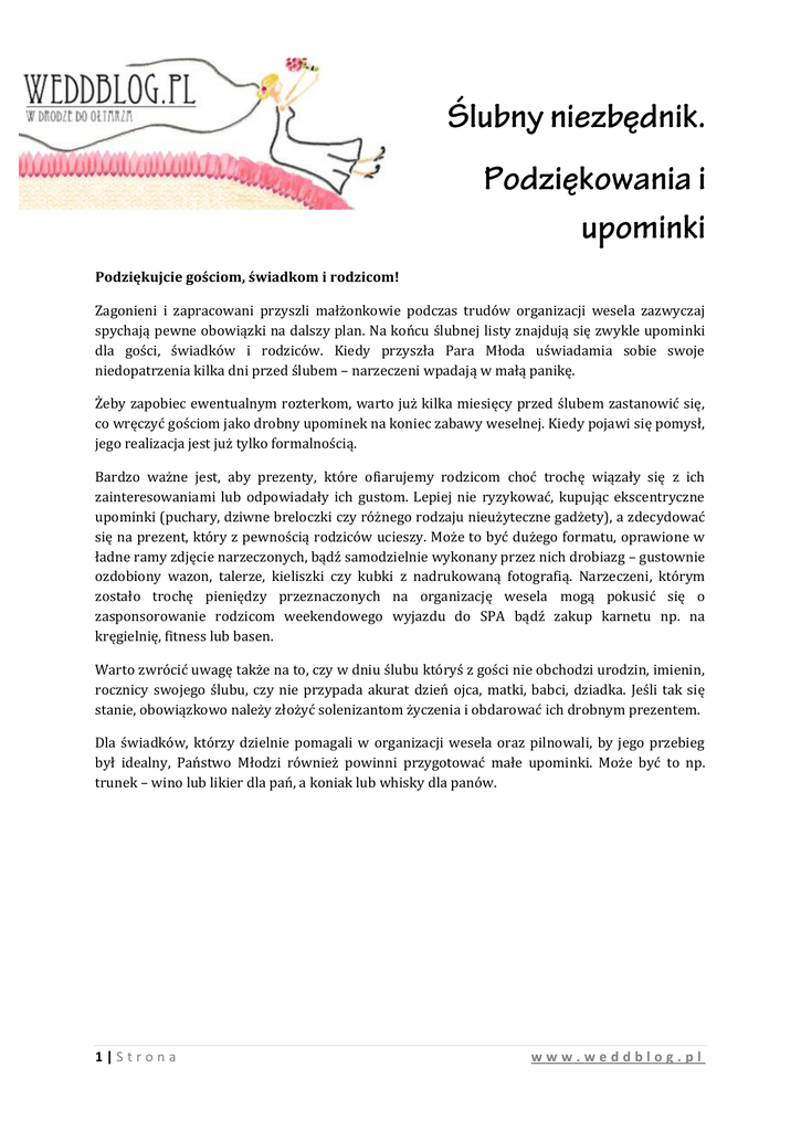 Podziękujcie gościom, świadkom i rodzicom! Zagonieni i zapracowani przyszli małżonkowie podczas trudów organizacji wesela zazwyczaj spychają pewne obowiązki na dalszy plan. Na końcu ślubnej listy znajdują się zwykle upominki dla gości, świadków i rodziców. Kiedy przyszła Para Młoda uświadamia sobie swoje niedopatrzenia kilka dni przed ślubem – narzeczeni wpadają w małą panikę. Żeby zapobiec ewentualnym rozterkom, warto już kilka miesięcy przed ślubem zastanowić się, co wręczyć gościom jako drobny upominek na koniec zabawy weselnej. Kiedy pojawi się pomysł, jego realizacja jest już tylko formalnością. Bardzo ważne jest, aby prezenty, które ofiarujemy rodzicom choć trochę wiązały się z ich zainteresowaniami lub odpowiadały ich gustom. Lepiej nie ryzykować, kupując ekscentryczne upominki (puchary, dziwne breloczki czy różnego rodzaju nieużyteczne gadżety), a zdecydować się na prezent, który z pewnością rodziców ucieszy. Może to być dużego formatu, oprawione w ładne ramy zdjęcie narzeczonych, bądź samodzielnie wykonany przez nich drobiazg – gustownie ozdobiony wazon, talerze, kieliszki czy kubki z nadrukowaną fotografią. Narzeczeni, którym zostało trochę pieniędzy przeznaczonych na organizację wesela mogą pokusić się o zasponsorowanie rodzicom weekendowego wyjazdu do SPA bądź zakup karnetu np. na kręgielnię, fitness lub basen. Warto zwrócić uwagę także na to, czy w dniu ślubu któryś z gości nie obchodzi urodzin, imienin, rocznicy swojego ślubu, czy nie przypada akurat dzień ojca, matki, babci, dziadka. Jeśli tak się stanie, obowiązkowo należy złożyć solenizantom życzenia i obdarować ich drobnym prezentem. Dla świadków, którzy dzielnie pomagali w organizacji wesela oraz pilnowali, by jego przebieg był idealny, Państwo Młodzi również powinni przygotować małe upominki. Może być to np. trunek – wino lub likier dla pań, a koniak lub whisky dla panów. 1|Strona www.weddblog.pl Prezenty dla rodziców Panny Młodej: RODZICE PANNY MŁODEJ Rodzic Opis Firma/ Czas oczekiwania prezentu sklep na zamówienie Cena Mama Tata Prezenty dla rodziców Pana Młodego*: RODZICE PANA MŁODEGO Rodzic Opis Firma/ Czas oczekiwania prezentu sklep na zamówienie Cena Mama Tata *Wypełnić, jeśli prezenty dla rodziców Panny Młodej różnią się od prezentów dla rodziców Pana Młodego. Lepszym rozwiązaniem jest dać rodzicom Panny i Pana Młodego takie same prezenty. Prezenty dla świadków: ŚWIADKOWE I ŚWIADKOWIE Osoba Opis Firma/ Czas oczekiwania prezentu sklep na zamówienie Cena Świadkowe Świadkowie 2|Strona www.weddblog.pl Prezenty dla gości: GOŚCIE Osoba Opis Firma/ prezentu sklep Czas oczekiwania na Liczba sztuk Cena zamówienie Kobiety Mężczyźni Dzieci Prezenty dla solenizantów: GOŚCIE Imię i nazwisko Jubileusz Opis Firma/ prezentu sklep Czas oczekiwania na zamówienie Liczba sztuk Cena Całkowity koszt: ……………………………………………………………………………………………………………………… Nie zapomnijcie zabrać podarunków ze sobą do lokalu weselnego! 3|Strona www.weddblog.pl