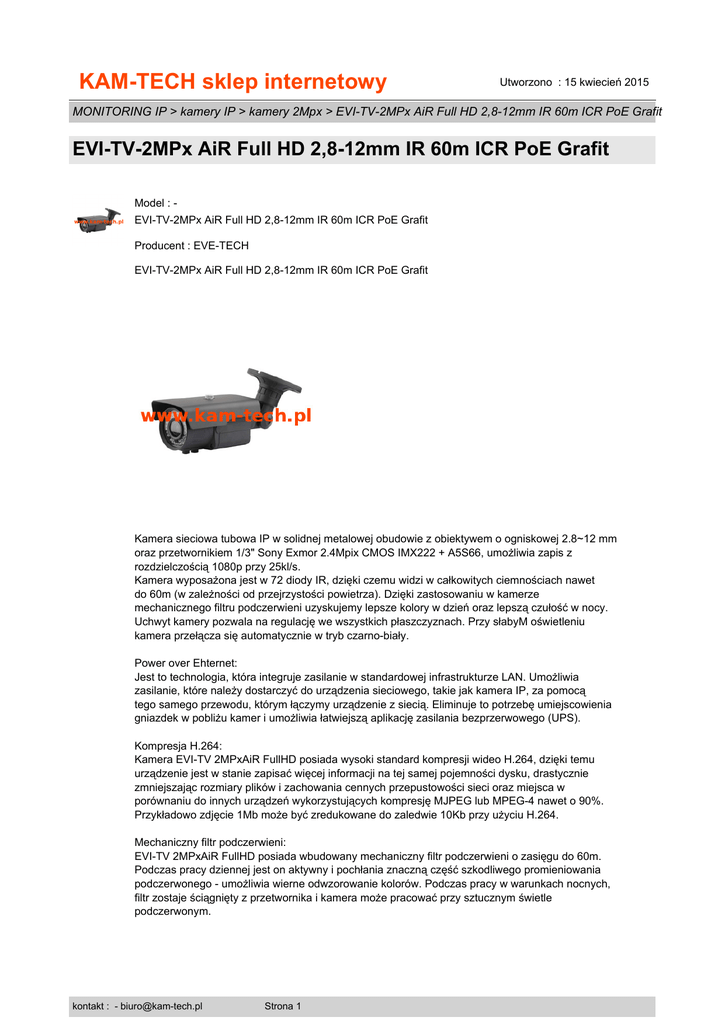 KAM-TECH sklep internetowy Utworzono : 15 kwiecień 2015 MONITORING IP > kamery IP > kamery 2Mpx > EVI-TV-2MPx AiR Full HD 2,8-12mm IR 60m ICR PoE Grafit EVI-TV-2MPx AiR Full HD 2,8-12mm IR 60m ICR PoE Grafit Model : EVI-TV-2MPx AiR Full HD 2,8-12mm IR 60m ICR PoE Grafit Producent : EVE-TECH EVI-TV-2MPx AiR Full HD 2,8-12mm IR 60m ICR PoE Grafit Kamera sieciowa tubowa IP w solidnej metalowej obudowie z obiektywem o ogniskowej 2.8~12 mm oraz przetwornikiem 1/3" Sony Exmor 2.4Mpix CMOS IMX222 + A5S66, umożliwia zapis z rozdzielczością 1080p przy 25kl/s. Kamera wyposażona jest w 72 diody IR, dzięki czemu widzi w całkowitych ciemnościach nawet do 60m (w zależności od przejrzystości powietrza). Dzięki zastosowaniu w kamerze mechanicznego filtru podczerwieni uzyskujemy lepsze kolory w dzień oraz lepszą czułość w nocy. Uchwyt kamery pozwala na regulację we wszystkich płaszczyznach. Przy słabyM oświetleniu kamera przełącza się automatycznie w tryb czarno-biały. Power over Ehternet: Jest to technologia, która integruje zasilanie w standardowej infrastrukturze LAN. Umożliwia zasilanie, które należy dostarczyć do urządzenia sieciowego, takie jak kamera IP, za pomocą tego samego przewodu, którym łączymy urządzenie z siecią. Eliminuje to potrzebę umiejscowienia gniazdek w pobliżu kamer i umożliwia łatwiejszą aplikację zasilania bezprzerwowego (UPS). Kompresja H.264: Kamera EVI-TV 2MPxAiR FullHD posiada wysoki standard kompresji wideo H.264, dzięki temu urządzenie jest w stanie zapisać więcej informacji na tej samej pojemności dysku, drastycznie zmniejszając rozmiary plików i zachowania cennych przepustowości sieci oraz miejsca w porównaniu do innych urządzeń wykorzystujących kompresję MJPEG lub MPEG-4 nawet o 90%. Przykładowo zdjęcie 1Mb może być zredukowane do zaledwie 10Kb przy użyciu H.264. Mechaniczny filtr podczerwieni: EVI-TV 2MPxAiR FullHD posiada wbudowany mechaniczny filtr podczerwieni o zasięgu do 60m. Podczas pracy dziennej jest on aktywny i pochłania znaczną część szkodliwego promieniowania podczerwonego - umożliwia wierne odwzorowanie kolorów. Podczas pracy w warunkach nocnych, filtr zostaje ściągnięty z przetwornika i kamera może pracować przy sztucznym świetle podczerwonym. kontakt : - [email protected] Strona 1 KAM-TECH sklep internetowy Utworzono : 15 kwiecień 2015 MONITORING IP > kamery IP > kamery 2Mpx > EVI-TV-2MPx AiR Full HD 2,8-12mm IR 60m ICR PoE Grafit EVI-TV-2MPx AiR Full HD 2,8-12mm IR 60m ICR PoE Grafit Model EVI-TV 2MPxAiR FullHD Producent EVE-TECH Obsługiwane rozdzielczości: � 1920 x 1080 � 1280 x 720 � D1 Czułość >0.1Lux Obiektyw 3 Mpx HD 2.8~12 mm Manual Zoom Lens Kompresja H.264/JPEG Obsługiwane protokoły RTSP/FTP/DDNS/NTP/SMTP Dzień/Noc Mechaniczny filtr podczerwieni (IRC) Szybkość nagrywania 25 kl/s PoE 48V 802.3aaf Pobór mocy 12W Zasięg IR 60m kontakt : - [email protected] Strona 2 KAM-TECH sklep internetowy Utworzono : 15 kwiecień 2015 MONITORING IP > kamery IP > kamery 2Mpx > EVI-TV-2MPx AiR Full HD 2,8-12mm IR 60m ICR PoE Grafit EVI-TV-2MPx AiR Full HD 2,8-12mm IR 60m ICR PoE Grafit Interfejs sieciowy 10/100M RJ-45 Onvif Onvif 2.0 (port: 8999) Dostęp za pomocą przeglądarki internetowej Internet Explorer (IE), Mozilla Firefox, Google Chrome Dostęp z telefonu komórkowego Dostępne aplikacje do telefonów z systemami: android, windows mobile, blackberry, iPhone, symbian Wybrane funkcje � Obsługuje połączenie z NVR � podgląd i zarządzanie przez przeglądarki internetowe: Internet Explorer, Mozilla Firefox, Google Chrome � Mechaniczny filtr podczerwieni (IRC) � Klasa szczelności IP66 � Kompresja wideo H.264 � PoE Opóźnienie Lan 0,3s Oświetlacz IR IR LED: 5x72szt Tryb ostrości Ręczny Temperatura pracy -20 st. C ~ 60 st. C Zasilanie � 12V 1A � PoE 48V 802.3aaf kontakt : - [email protected] Strona 3 KAM-TECH sklep internetowy Utworzono : 15 kwiecień 2015 MONITORING IP > kamery IP > kamery 2Mpx > EVI-TV-2MPx AiR Full HD 2,8-12mm IR 60m ICR PoE Grafit EVI-TV-2MPx AiR Full HD 2,8-12mm IR 60m ICR PoE Grafit Wymiary 120 x 84.5mm Waga 1000g Wilgotność 0% ~ 90%RH Cena : 699,00 zł Brutto ( 568,29 zł Netto) Dostępność: Produkt dostępny w naszym sklepie od 15 kwiecień 2015 kontakt : - [email protected] Strona 4