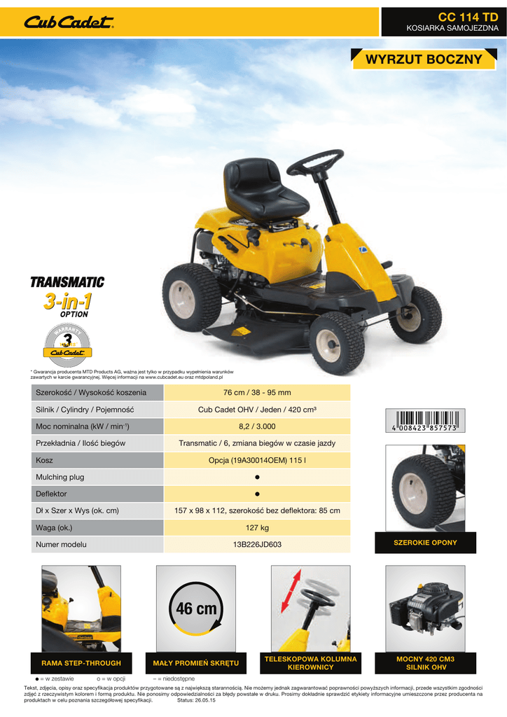 CC 114 TD KOSIARKA SAMOJEZDNA *Manufacturin g gu ara nty of MT D ary performanc lement e, va lid o supp nly ited lim thr G, ou gh sA ct re du * det.eu c.cubca ://b2 ttps nh no tio ra st gi Pr o WYRZUT BOCZNY * Gwarancja producenta MTD Products AG, ważna jest tylko w przypadku wypełnienia warunków zawartych w karcie gwarancyjnej. Więcej informacji na www.cubcadet.eu oraz mtdpoland.pl Szerokość / Wysokość koszenia 76 cm / 38 - 95 mm Silnik / Cylindry / Pojemność Cub Cadet OHV / Jeden / 420 cm³ Moc nominalna (kW / min-1) 8,2 / 3.000 Przekładnia / Ilość biegów Transmatic / 6, zmiana biegów w czasie jazdy Kosz Opcja (19A30014OEM) 115 l Mulching plug Deflektor Dł x Szer x Wys (ok. cm) 157 x 98 x 112, szerokość bez deflektora: 85 cm Waga (ok.) 127 kg Numer modelu 13B226JD603 RAMA STEP-THROUGH MAŁY PROMIEŃ SKRĘTU = w zestawie – = niedostępne o = w opcji TELESKOPOWA KOLUMNA KIEROWNICY SZEROKIE OPONY MOCNY 420 CM3 SILNIK OHV Tekst, zdjęcia, opisy oraz specyfikacja produktów przygotowane są z największą starannością. Nie możemy jednak zagwarantować poprawności powyższych informacji, przede wszystkim zgodności zdjęć z rzeczywistym kolorem i formą produktu. Nie ponosimy odpowiedzialności za błędy powstałe w druku. Prosimy dokładnie sprawdzić etykiety informacyjne umieszczone przez producenta na produktach w celu poznania szczegółowej specyfikacji. Status: 26.05.15