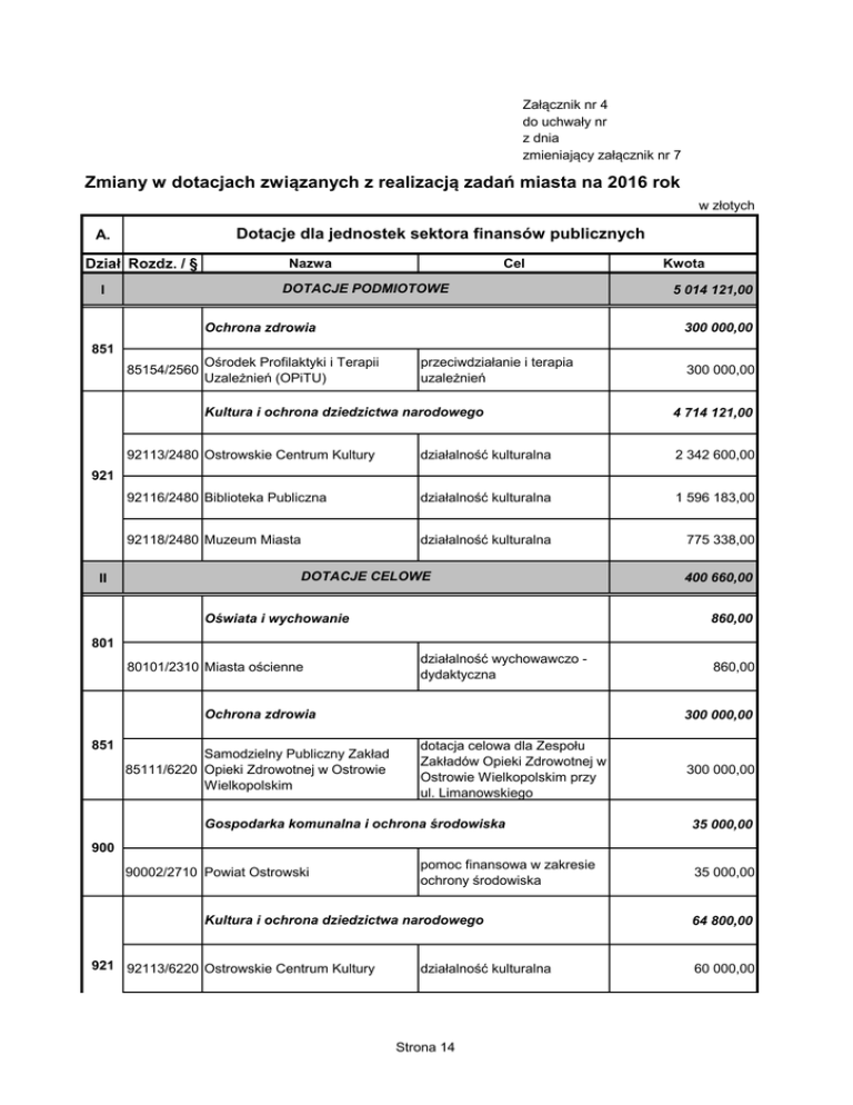 Załącznik nr 4 do uchwały nr z dnia zmieniający załącznik nr 7 Zmiany w dotacjach związanych z realizacją zadań miasta na 2016 rok w złotych Dotacje dla jednostek sektora finansów publicznych A. Dział Rozdz. / § Nazwa Cel DOTACJE PODMIOTOWE I Ochrona zdrowia Kwota 5 014 121,00 300 000,00 851 85154/2560 Ośrodek Profilaktyki i Terapii Uzależnień (OPiTU) przeciwdziałanie i terapia uzależnień Kultura i ochrona dziedzictwa narodowego 300 000,00 4 714 121,00 92113/2480 Ostrowskie Centrum Kultury działalność kulturalna 2 342 600,00 92116/2480 Biblioteka Publiczna działalność kulturalna 1 596 183,00 92118/2480 Muzeum Miasta działalność kulturalna 775 338,00 921 II DOTACJE CELOWE 400 660,00 860,00 Oświata i wychowanie 801 80101/2310 Miasta ościenne działalność wychowawczo dydaktyczna Ochrona zdrowia 851 Samodzielny Publiczny Zakład 85111/6220 Opieki Zdrowotnej w Ostrowie Wielkopolskim 860,00 300 000,00 dotacja celowa dla Zespołu Zakładów Opieki Zdrowotnej w Ostrowie Wielkopolskim przy ul. Limanowskiego Gospodarka komunalna i ochrona środowiska 300 000,00 35 000,00 900 90002/2710 Powiat Ostrowski pomoc finansowa w zakresie ochrony środowiska Kultura i ochrona dziedzictwa narodowego 921 92113/6220 Ostrowskie Centrum Kultury działalność kulturalna Strona 14 35 000,00 64 800,00 60 000,00 Dział Rozdz. / § Nazwa Cel 92118/6220 Muzeum Miasta działalność kulturalna RAZEM I + II 4 800,00 5 414 781,00 Dotacje dla jednostek spoza sektora finansów publicznych B. DOTACJE PODMIOTOWE I 80101/2590 80101/2590 80101/2590 80101/2590 80103/2590 80104/2540 80104/2540 80104/2540 80104/2540 80104/2540 80104/2540 80104/2540 80104/2590 80104/2590 80110/2590 80110/2590 80110/2590 80110/2590 80149/2540 80149/2540 80149/2540 16 951 774,00 16 951 774,00 Oświata i wychowanie 801 Kwota Publiczna Szkoła Podstawowa Sióstr Salezjanek Publiczna Szkoła Podstawowa Spółdzielni Oświatowej Edukator Polsko - Kanadyjska Szkoła Podstawowa im. A. Bella Szkoła Podstawowa dla klas I - III "Mądra Sowa" Polsko - Kanadyjska Szkoła Podstawowa im. A. Bella Niepubliczne Przedszkole Ogólnodostępne im. s. Włodzimiry Wojtczak Niepubliczny Punkt Przedszkolny "Smerfiki" działalność wychowawczo dydaktyczna działalność wychowawczo dydaktyczna działalność wychowawczo dydaktyczna działalność wychowawczo dydaktyczna działalność wychowawczo dydaktyczna działalność wychowawczo dydaktyczna działalność wychowawczo dydaktyczna działalność wychowawczo Niepubliczne Przedszkole "Maja" dydaktyczna Niepubliczne Przedszkole "Nasz działalność wychowawczo Domek" dydaktyczna Niepubliczne Przedszkole "Sowy i działalność wychowawczo Sówki" dydaktyczna Niepubliczny Punkt Przedszkolny działalność wychowawczo "Przyjaciele" dydaktyczna Niepubliczny Punkt Przedszkolny działalność wychowawczo "Wojtuś" dydaktyczna Publiczne Przedszkole Sióstr działalność wychowawczo Salezjanek dydaktyczna Publiczne Przedszkole nr 1 działalność wychowawczo Osiedlowego Stowarzyszenia dydaktyczna "Krępianie" Publiczne Gimnazjum Sióstr działalność wychowawczo Salezjanek dydaktyczna Polsko - Kanadyjskie Gimnazjum działalność wychowawczo im. A. Bella dydaktyczna działalność wychowawczo Gimnazjum dla Dorosłych "Żak" dydaktyczna Publiczne Gimnazjum im. Papieża działalność wychowawczo Jana Pawła II dydaktyczna działalność wychowawczo Niepubliczne Przedszkole "Maja" dydaktyczna Niepubliczny Punkt Przedszkolny działalność wychowawczo "Smerfiki" dydaktyczna Niepubliczne Przedszkole "Nasz działalność wychowawczo Domek" dydaktyczna Strona 15 3 459 536,00 2 396 073,00 439 120,00 91 044,00 40 746,00 302 533,00 74 470,00 308 464,00 312 856,00 436 346,00 71 367,00 71 367,00 465 435,00 1 099 191,00 1 830 462,00 344 357,00 0,00 4 583 657,00 219 582,00 20 913,00 203 883,00 Dział Rozdz. / § Nazwa Cel Niepubliczne Przedszkole 80149/2540 "Ogólnodostępne im. s. Włodzimiry Wojtczak" działalność wychowawczo dydaktyczna 117 634,00 Publiczne Przedszkole nr 1 80149/2590 Osiedlowego Stowarzyszenia "Krępianie" działalność wychowawczo dydaktyczna 62 738,00 DOTACJE CELOWE II Transport i łączność 600 60016/6300 Gmina Ostrów Wielkopolski 6 297 539,80 400 000,00 pomoc finansowa w formie dotacji celowej w zakresie infrastruktury drogowej Bezpieczeństwo publiczne i ochrona przeciwpożarowa dofinansowanie zakupu Komenda Powiatowa Państwowej sprzętu i urządzeń do 754 75411/6170 Straży Pożarnej w Ostrowie prowadzenia działań Wielkopolskim ratowniczych Ochotnicza Straż Pożarna w zakup samochodu ratowniczo 75412/6230 Ostrowie Wielkopolskim ul. gaśniczego Staszica 1 Ochotnicza Straż Pożarna w Zakup umundurowania 75412/2820 Ostrowie Wielkopolskim ul. bojowego oraz wyposażenia Staszica 1 strażaka Oświata i wychowanie 400 000,00 116 760,00 20 000,00 95 000,00 1 760,00 161 051,80 sfinansowanie kosztu zakupu podręczników, materiałów edukacyjnych lub materiałów ćwiczeniowych sfinansowanie kosztu zakupu Publiczna Szkoła Podstawowa podręczników, materiałów Spółdzielni Oświatowej Edukator edukacyjnych lub materiałów ćwiczeniowych sfinansowanie kosztu zakupu Polsko - Kanadyjska Szkoła podręczników, materiałów Podstawowa im. A. Bella edukacyjnych lub materiałów ćwiczeniowych sfinansowanie kosztu zakupu Szkoła Podstawowa dla klas I - III podręczników, materiałów "Mądra Sowa" edukacyjnych lub materiałów ćwiczeniowych sfinansowanie kosztu zakupu Publiczne Gimnazjum im. Papieża podręczników, materiałów Jana Pawła II edukacyjnych lub materiałów ćwiczeniowych sfinansowanie kosztu zakupu Publiczne Gimnazjum Sióstr podręczników, materiałów Salezjanek edukacyjnych lub materiałów ćwiczeniowych Publiczna Szkoła Podstawowa 80101/2830 Sióstr Salezjanek 30 279,99 80101/2830 25 374,42 80101/2830 801 Kwota 80101/2830 80110/2830 80110/2830 Strona 16 4 509,57 618,75 64 230,63 27 301,11 Dział Rozdz. / § Nazwa Cel sfinansowanie kosztu zakupu podręczn