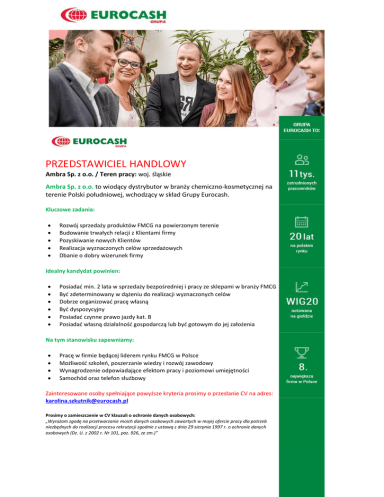 PRZEDSTAWICIEL HANDLOWY Ambra Sp. z o.o. / Teren pracy: woj. śląskie Ambra Sp. z o.o. to wiodący dystrybutor w branży chemiczno-kosmetycznej na terenie Polski południowej, wchodzący w skład Grupy Eurocash. Kluczowe zadania: Rozwój sprzedaży produktów FMCG na powierzonym terenie Budowanie trwałych relacji z Klientami firmy Pozyskiwanie nowych Klientów Realizacja wyznaczonych celów sprzedażowych Dbanie o dobry wizerunek firmy Idealny kandydat powinien: Posiadać min. 2 lata w sprzedaży bezpośredniej i pracy ze sklepami w branży FMCG Być zdeterminowany w dążeniu do realizacji wyznaczonych celów Dobrze organizować pracę własną Być dyspozycyjny Posiadać czynne prawo jazdy kat. B Posiadać własną działalność gospodarczą lub być gotowym do jej założenia Na tym stanowisku zapewniamy: Pracę w firmie będącej liderem rynku FMCG w Polsce Możliwość szkoleń, poszerzanie wiedzy i rozwój zawodowy Wynagrodzenie odpowiadające efektom pracy i poziomowi umiejętności Samochód oraz telefon służbowy Zainteresowane osoby spełniające powyższe kryteria prosimy o przesłanie CV na adres: [email protected] Prosimy o zamieszczenie w CV klauzuli o ochronie danych osobowych: „Wyrażam zgodę na przetwarzanie moich danych osobowych zawartych w mojej ofercie pracy dla potrzeb niezbędnych do realizacji procesu rekrutacji zgodnie z ustawą z dnia 29 sierpnia 1997 r. o ochronie danych osobowych (Dz. U. z 2002 r. Nr 101, poz. 926, ze zm.)”